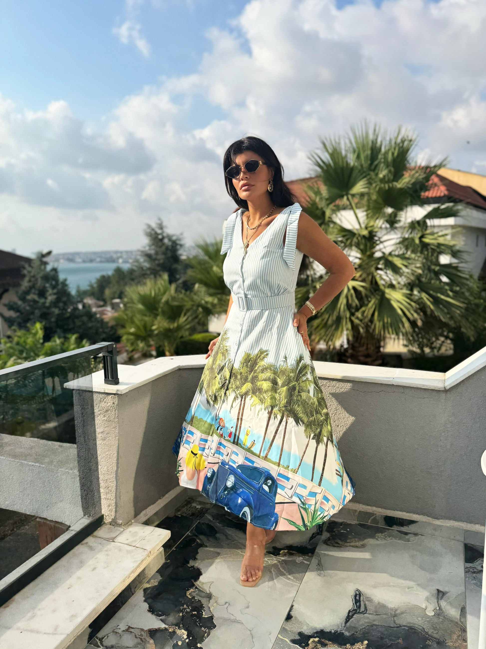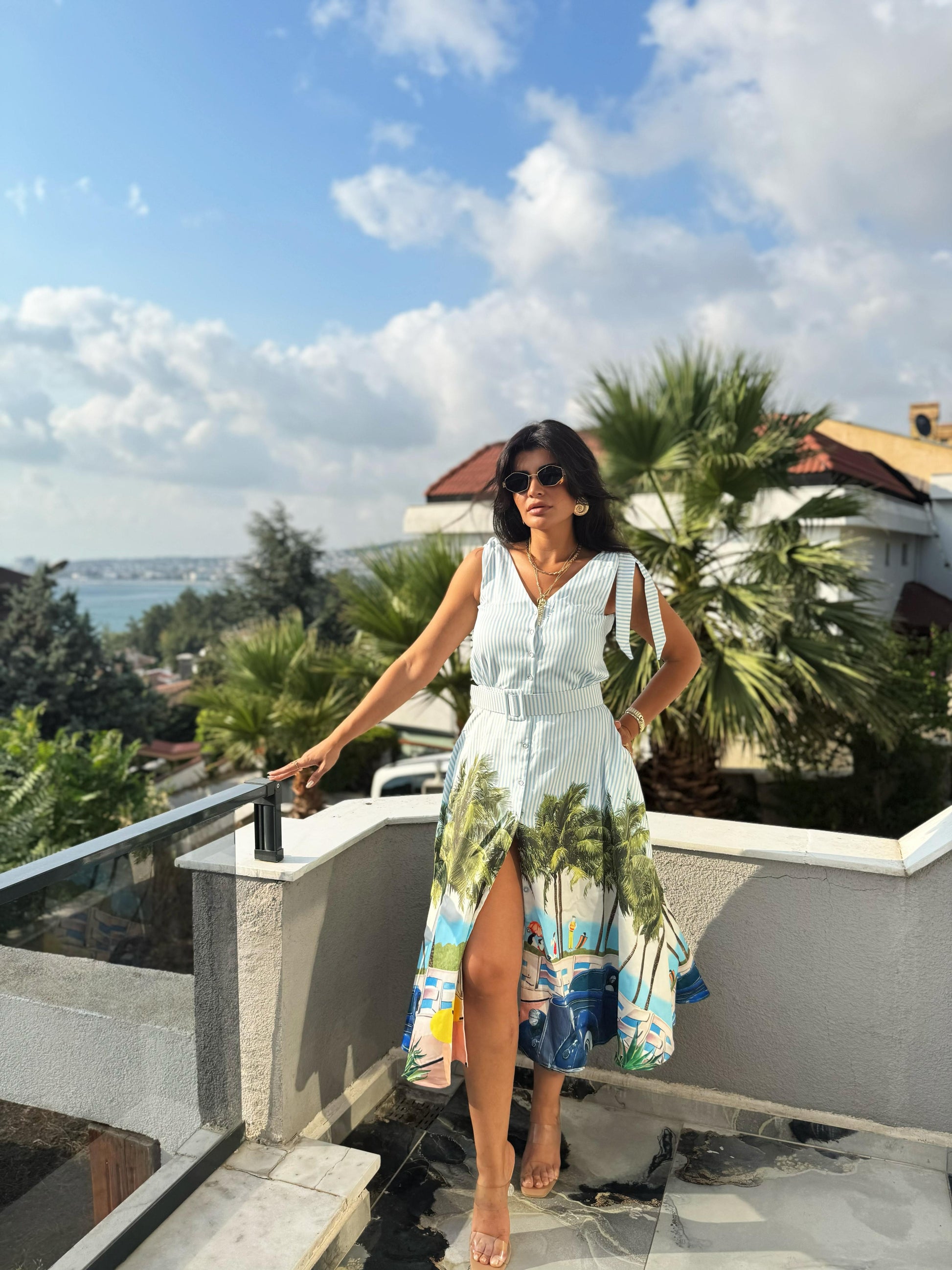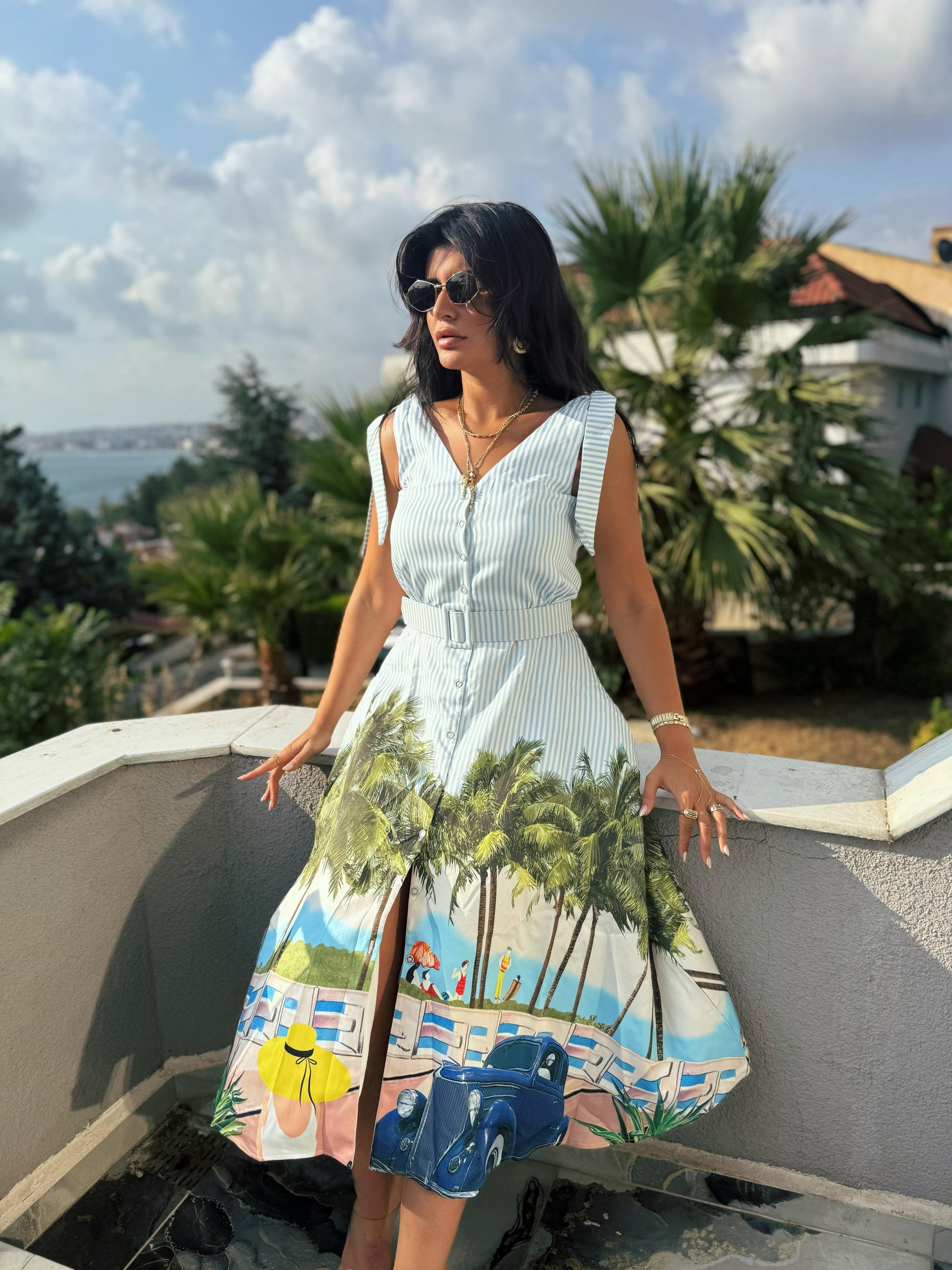 Palmiye Baskılı Mavi Çizgili Kemer Detaylı Cepli Premium Elbise | Beyaz