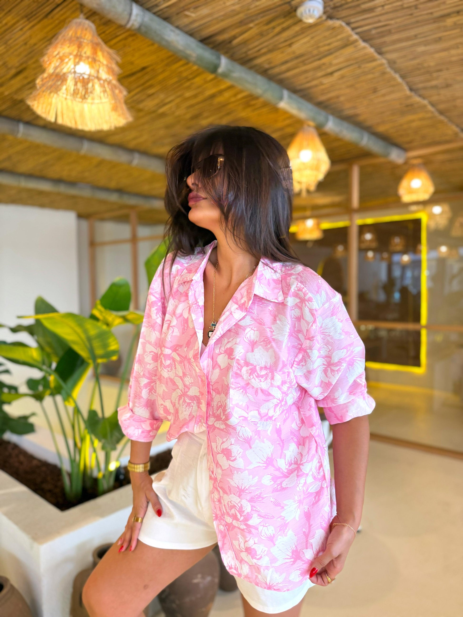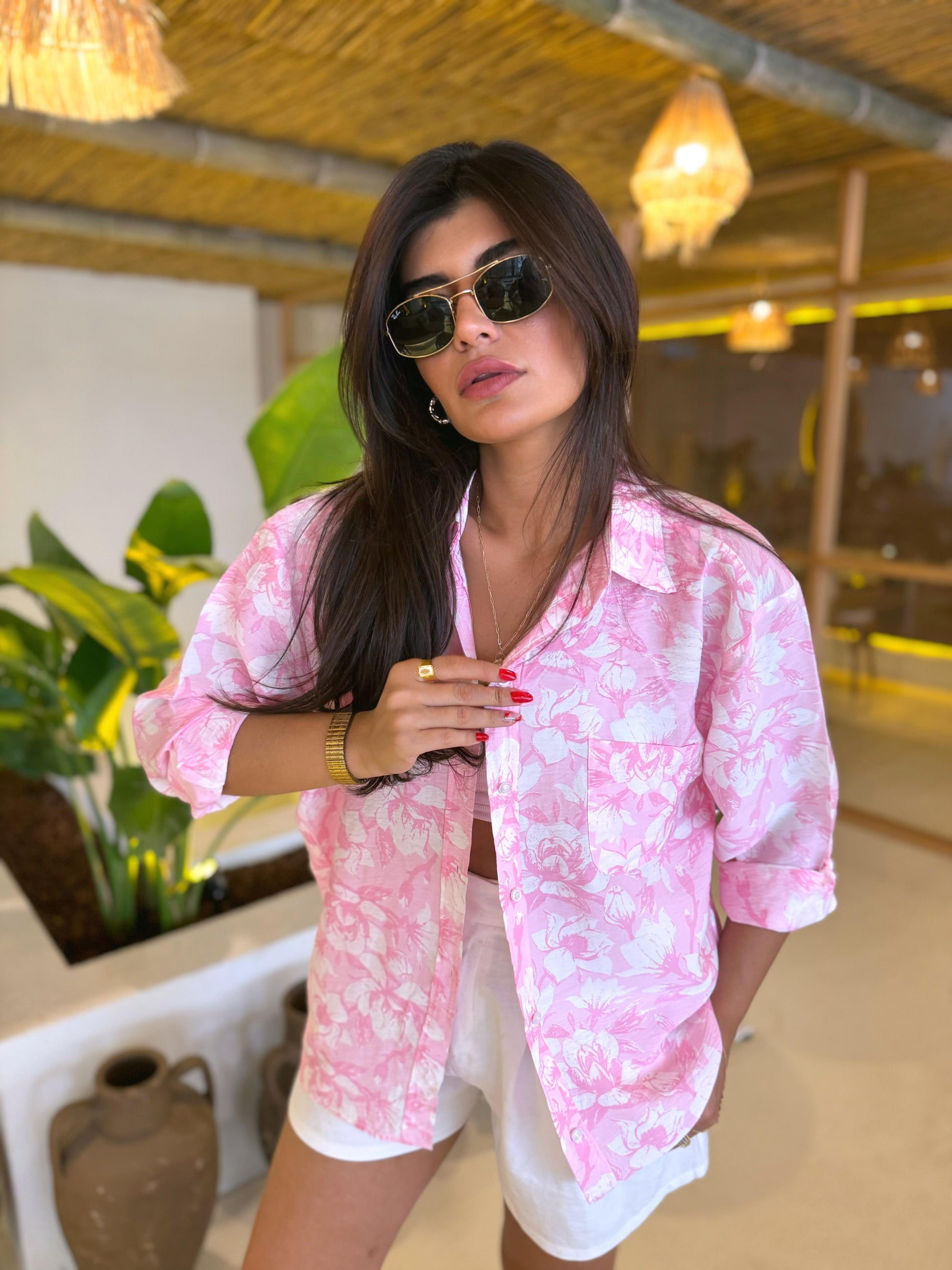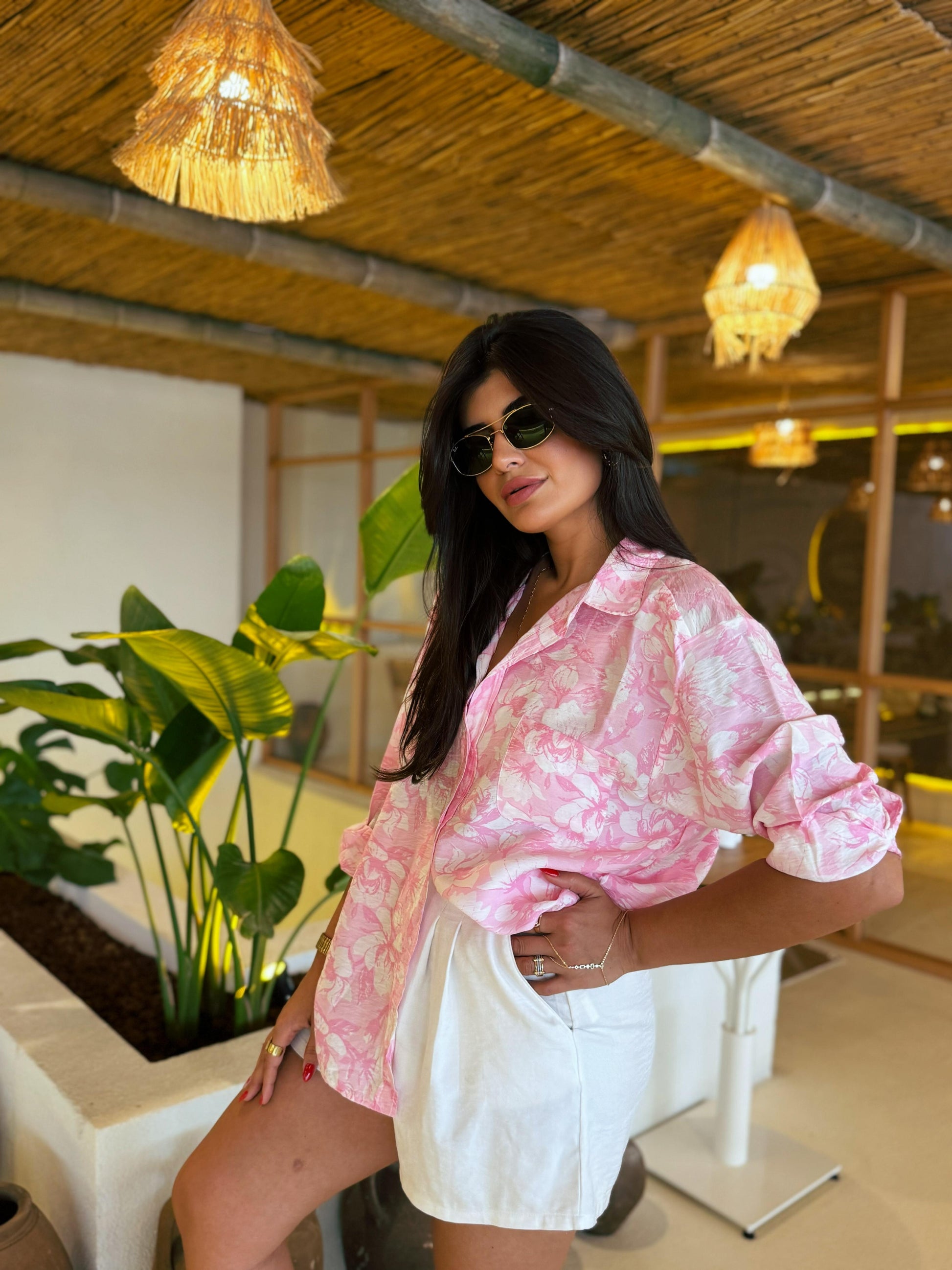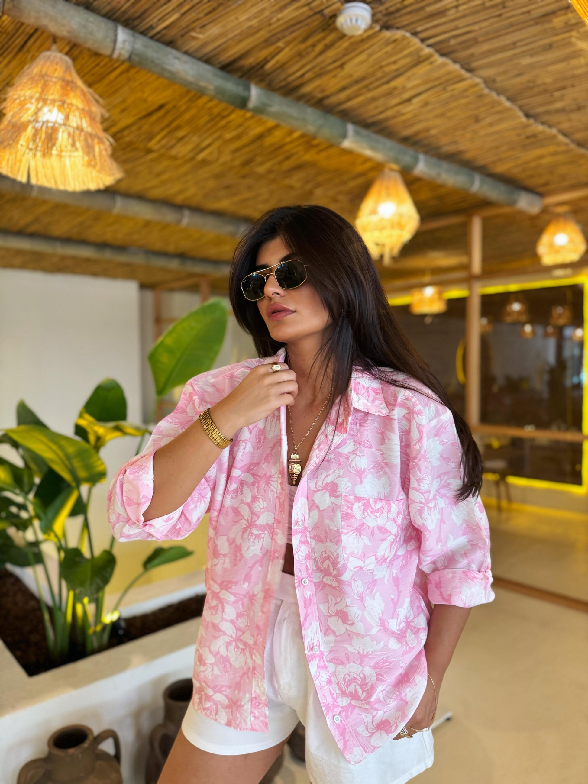 Yazın en romantik tonu pembeyle çiçek desenlerini buluşturan bu tensel gömlek, sıcak havalarda hem şıklığı hem ferahlığı bir arada sunuyor. Oversize yapısıyla rahatlığı ön planda tutarken, enerjik deseniyle tüm dikkatleri üzerine çeker.