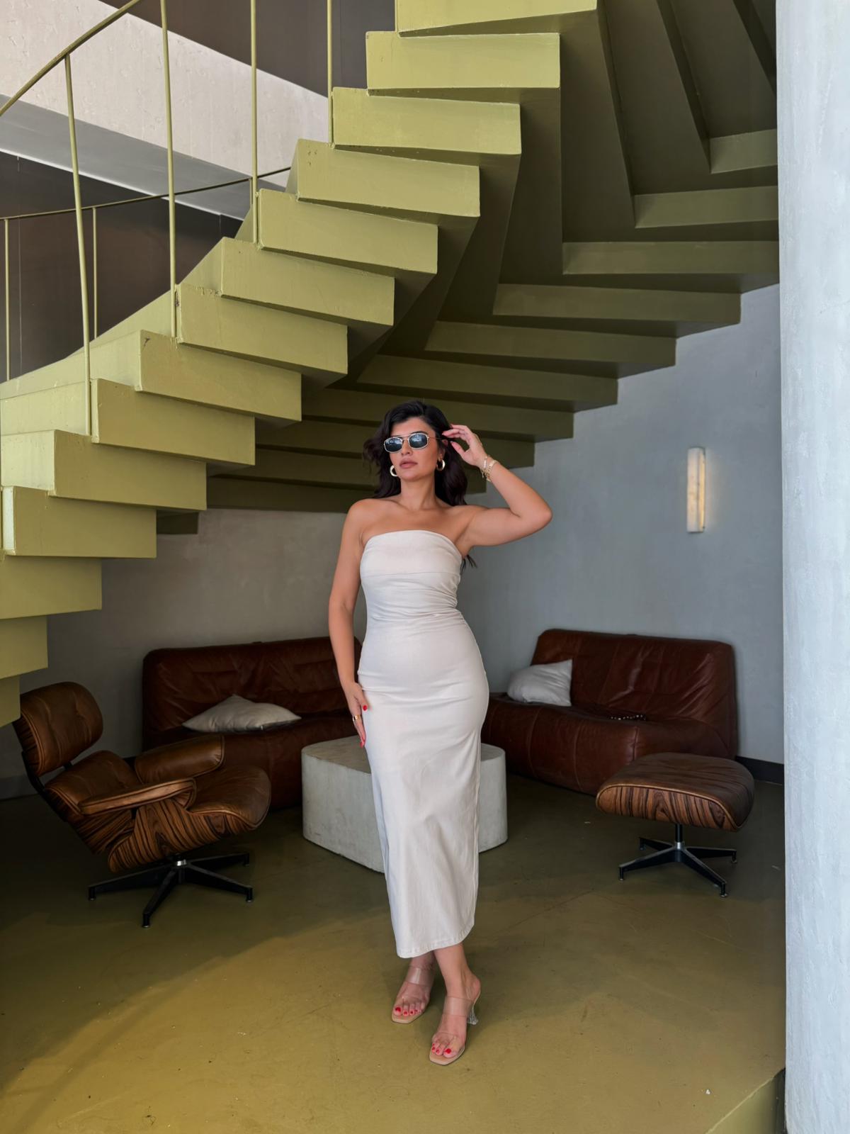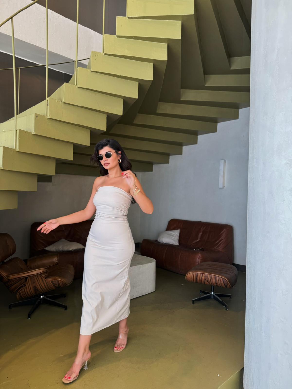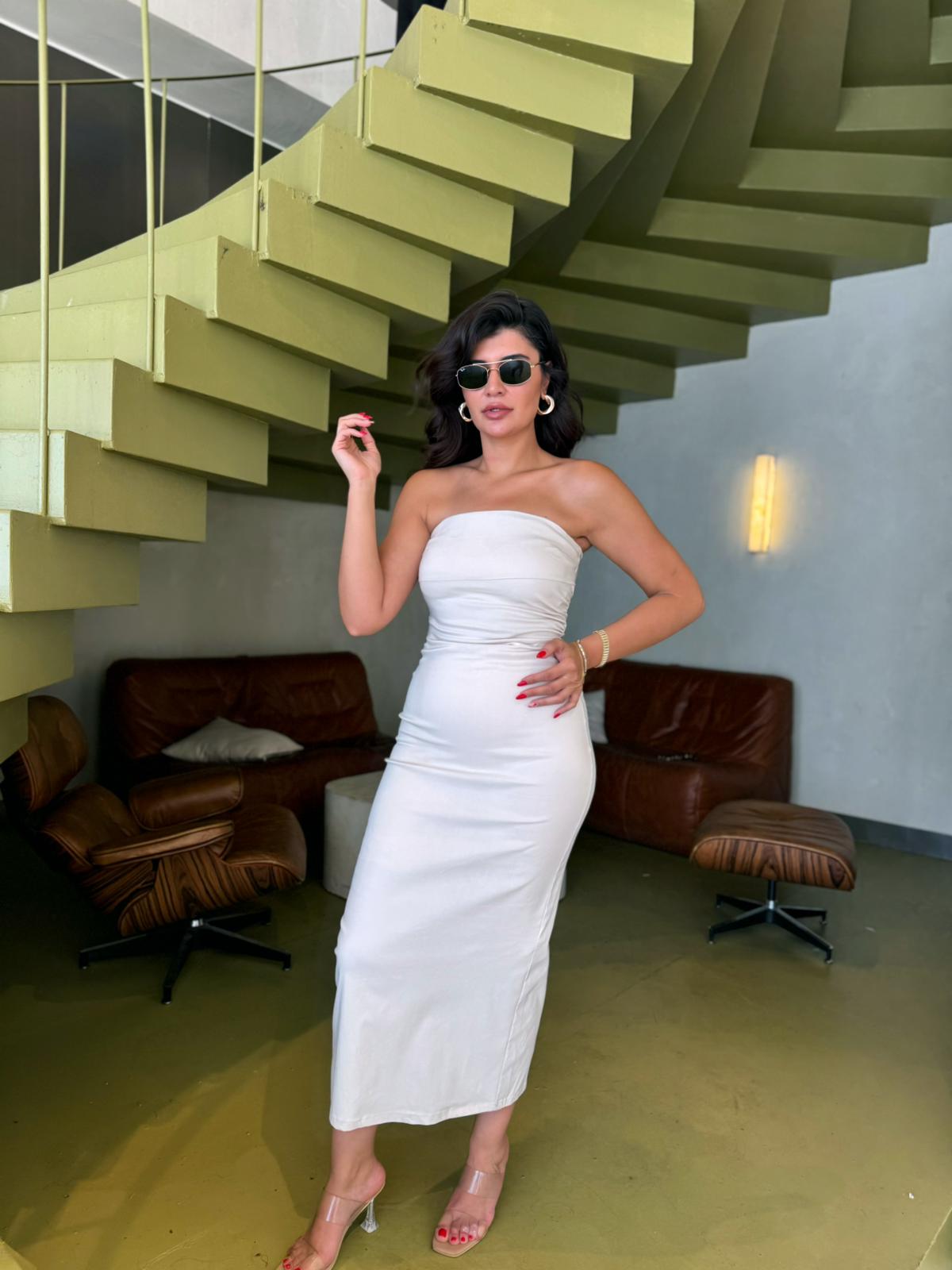 Minimalist tasarımıyla göz kamaştıran bu beyaz elbise, elegan duruşu ve modern çizgileriyle stilini yansıtmak isteyen kadınların favorisi. Straplez kesimi ve yırtmaç detayıyla feminen bir dokunuş sunar.