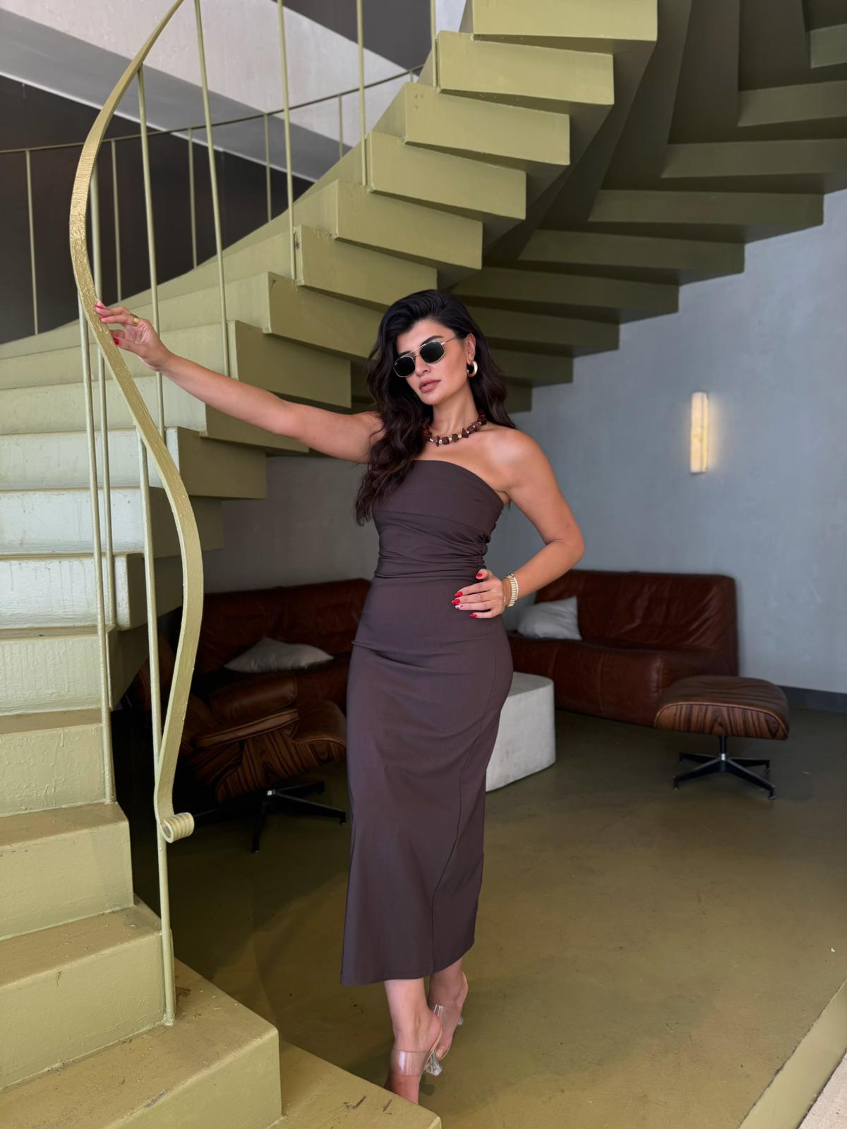 🤎 Zamana Meydan Okuyan Şıklık: Dilvin Kahverengi Straplez Elbise