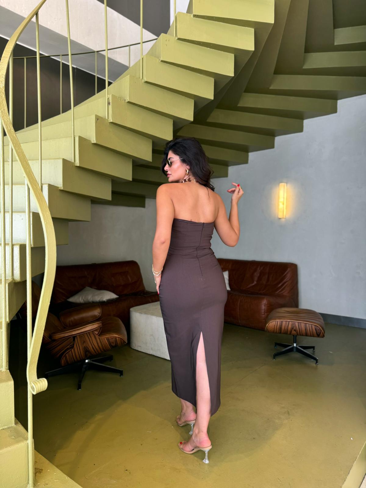 Modern kadının zarif gücünü temsil eden bu straplez elbise, kahverenginin doğal asaletini vurgulayan özel bir parça. Vücuda oturan likralı yapısı ve önden yırtmaç detayıyla her adımda özgüven konuşur.