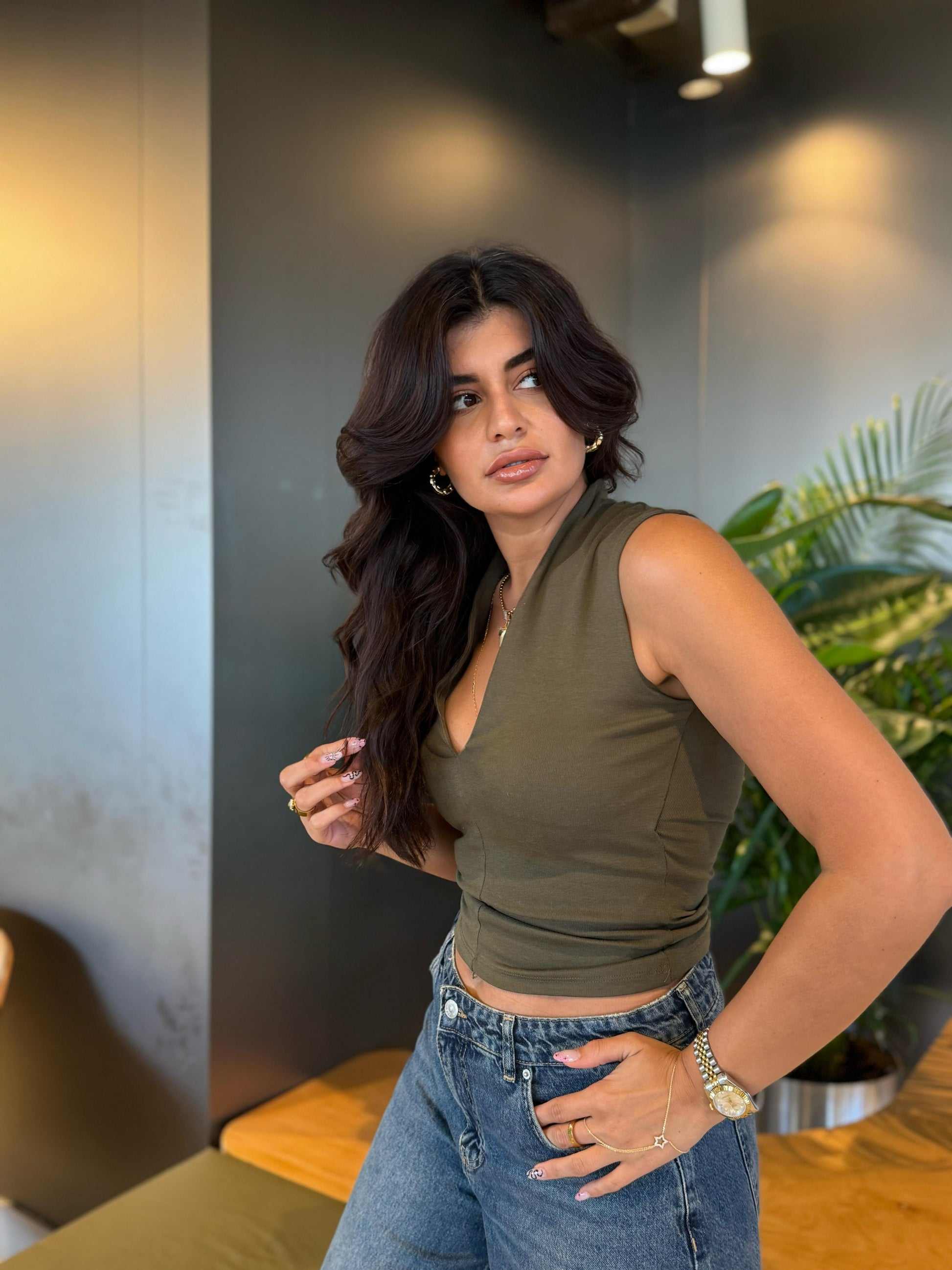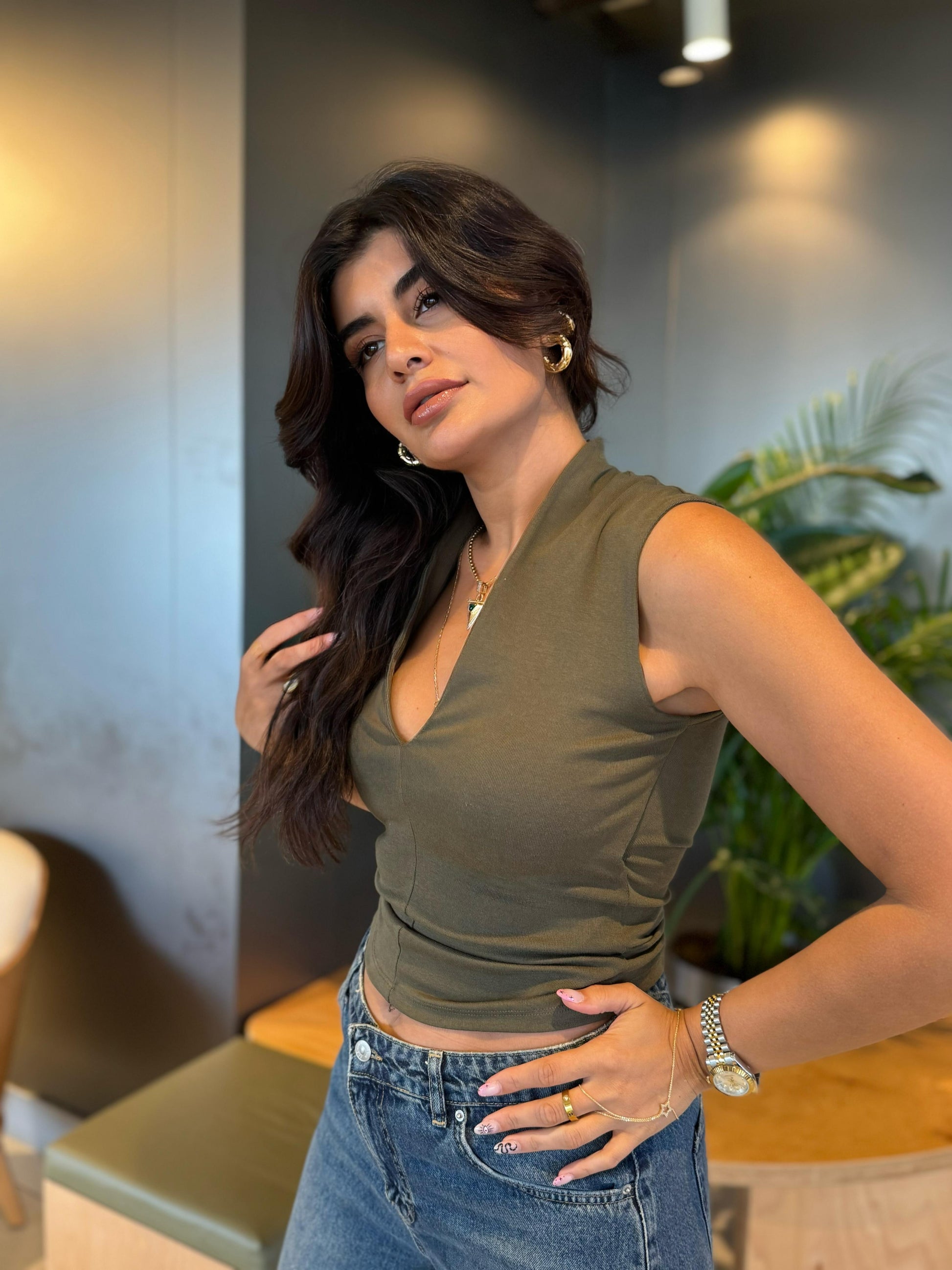 ✨ Dlvn Marka V Yaka Bluz | Zeytin Yeşili