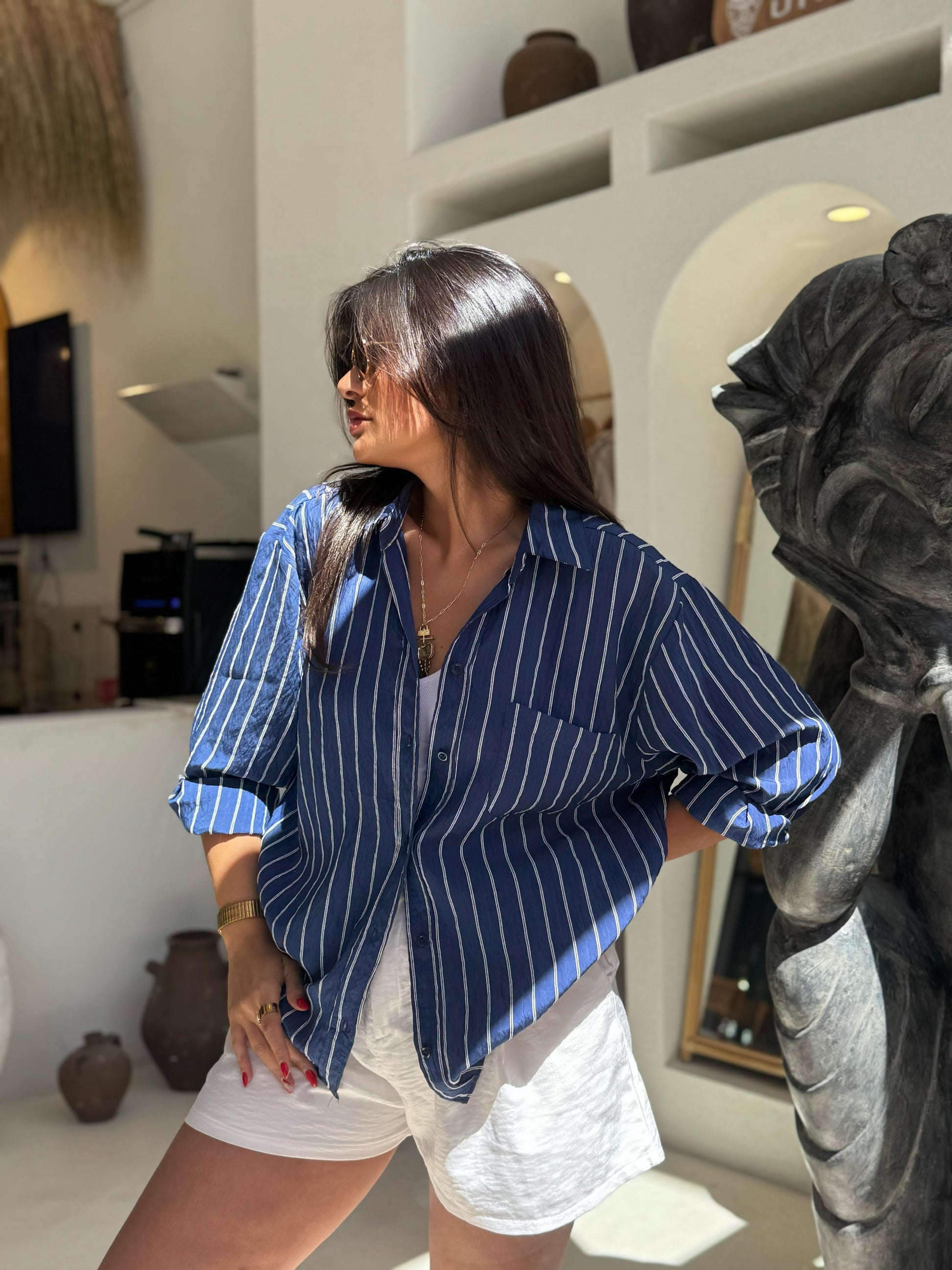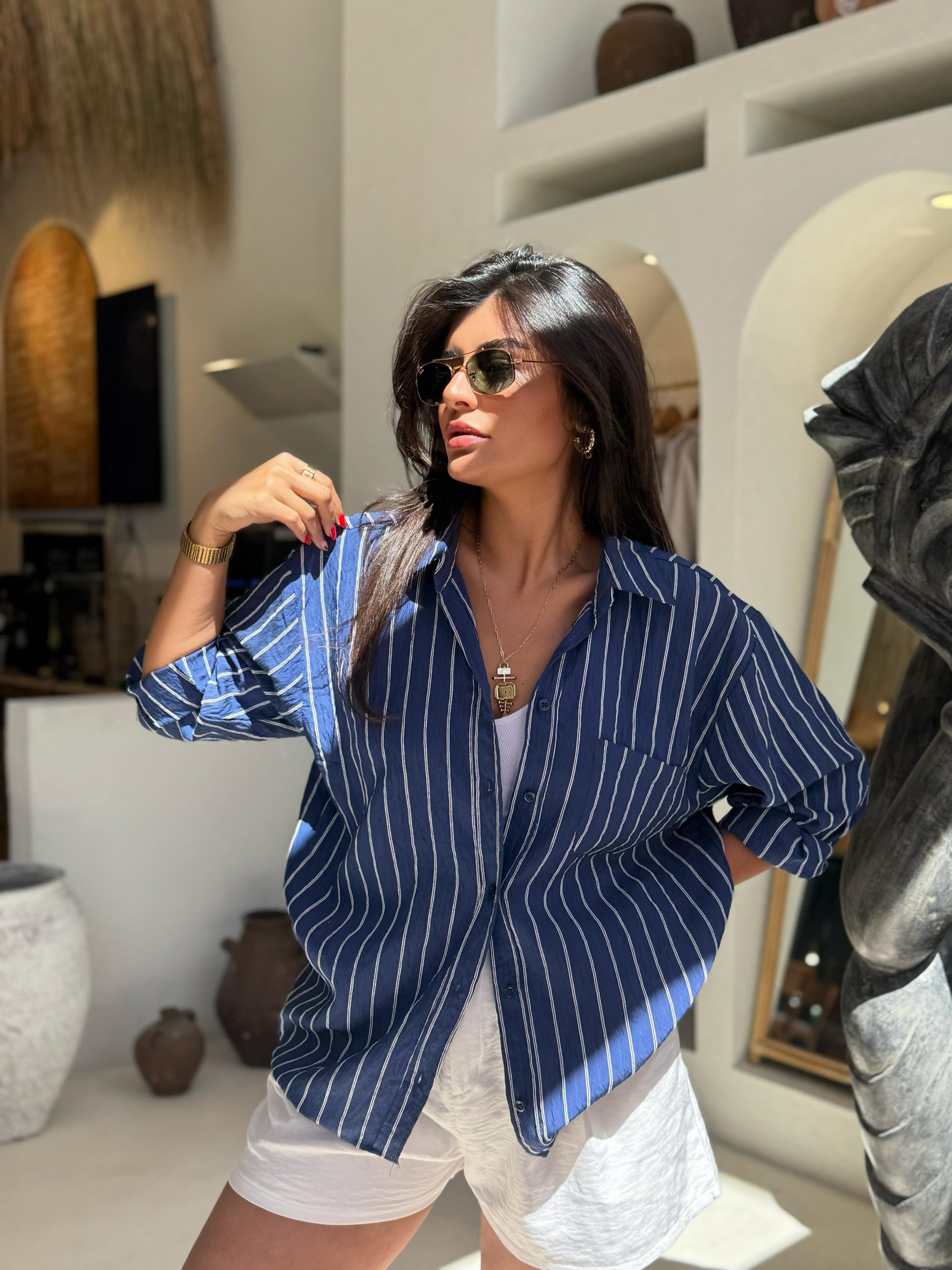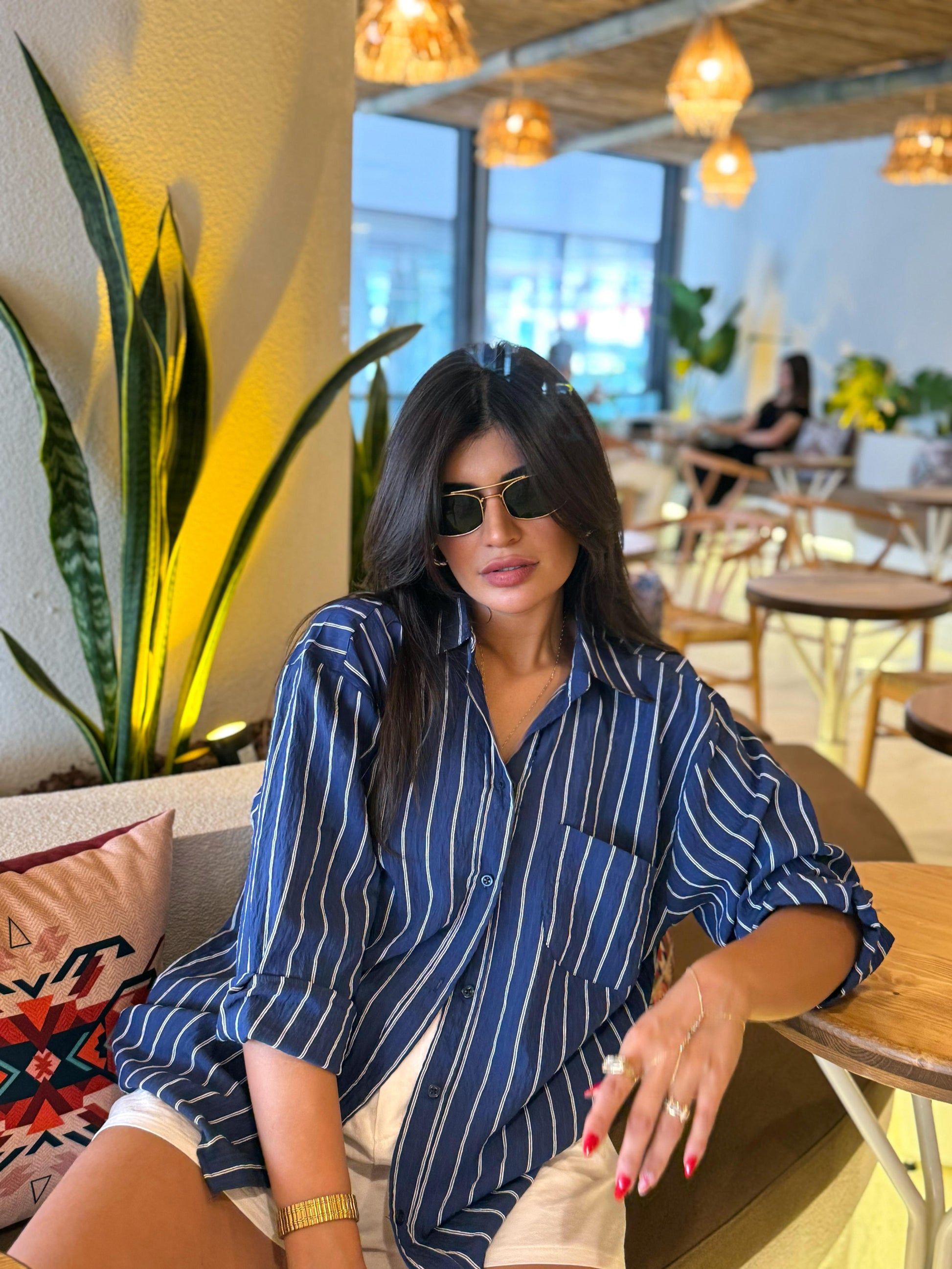 Yumuşak tensel kumaşı ve mavi-beyaz çizgili tasarımıyla bu premium gömlek, stilinden ödün vermeyen kadınların vazgeçilmezi. Oversize kesimi sayesinde rahatlık sunarken, kombinlerde modern bir hava yaratır.