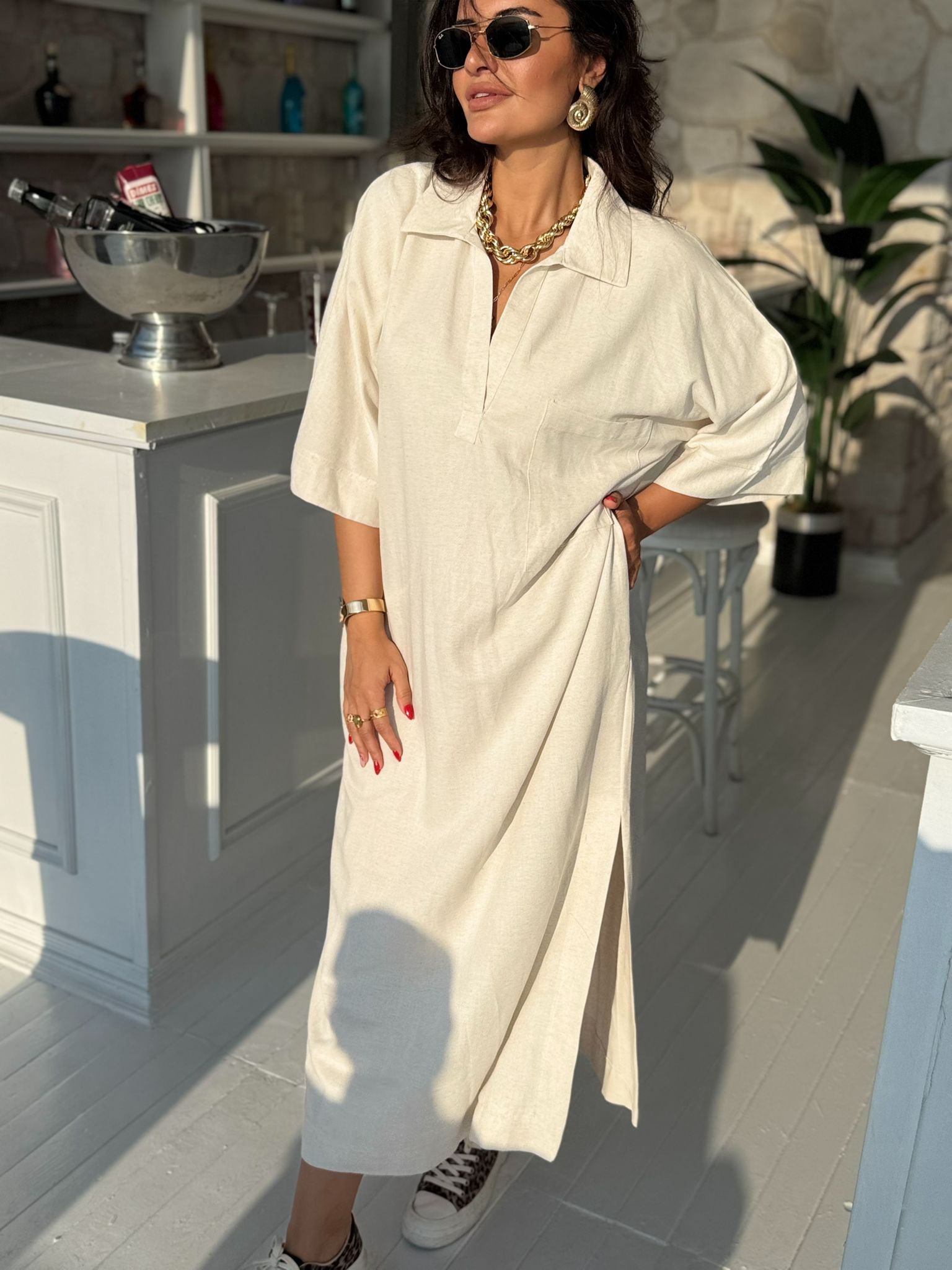 Keten Elbise Yandan Yırtmaçlı | Bej