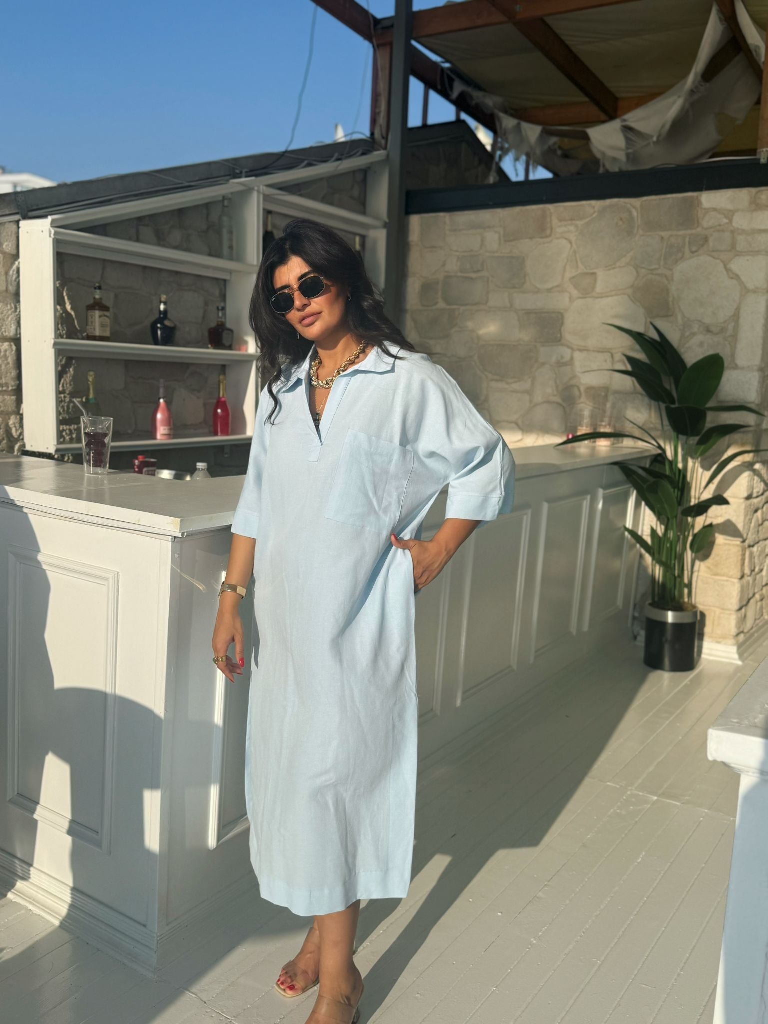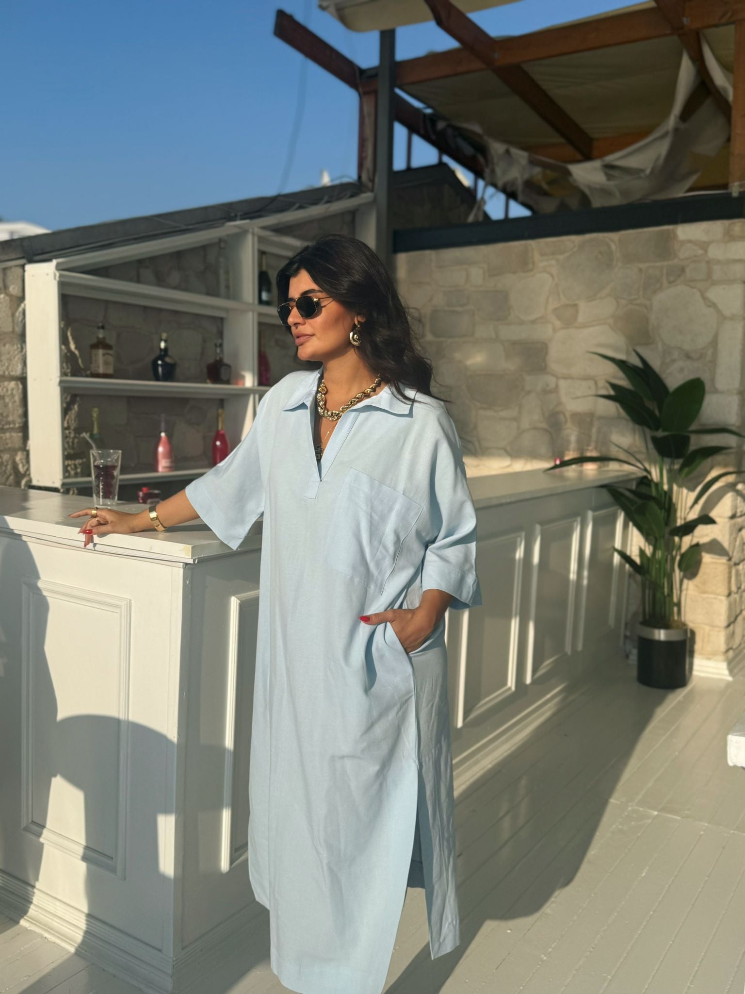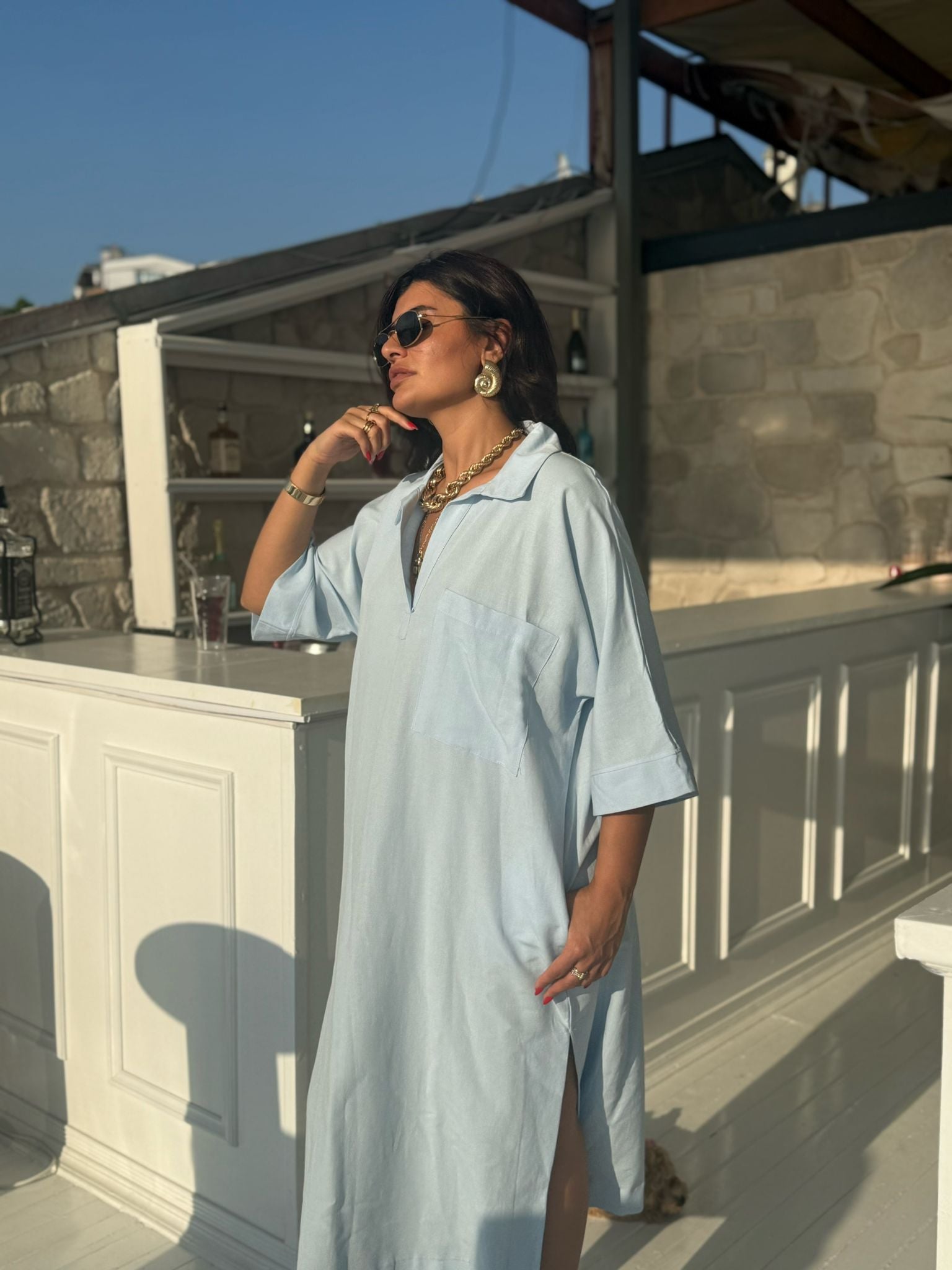 Gökyüzünden ilham alan bu zarif mavi ton, keten kumaşın doğallığıyla buluşuyor.