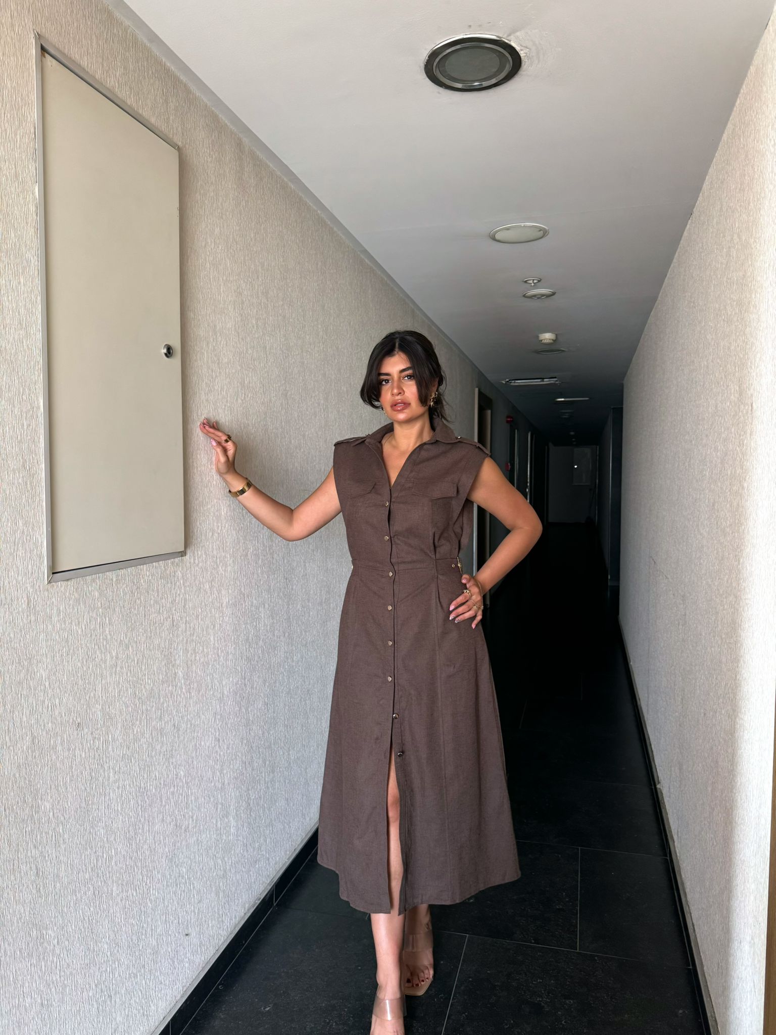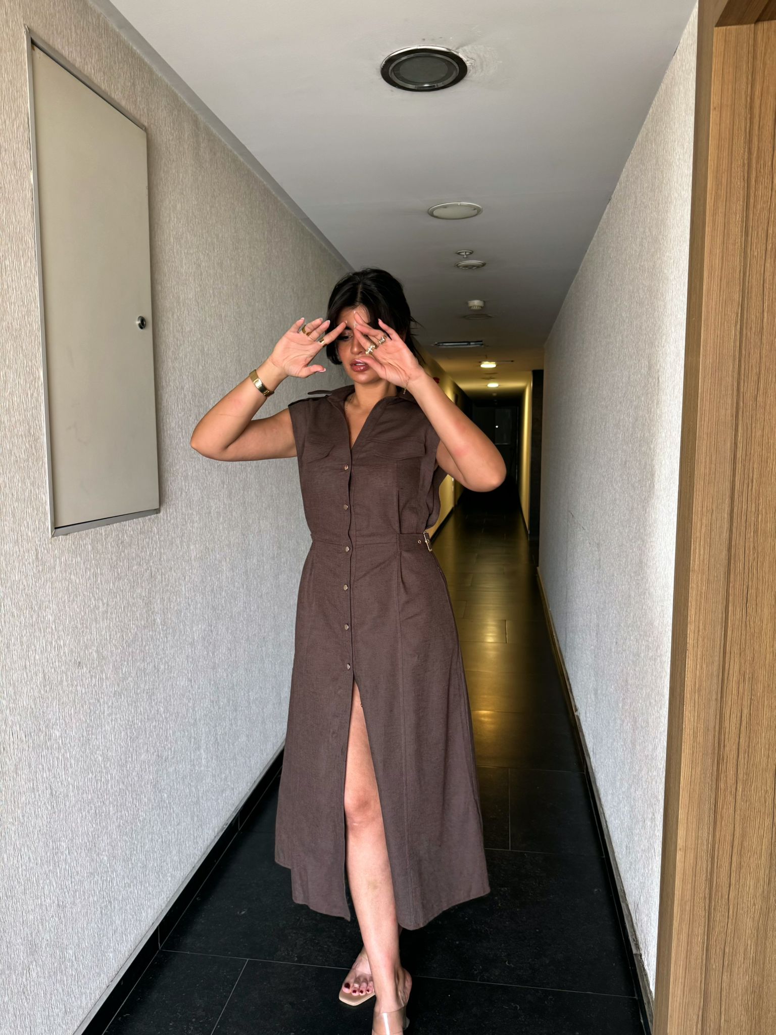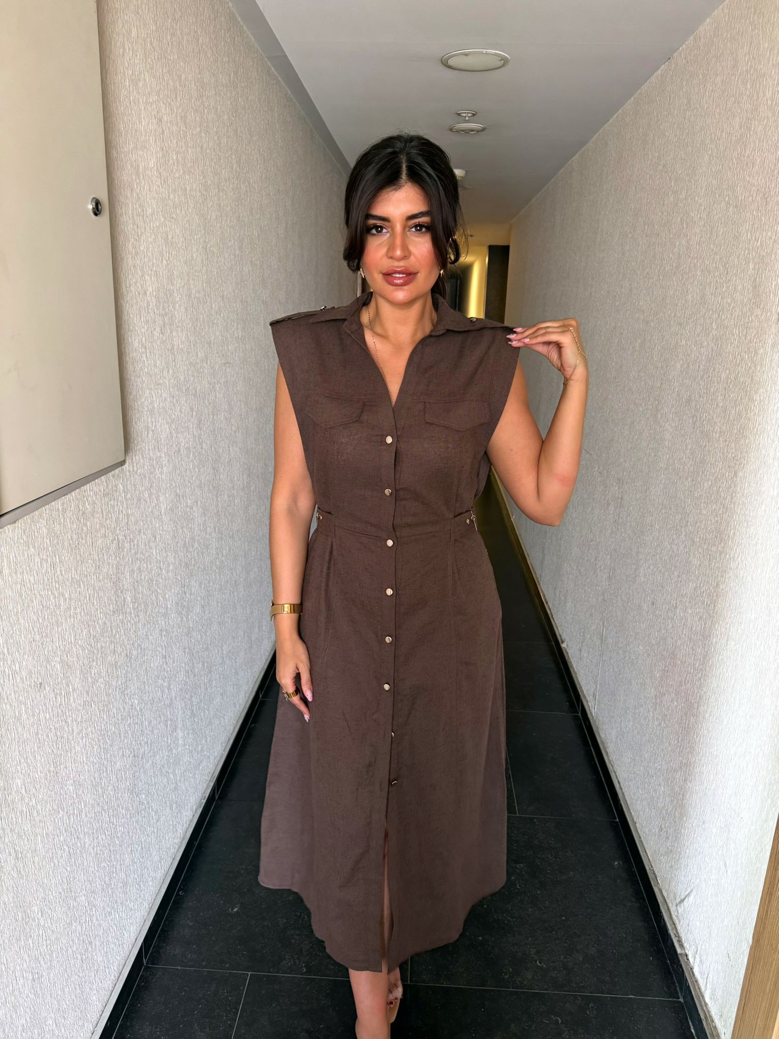 Keten Gold Düğme & Kemer Detaylı Premium Kalite Elbise | Kahverengi