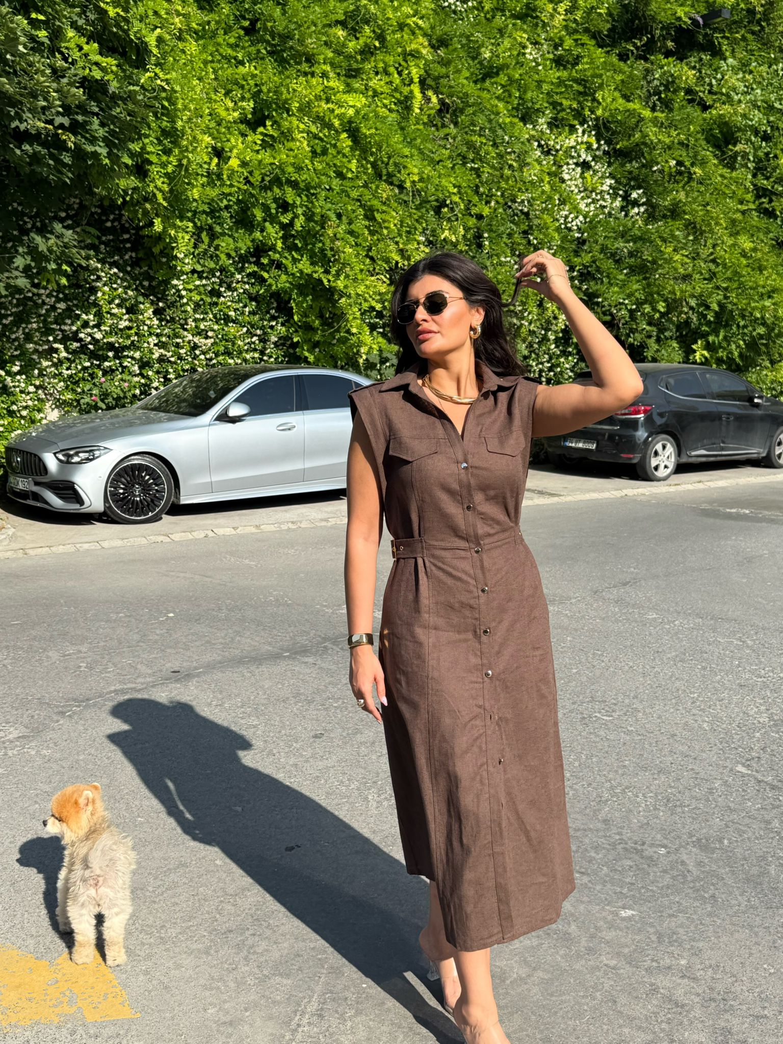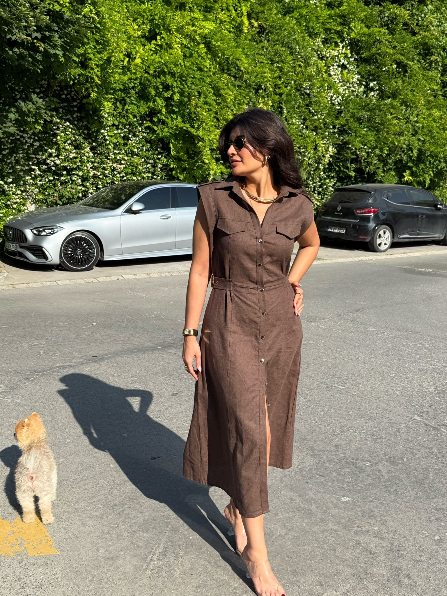✨ Gold Düğme & Kemer Detaylı Keten Elbise