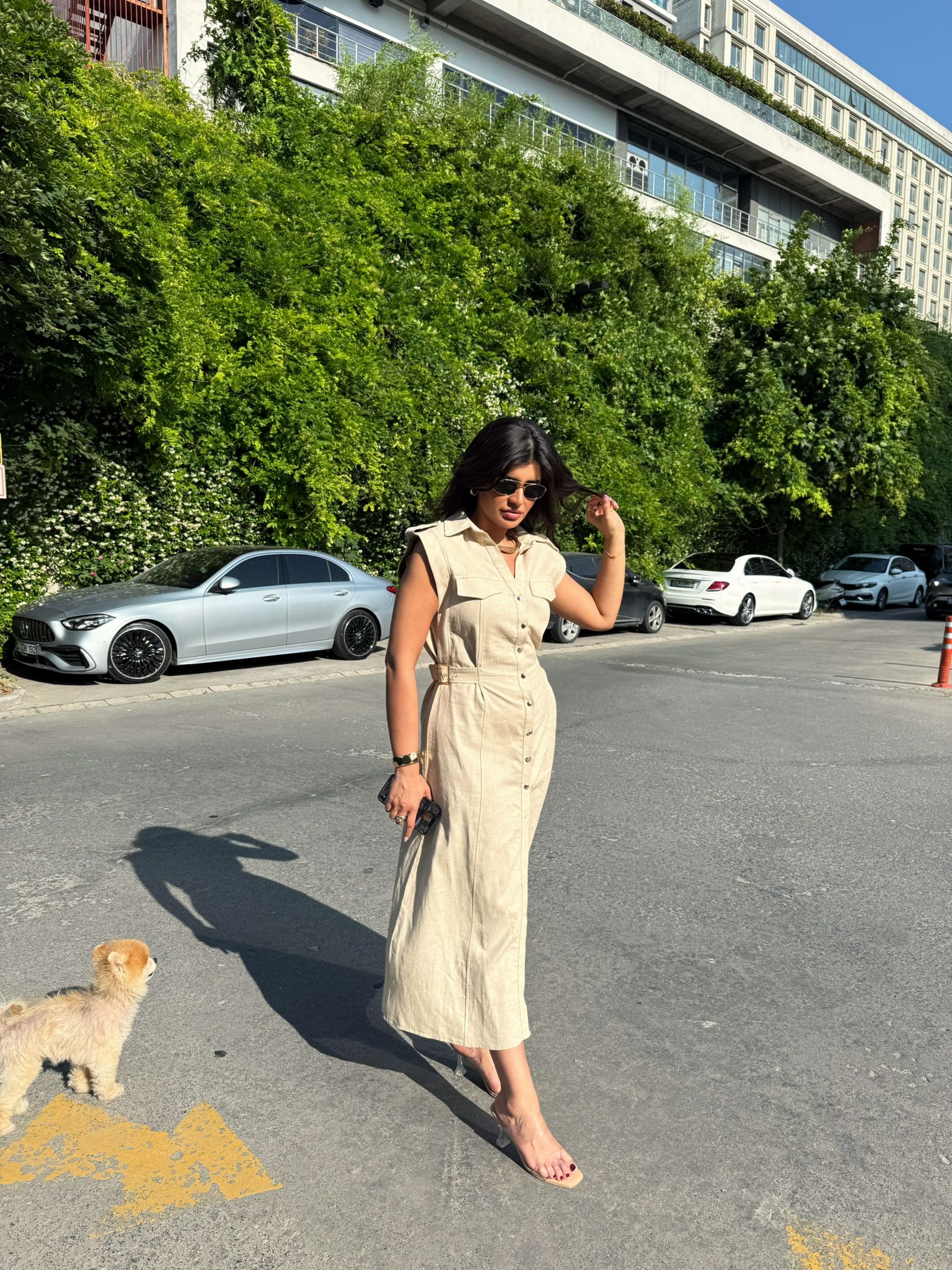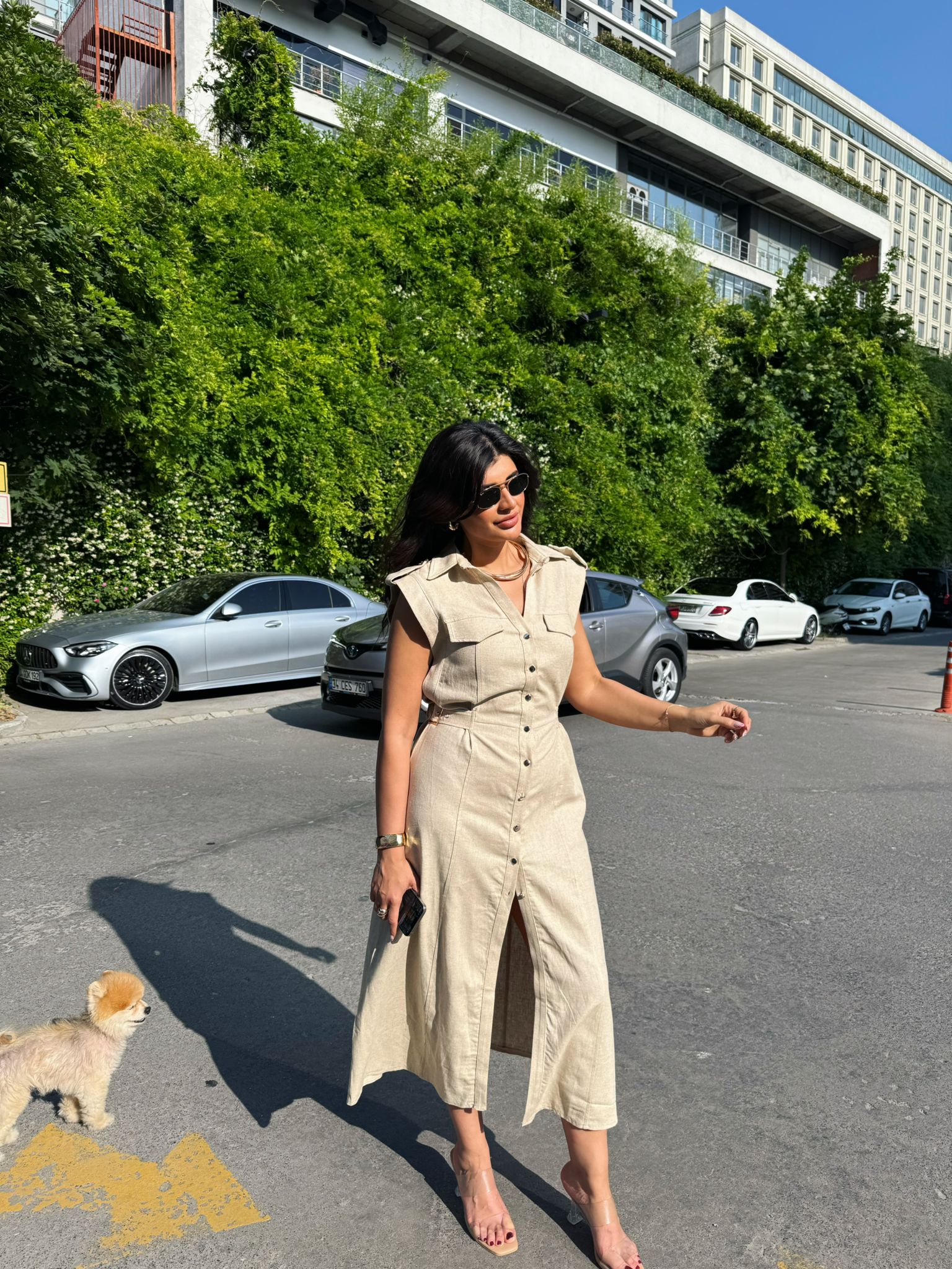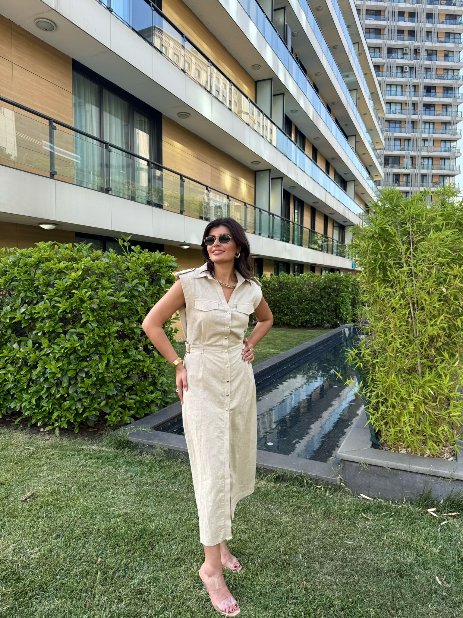 Keten Gold Düğme & Kemer Detaylı Premium Kalite Elbise | Açık Bej