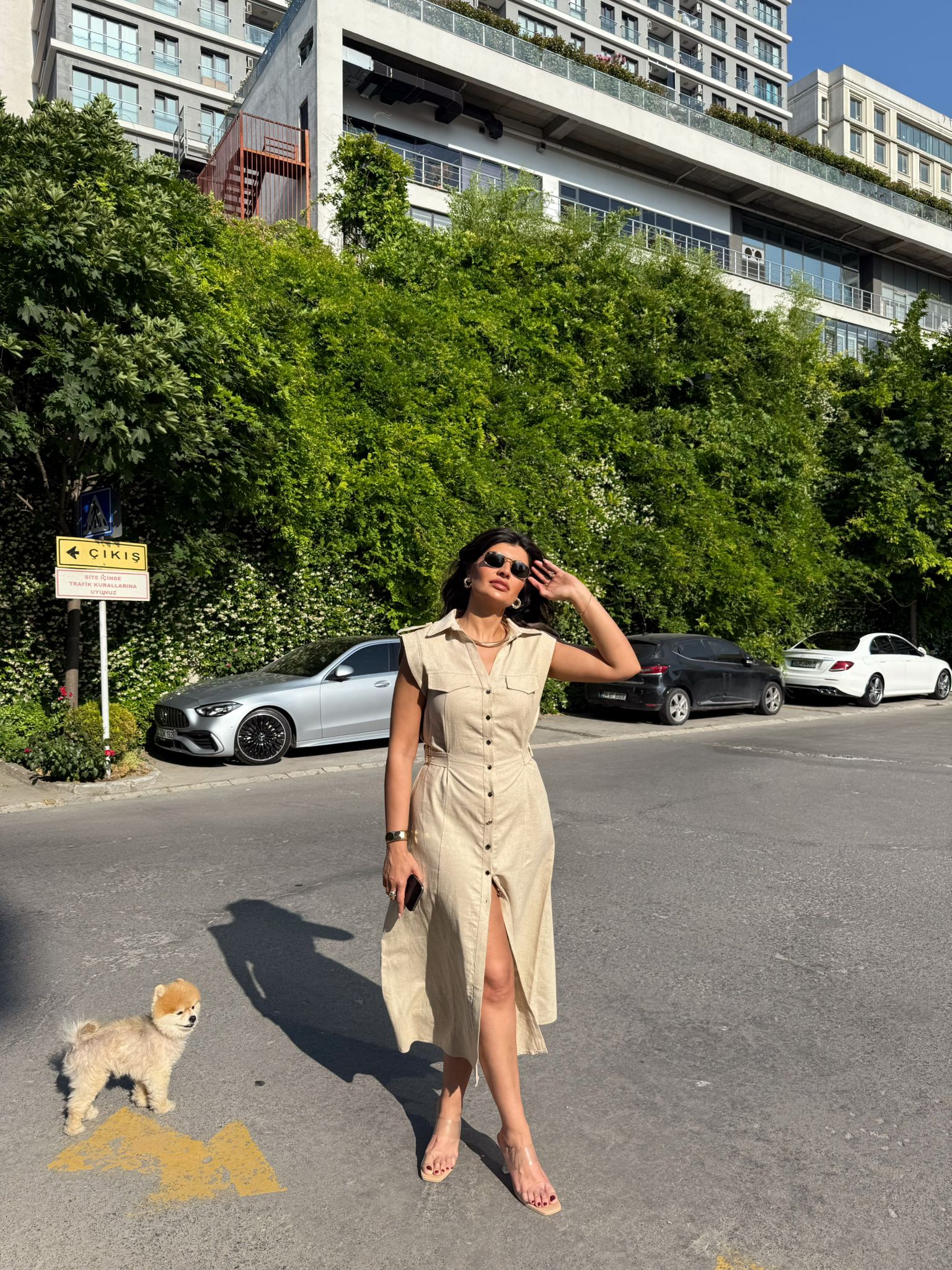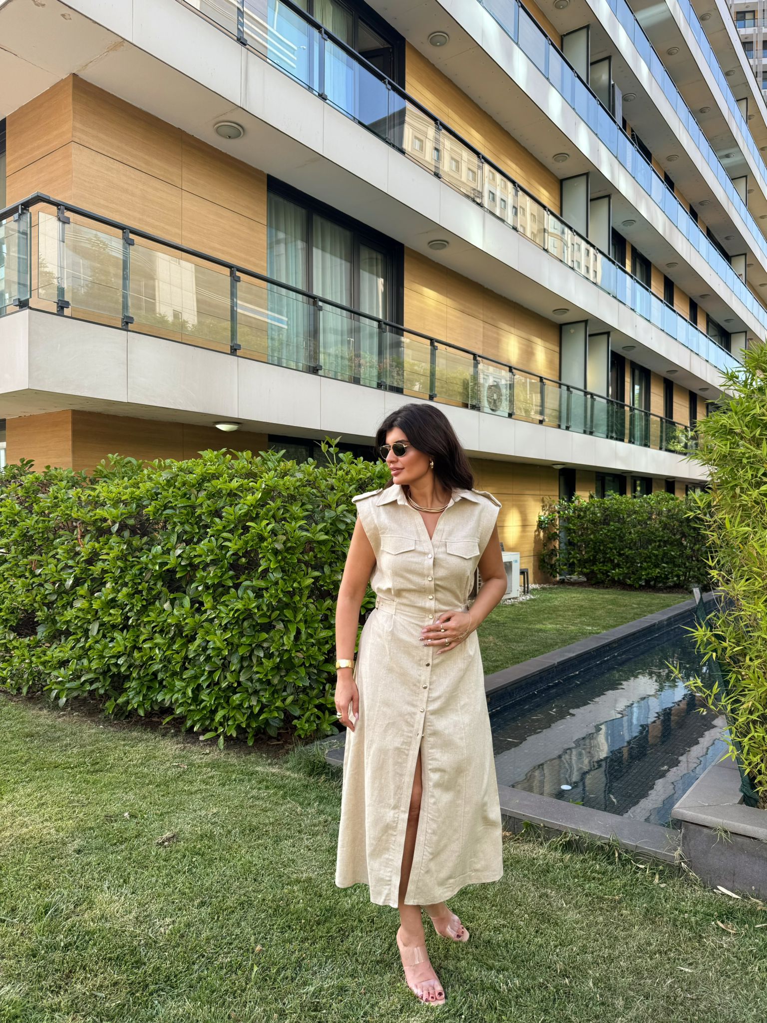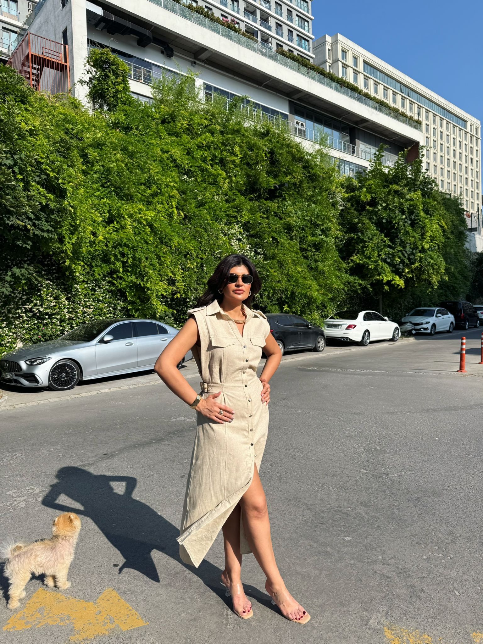 Keten Gold Düğme & Kemer Detaylı Premium Kalite Elbise | Açık Bej
