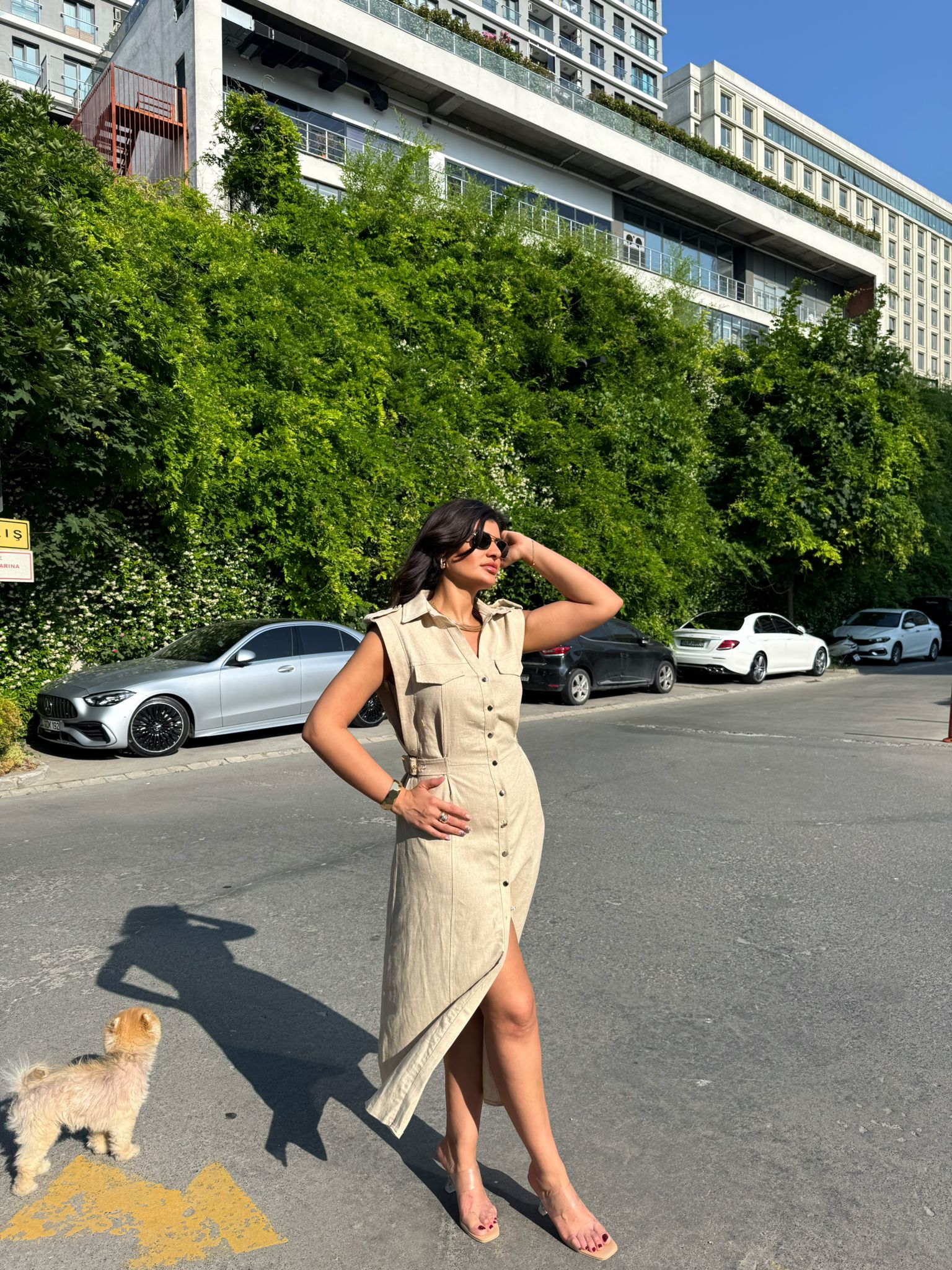 ✨ Gold Düğme & Kemer Detaylı Keten Elbise