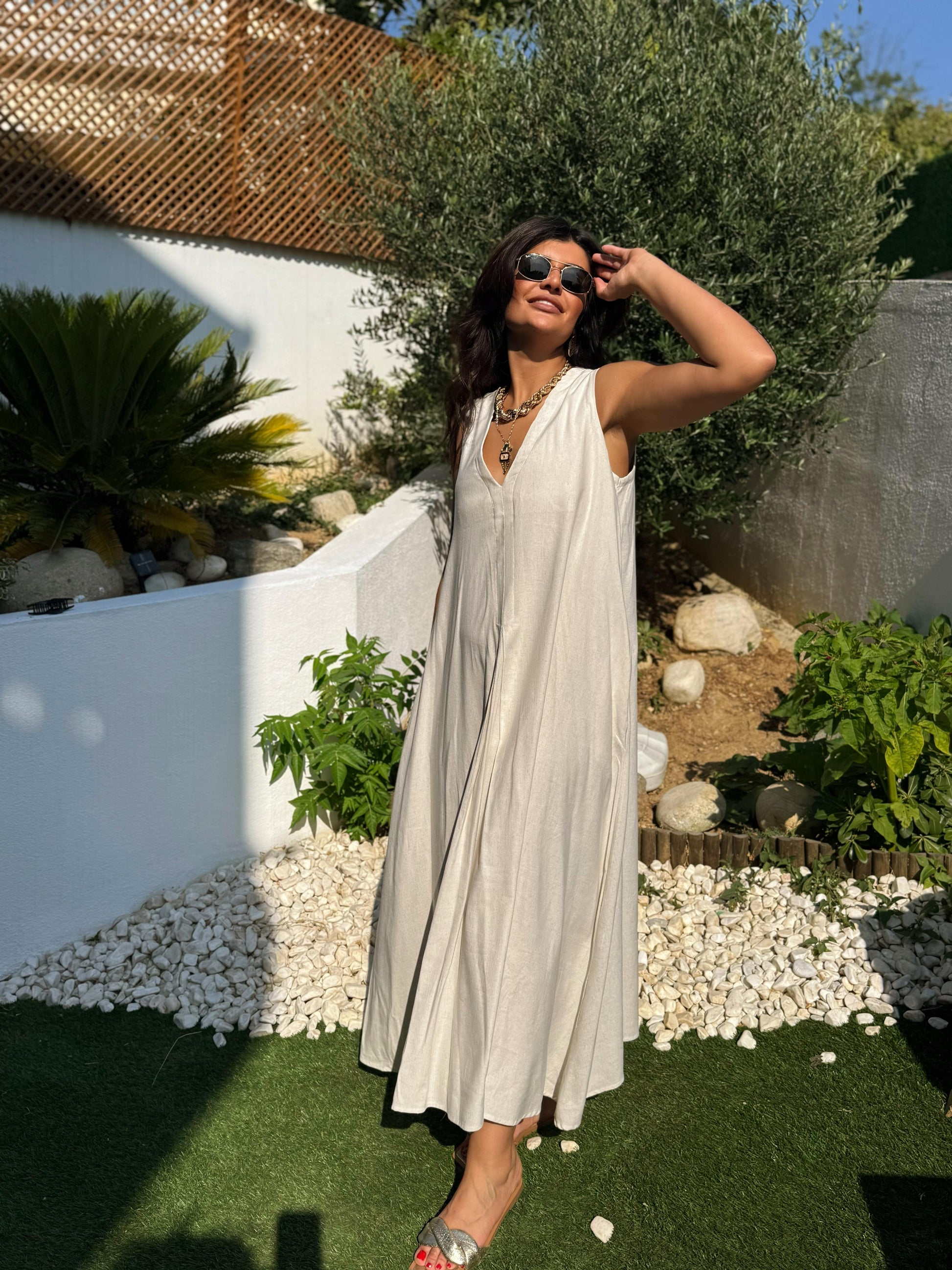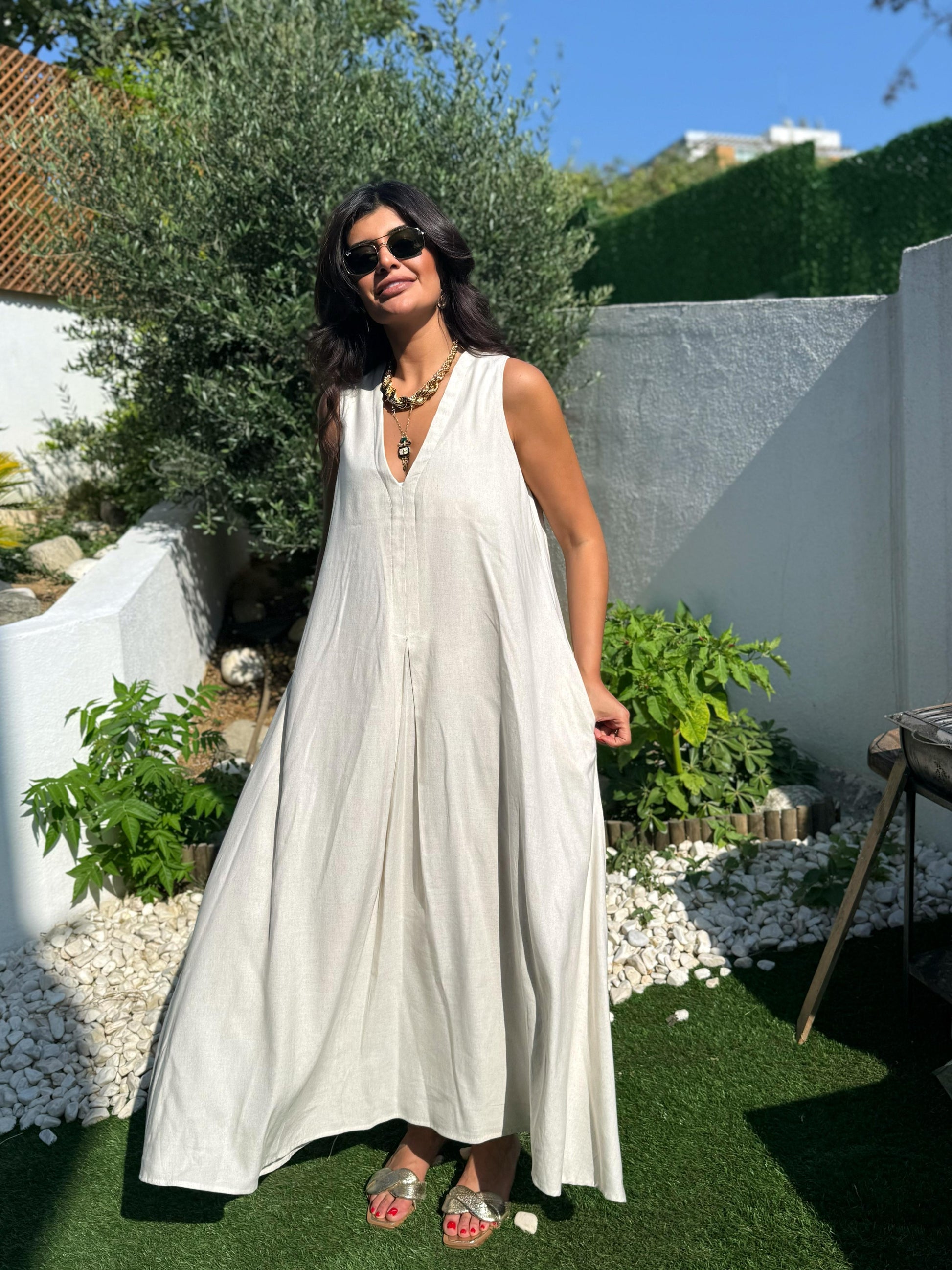 Beyazın sade ihtişamıyla tasarlanan bu cepli keten maxi elbise, minimal stilin en zarif halini yansıtıyor. Hafif yapısı ve ferah dokusuyla yaz günlerinde hem şık hem konforlu hissettirir. Günlük kombinlerden özel yaz akşamlarına kadar her ana uyum sağlar.