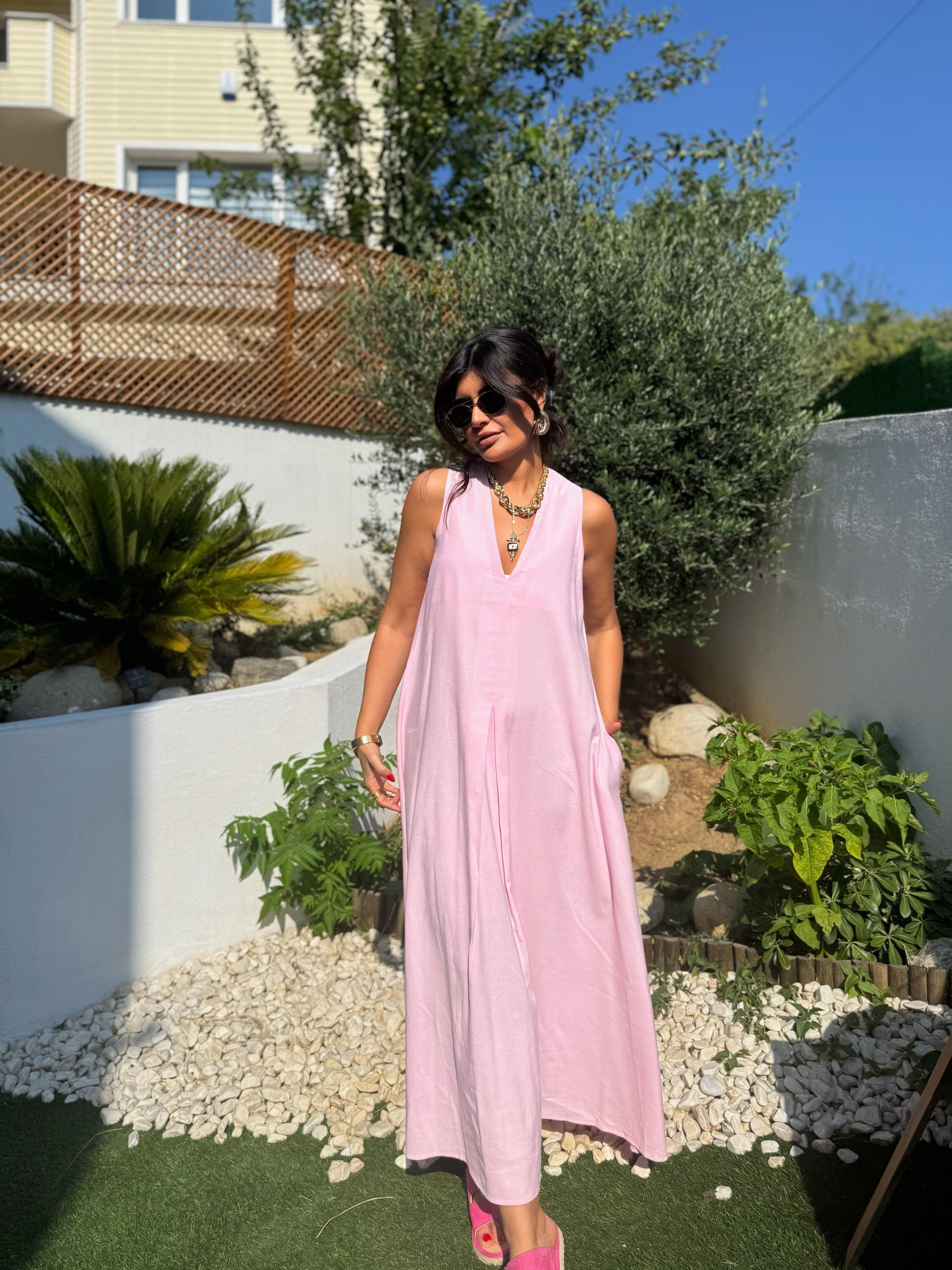 Keten Kumaş Cepli Maxi Boy Elbise | Pembe