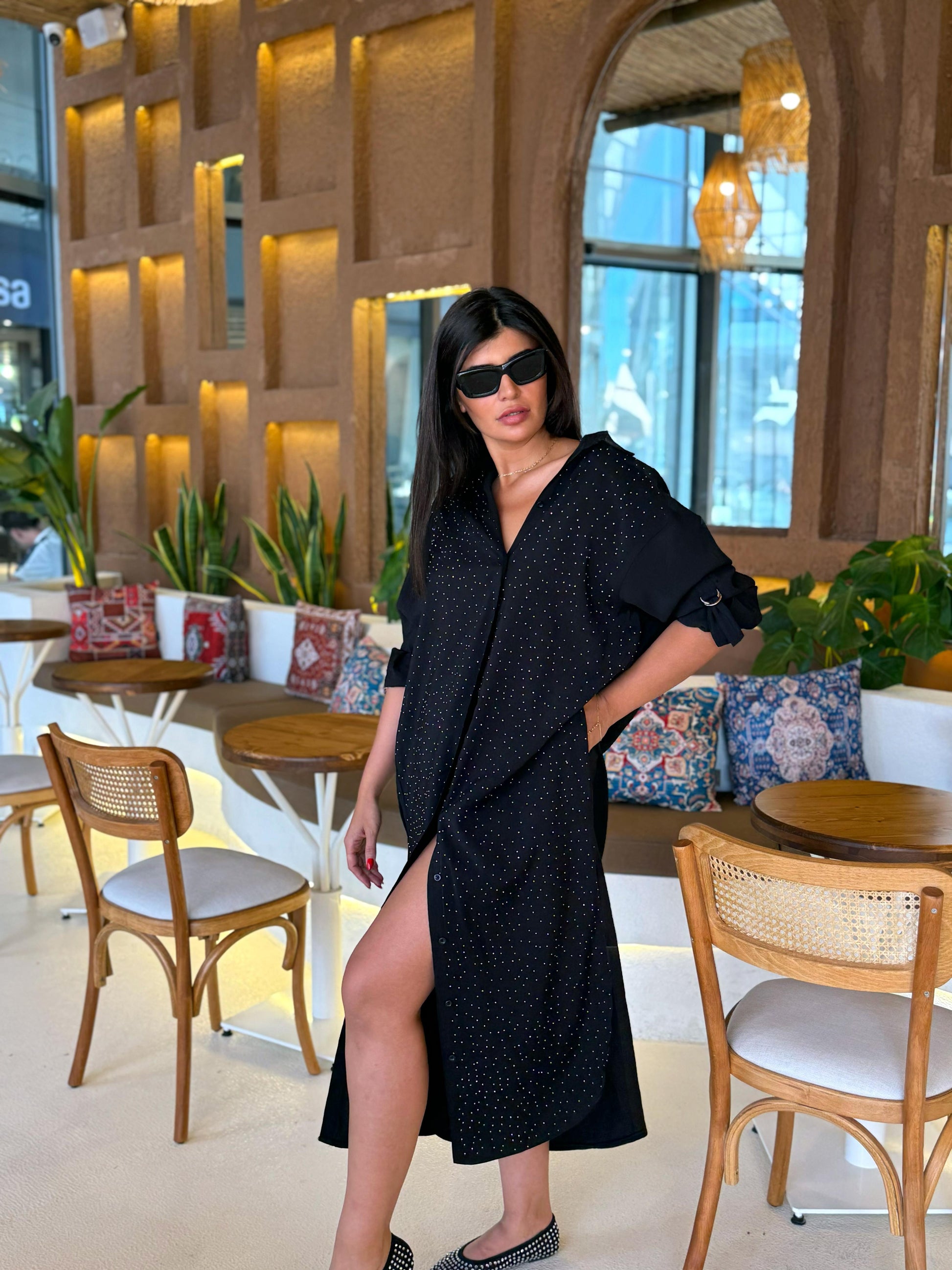 Siyahın asaletiyle harmanlanan bu tencel kumaş gömlek elbise; güçlü, iddialı ve stil sahibi kadınların tercihi. Yumuşak dokusu ile rahat bir kullanım sunarken, yırtmaçlı kesimi ve gömlek formu ile modern ve sofistike bir duruş kazandırır.