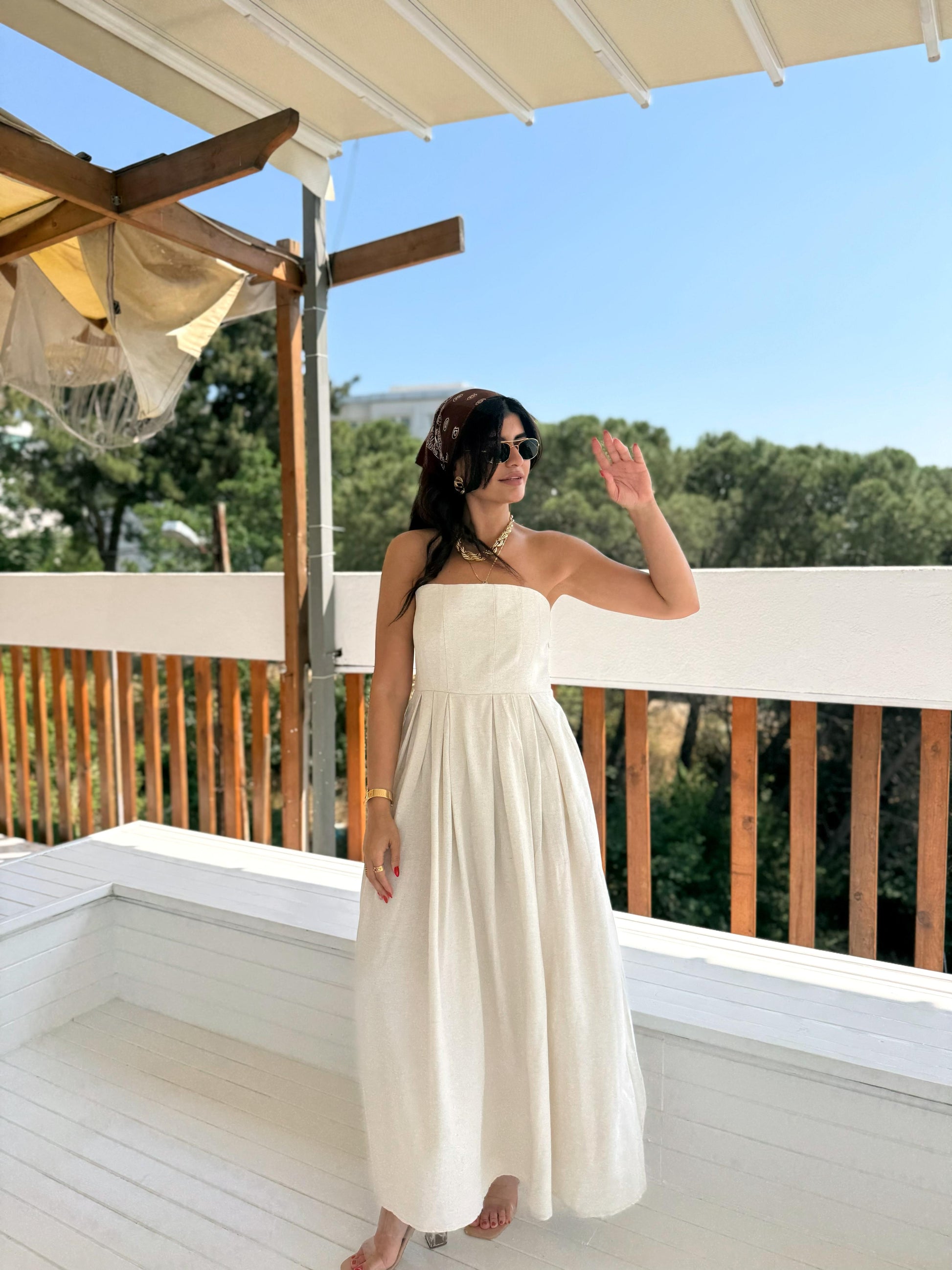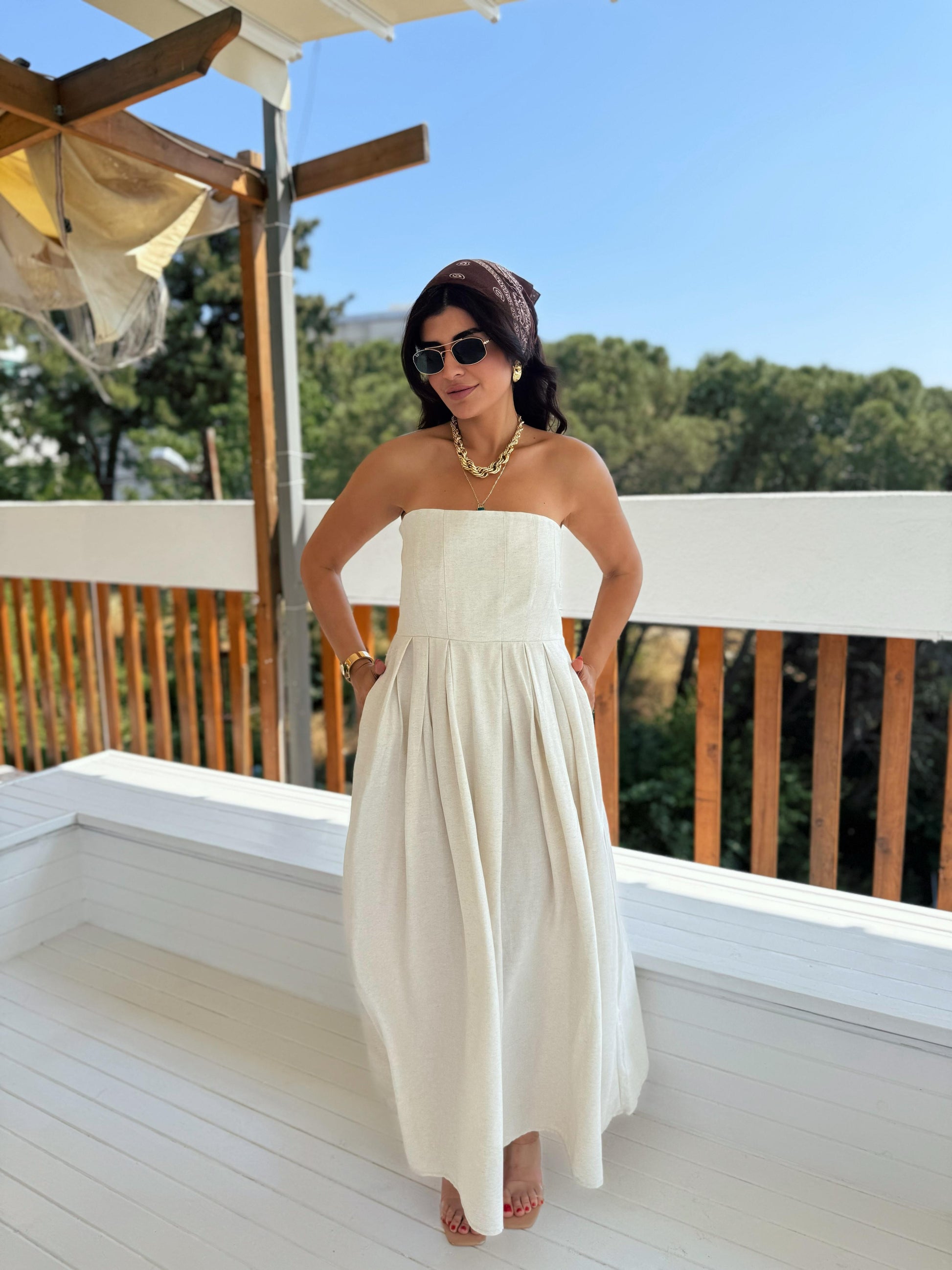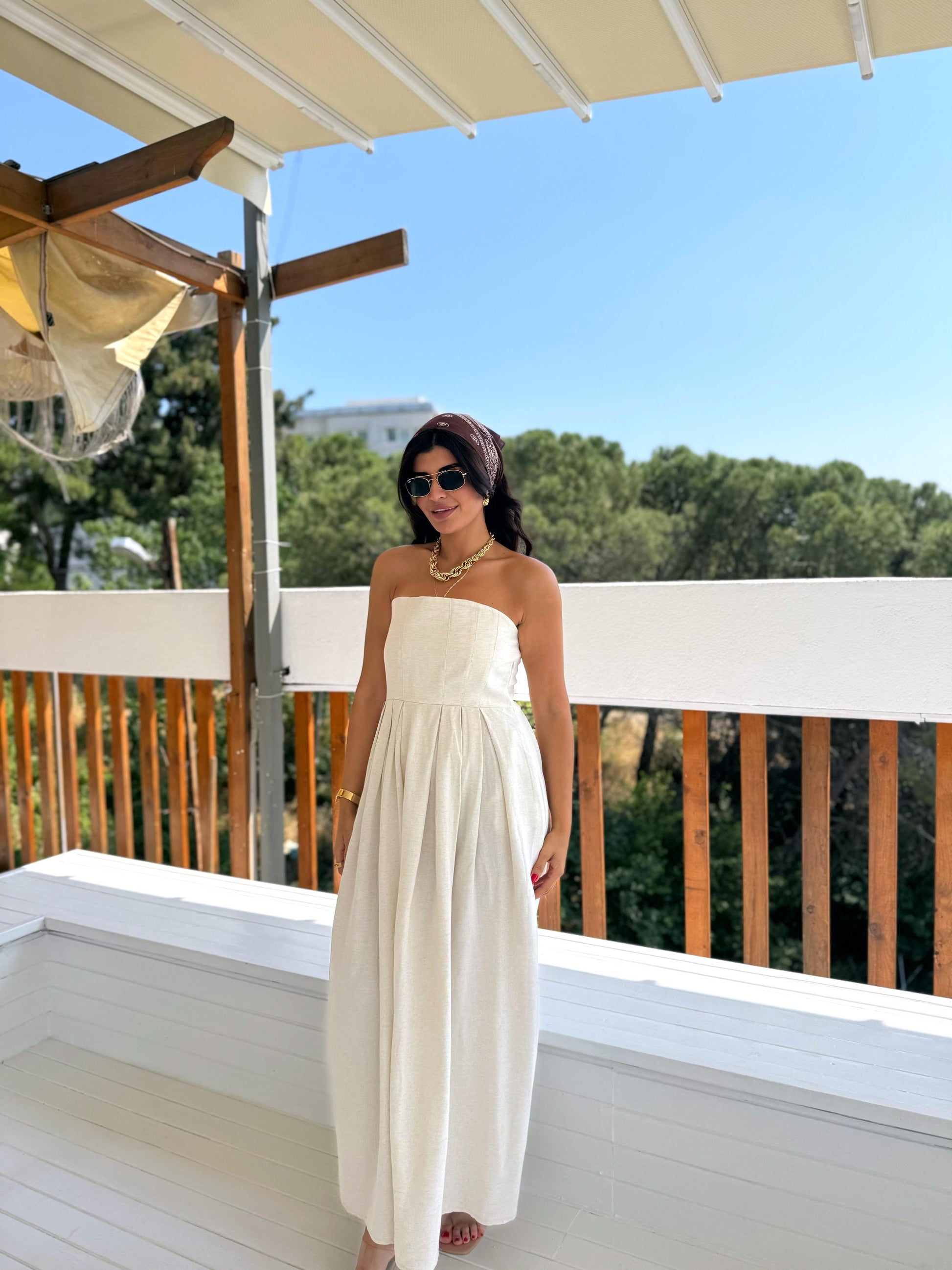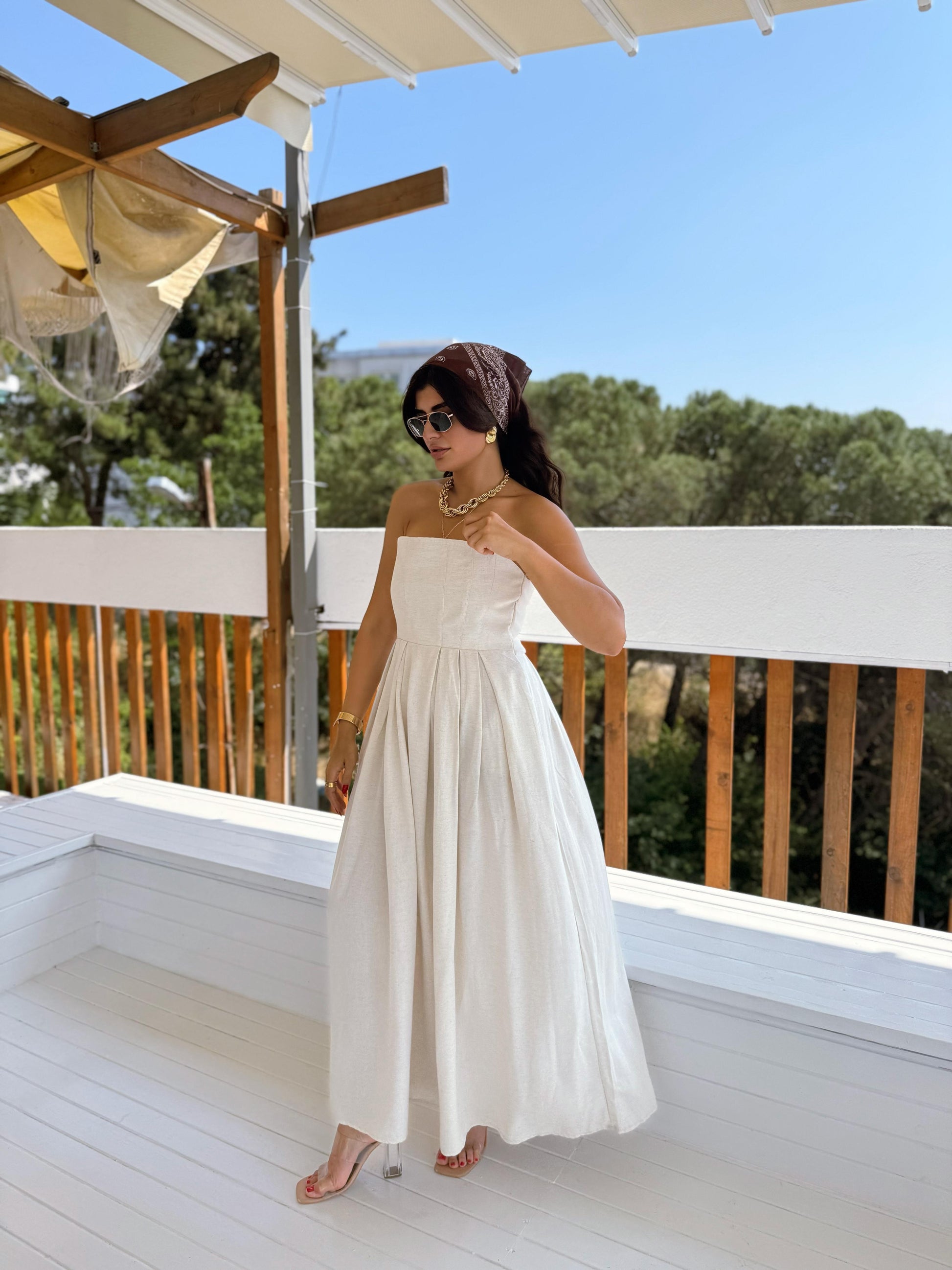 ✨ Zamansız Asalet: Keten Straplez Beyaz Elbise 🤍