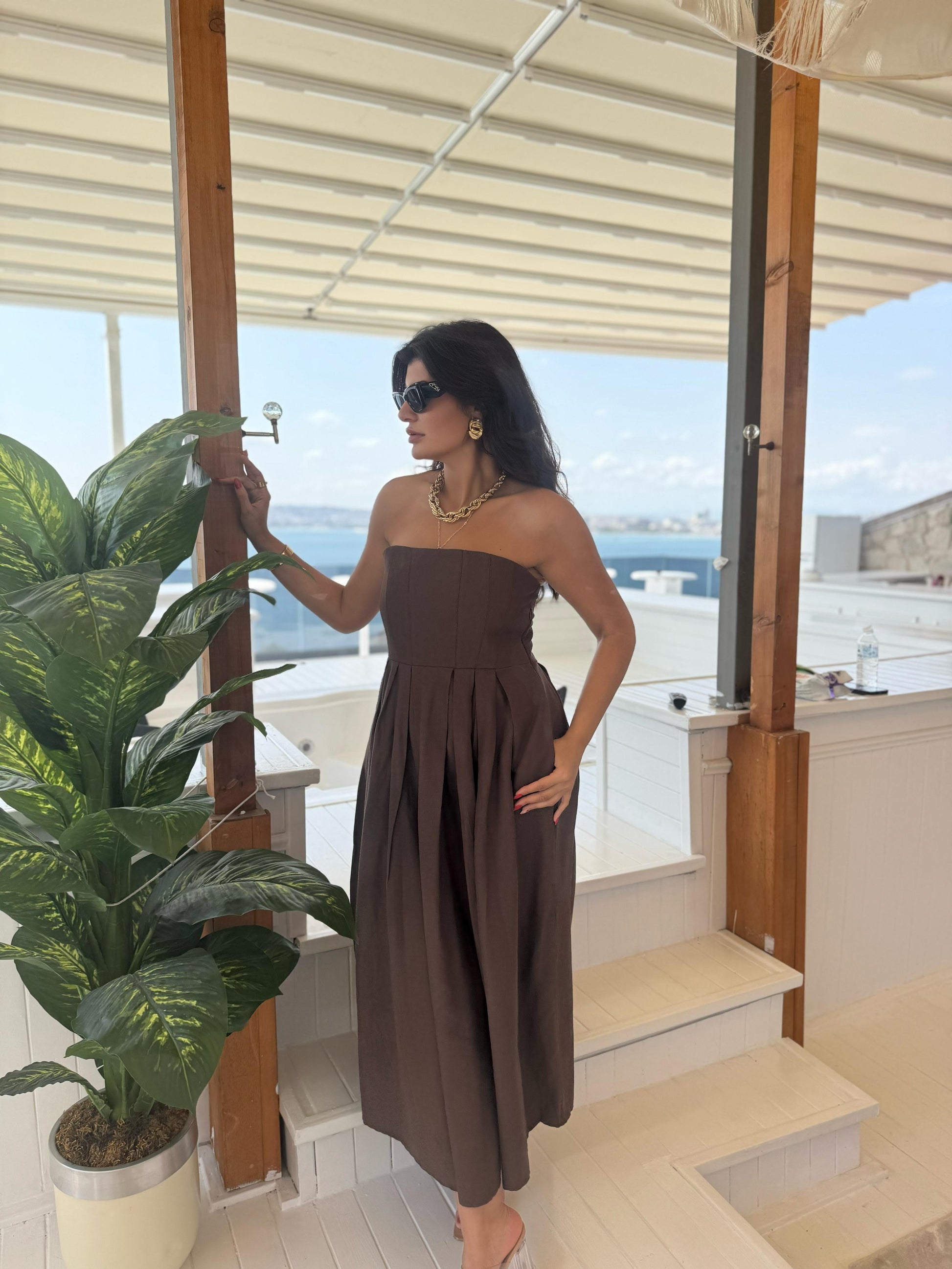✨ Doğal Şıklığın Gücü: Keten Straplez Kahverengi Elbise 🤎