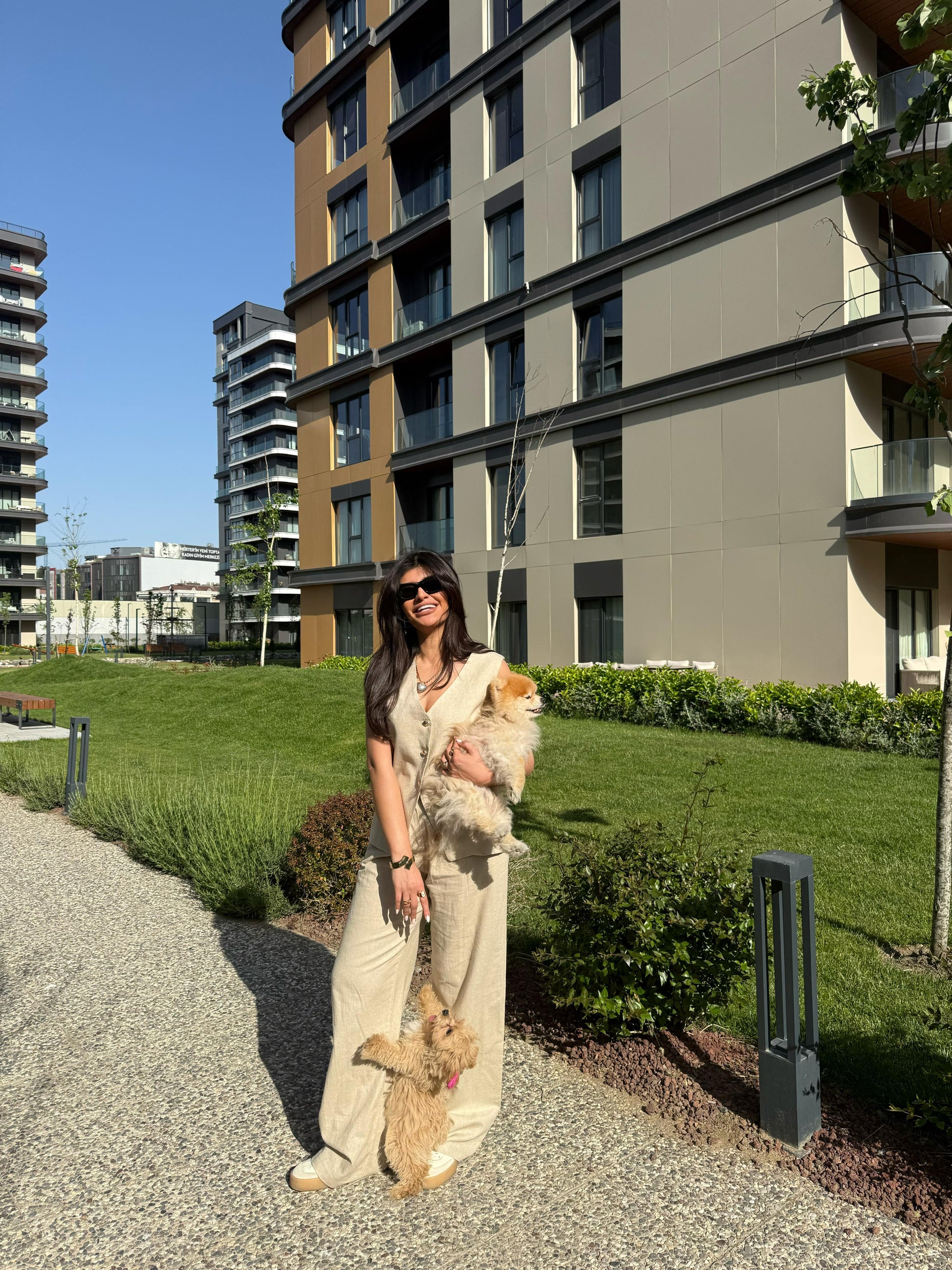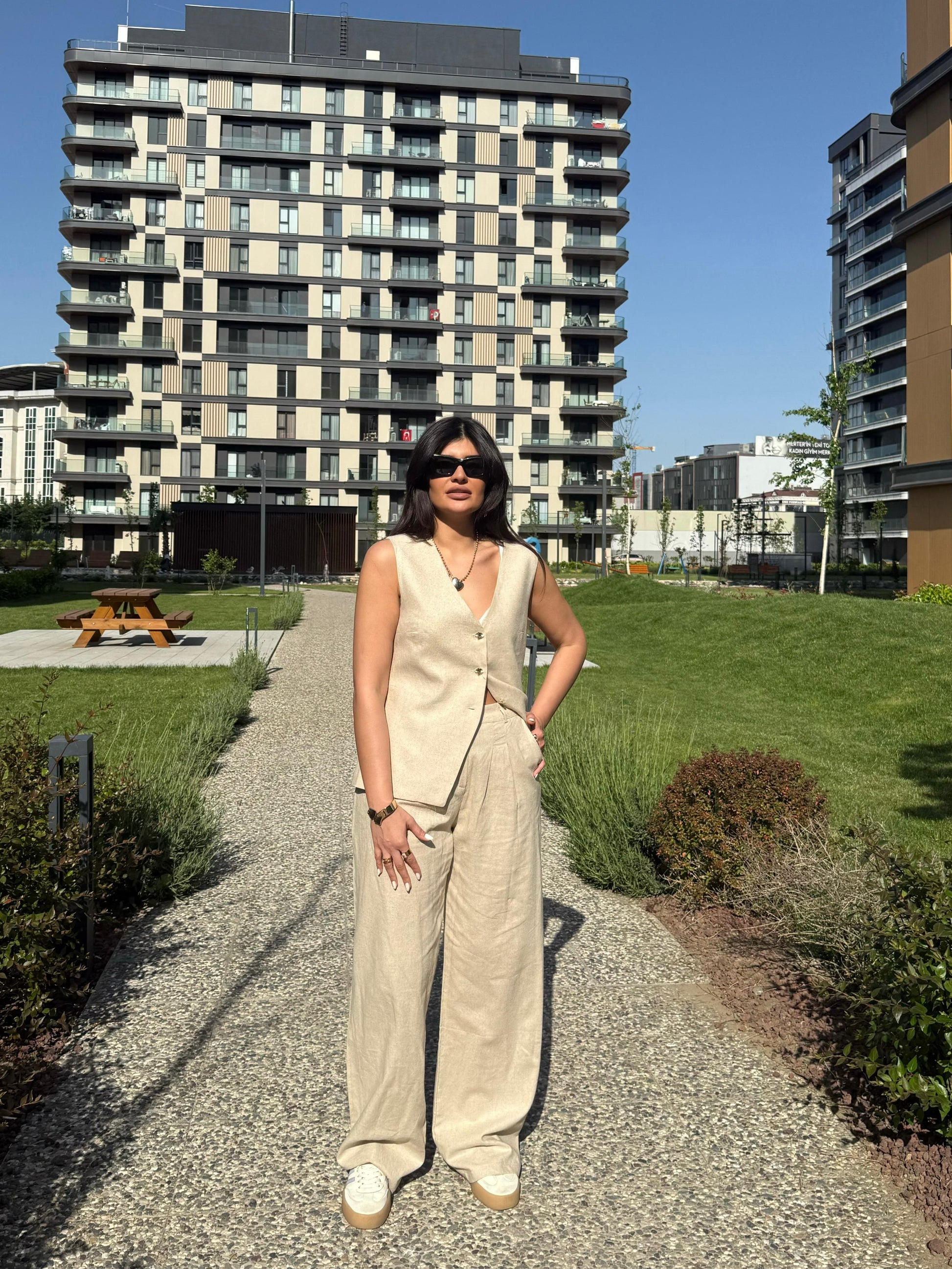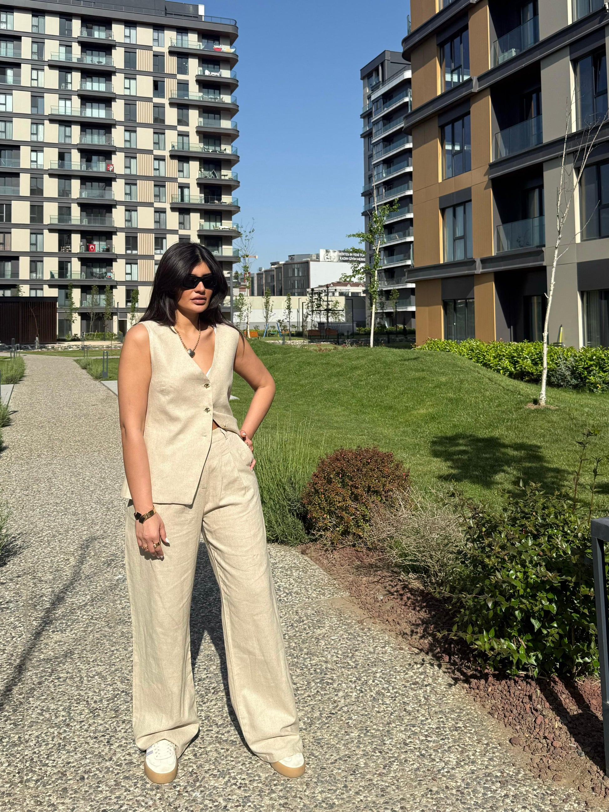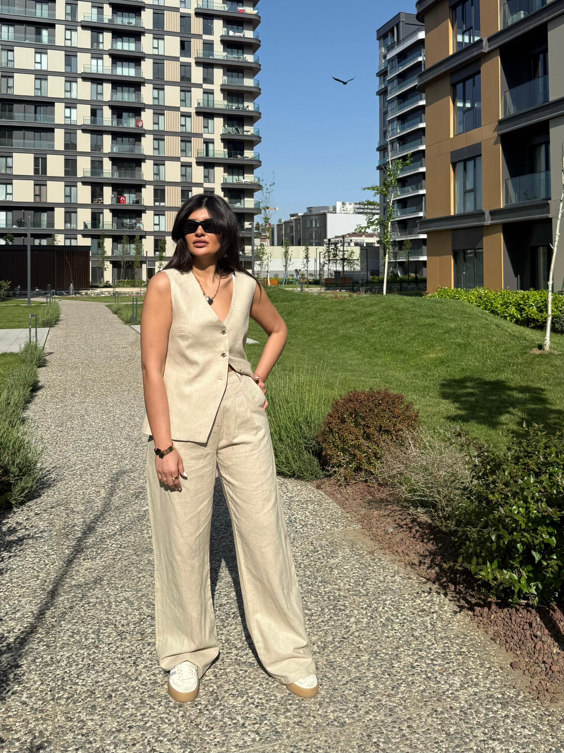 Yüksek belli pantolon ve kruvaze kesimli üst parçasıyla hem özgür hem iddialı. Bej tonu, her cilt tonuna uyum sağlar. Ketenin doğal yapısı terletmez, ferahlık sunar.