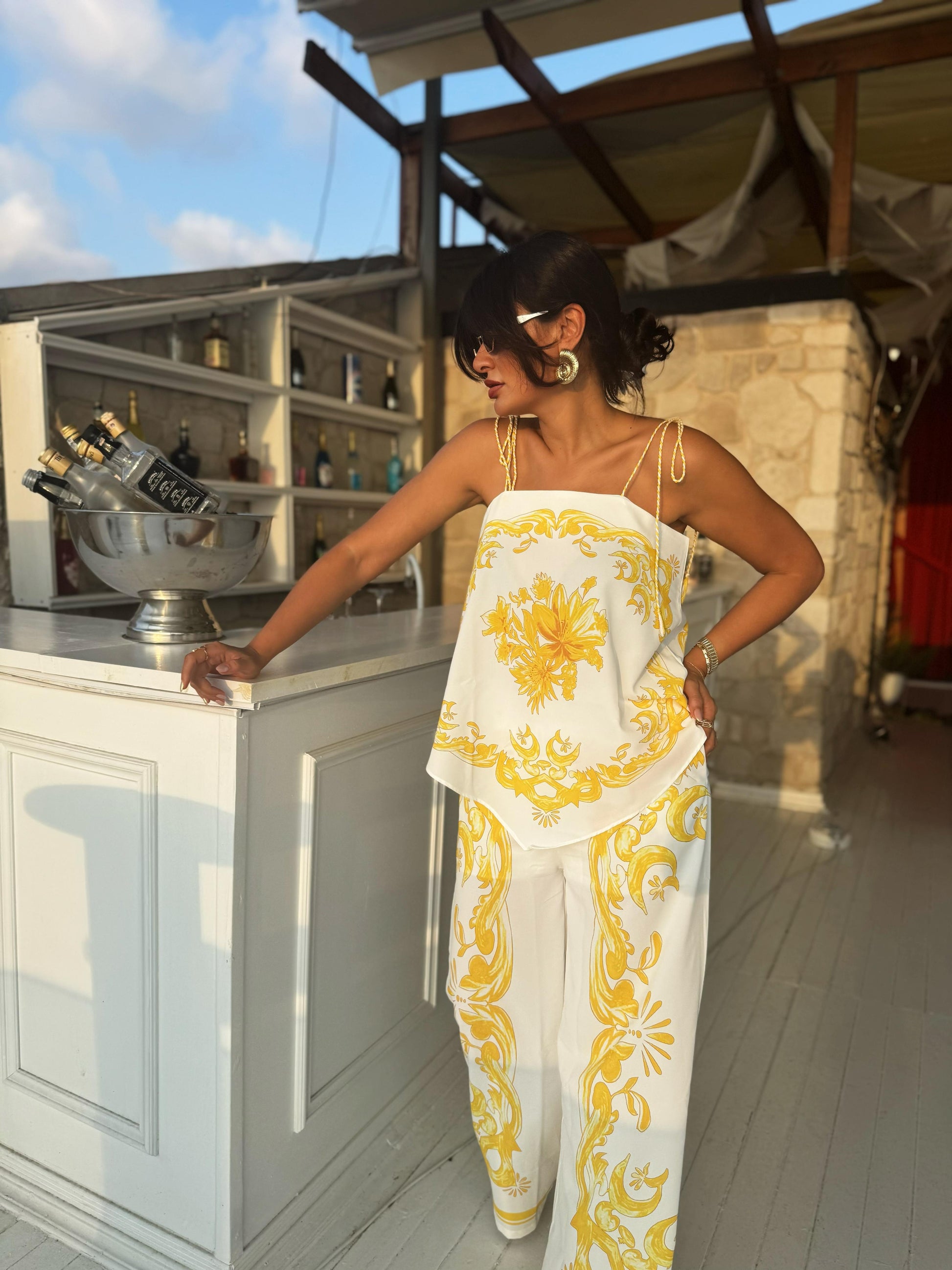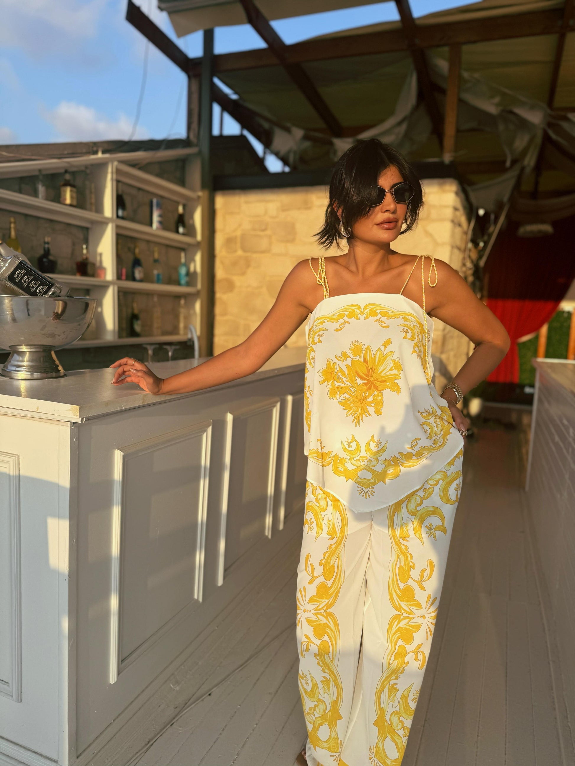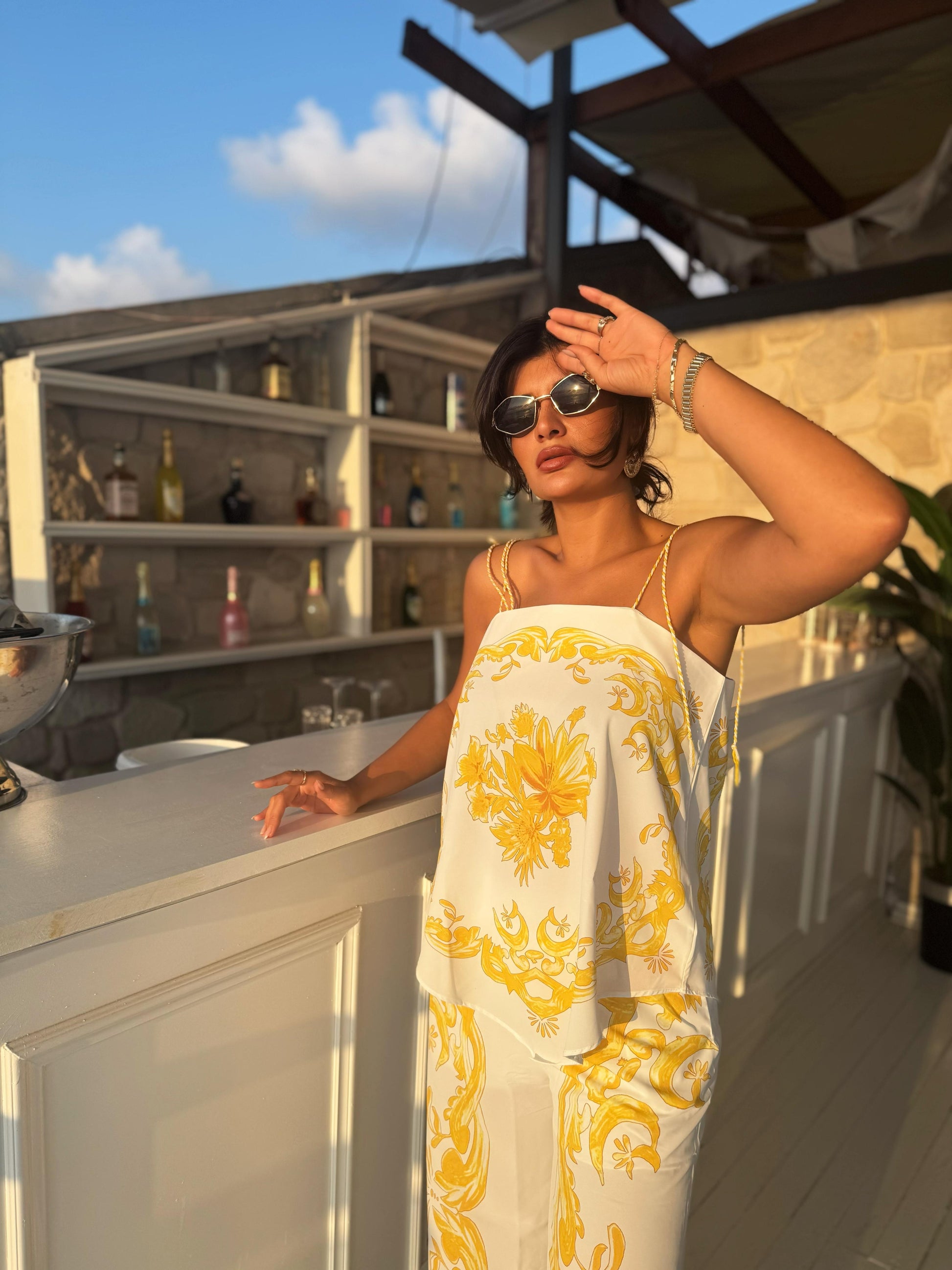 Güneşin enerjisini taşıyan bu sarı asimetrik kesim takım,