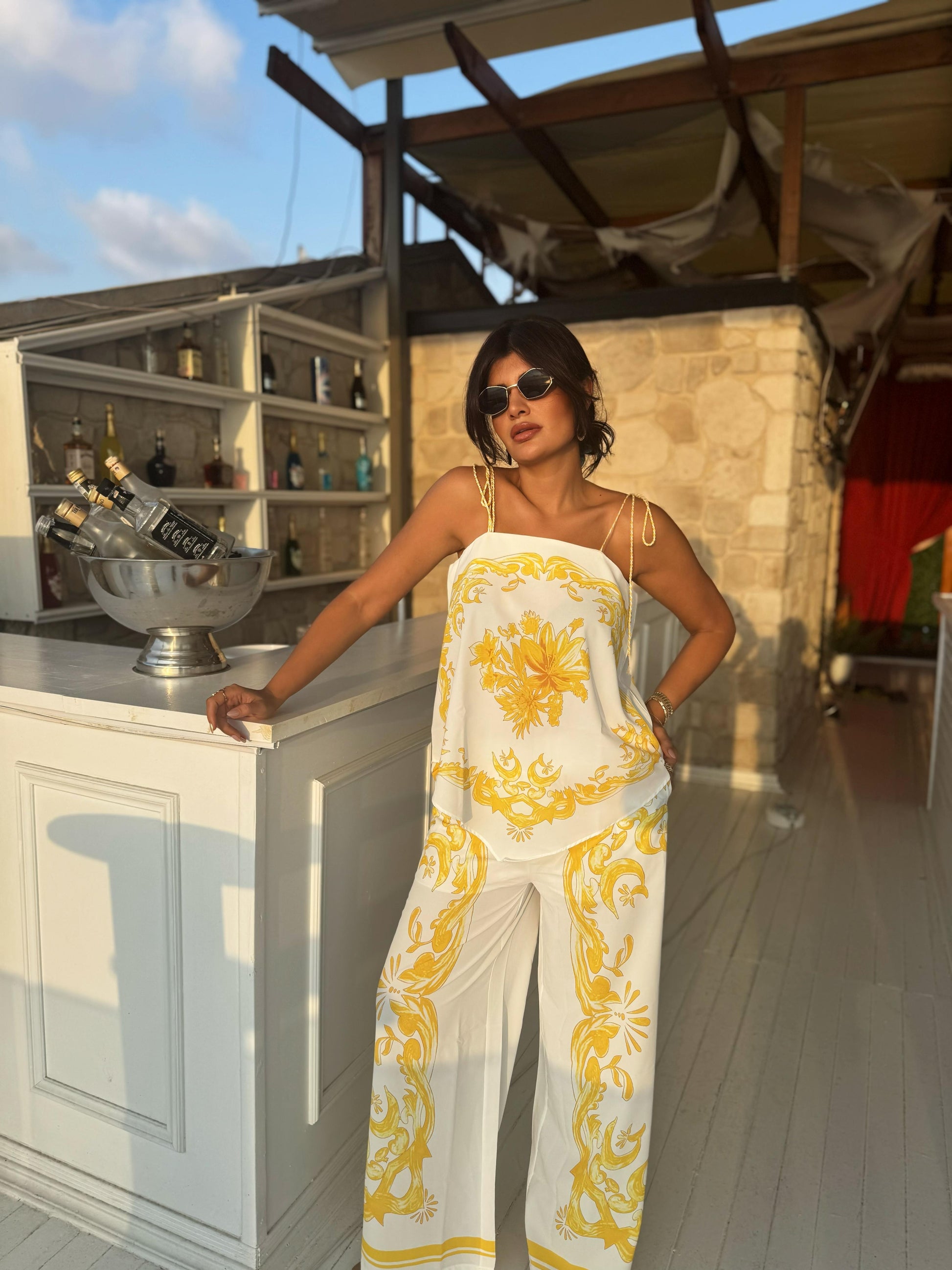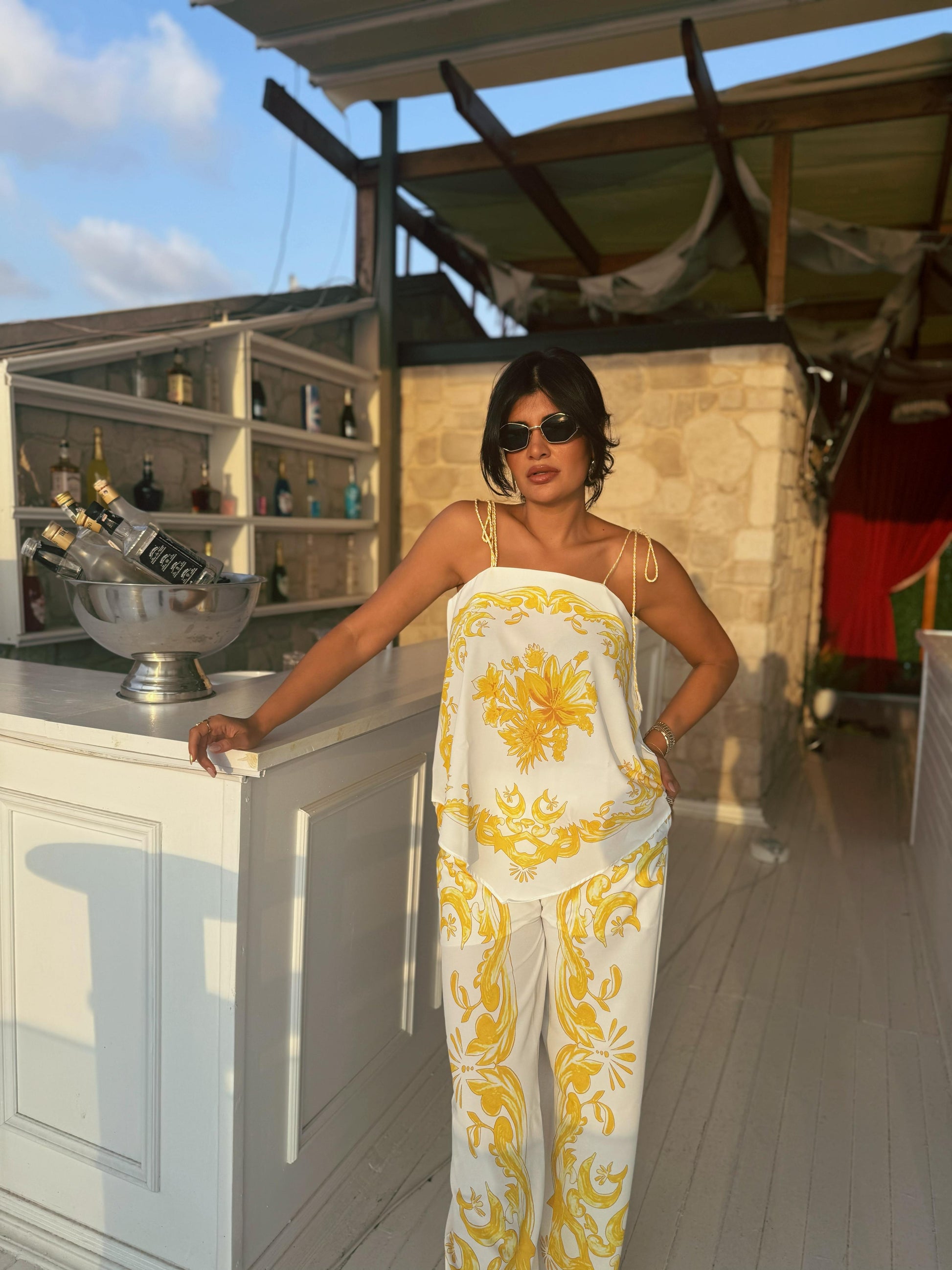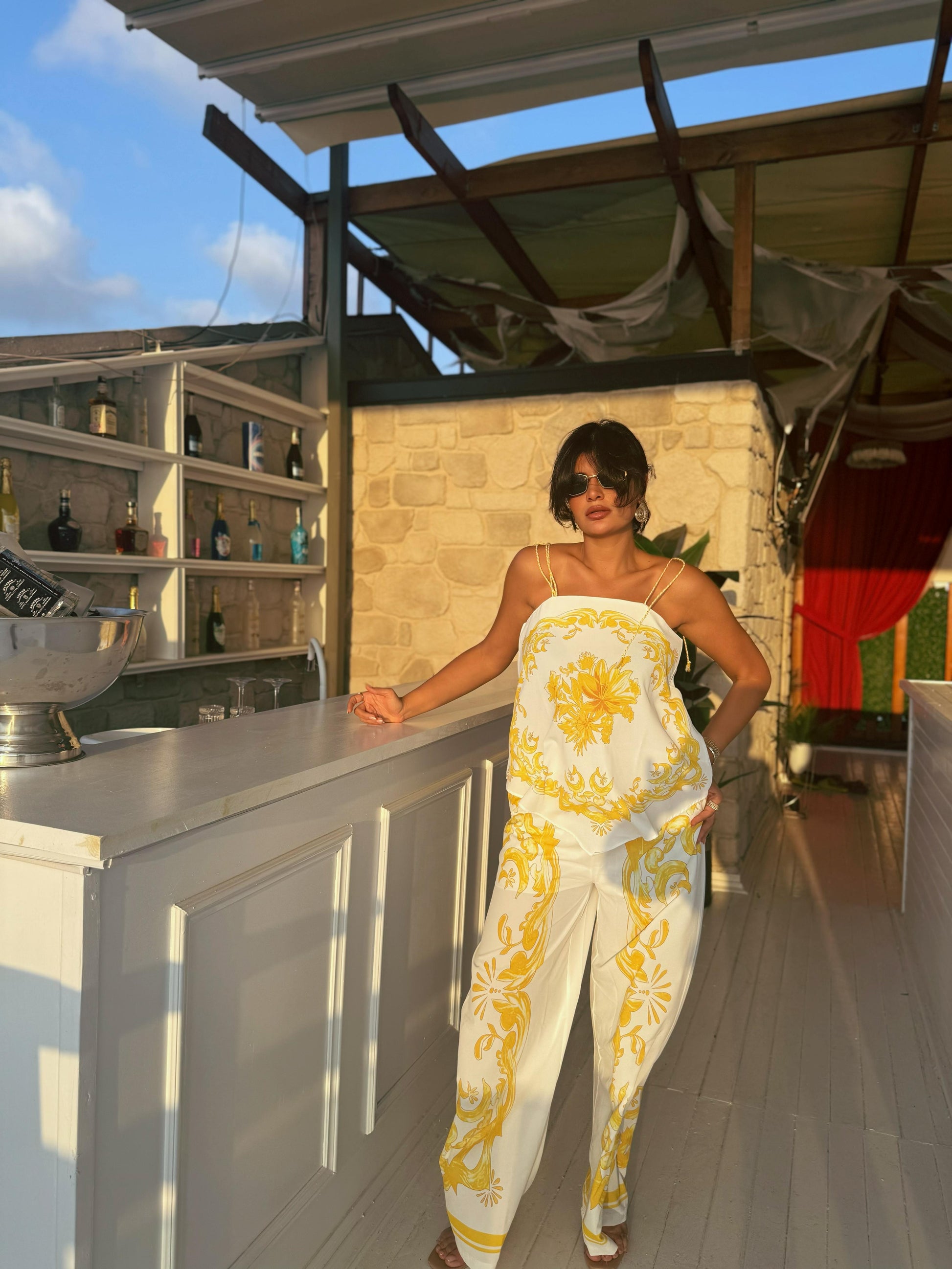 Güneşin enerjisini taşıyan bu sarı asimetrik kesim takım,