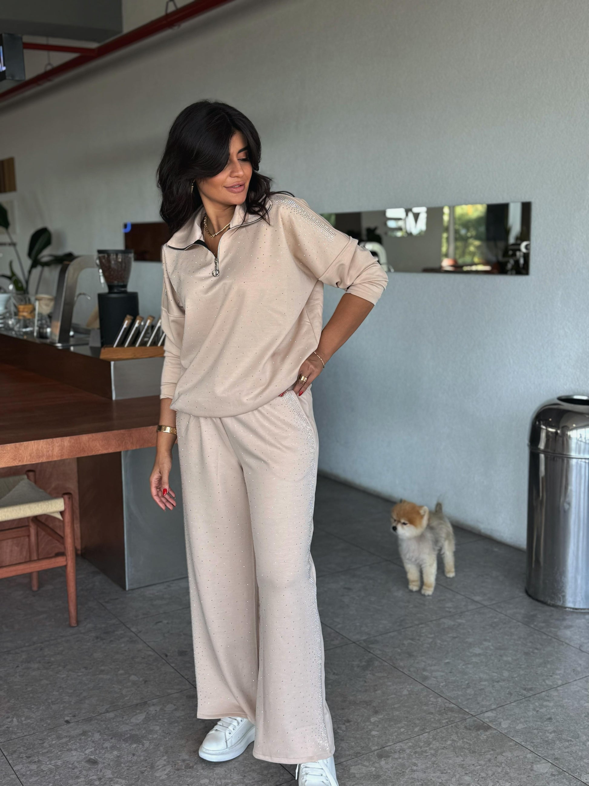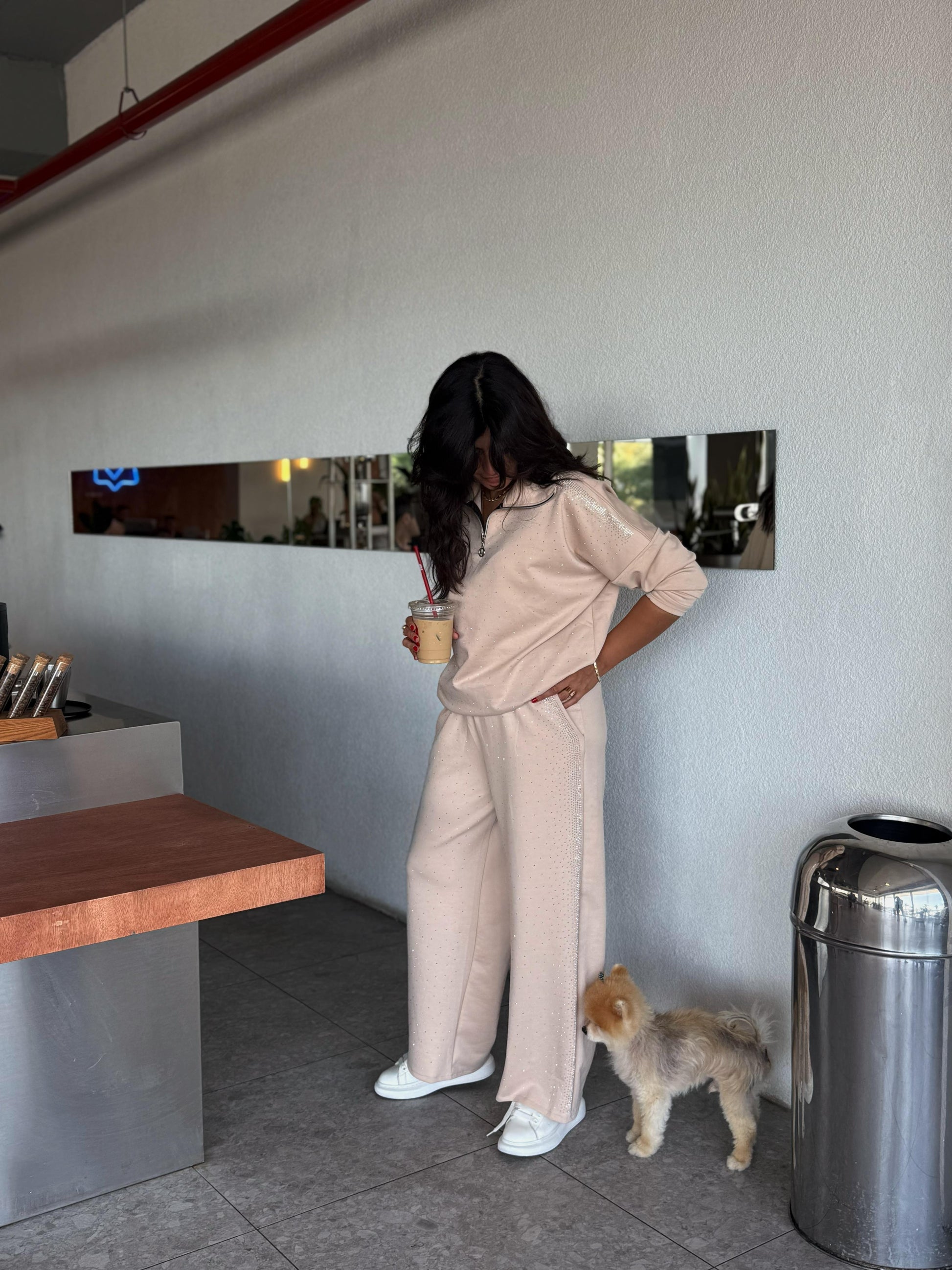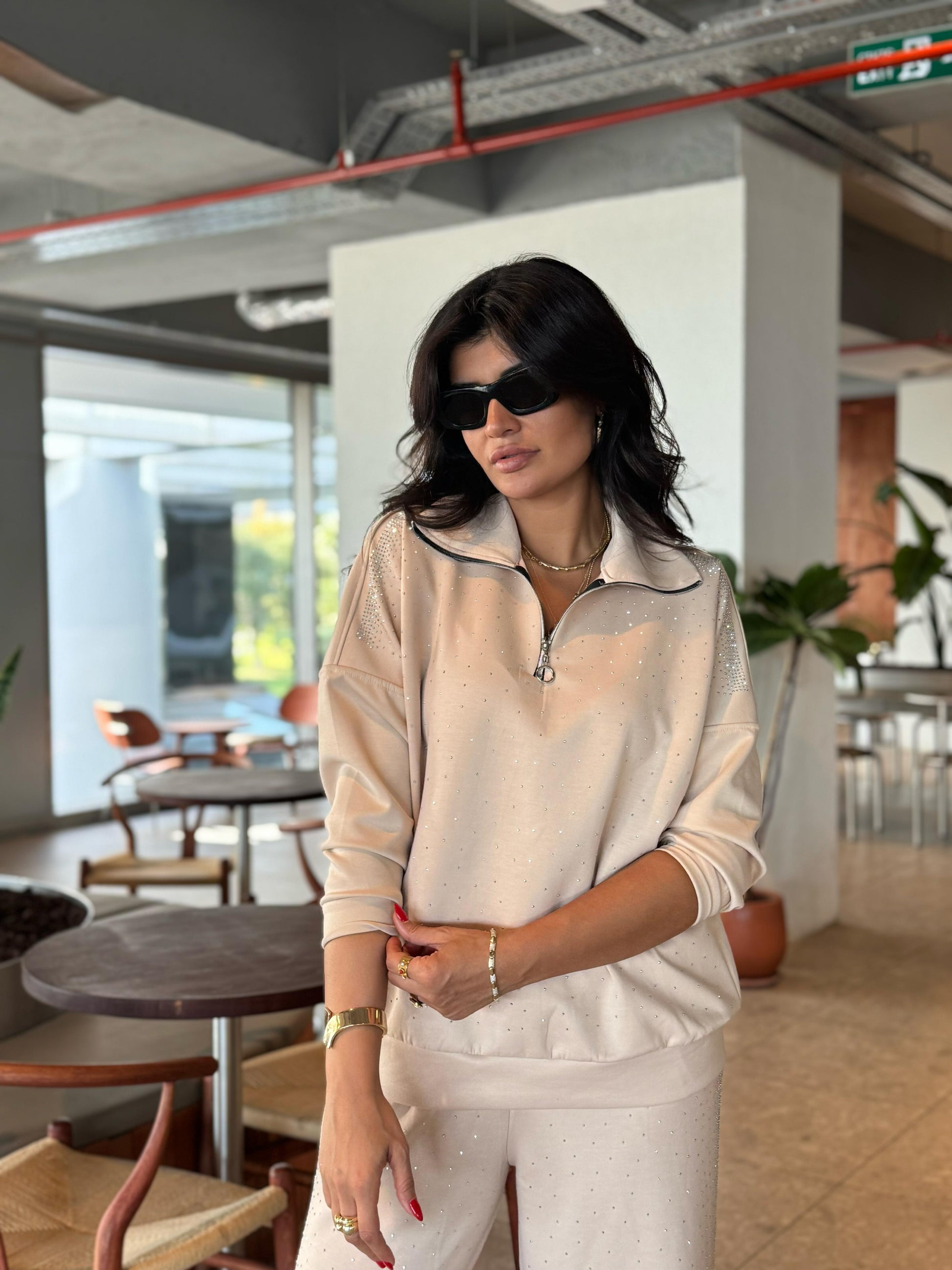 🤍 Oysh Modal Kumaş Taşlı Takım – Bej