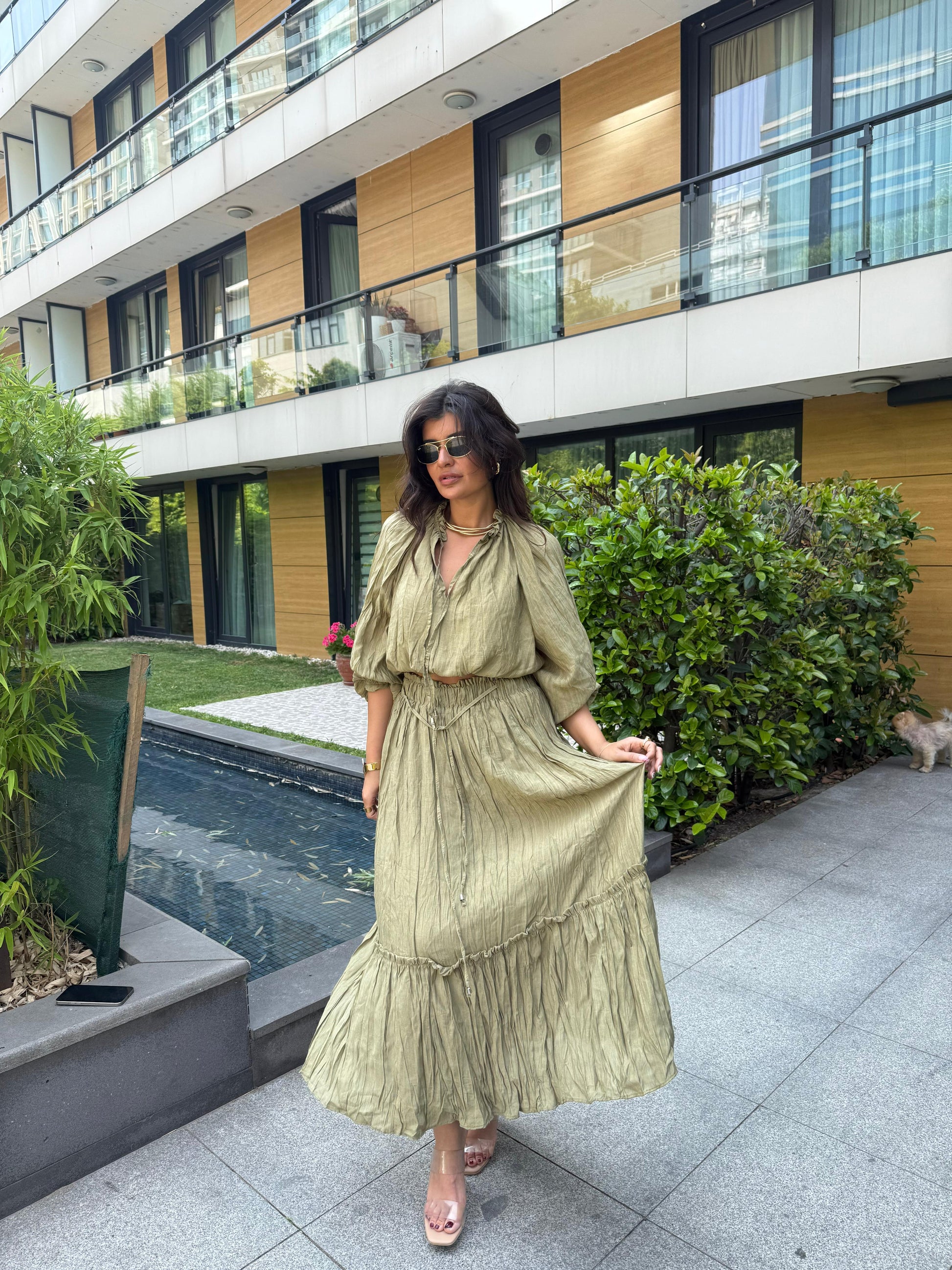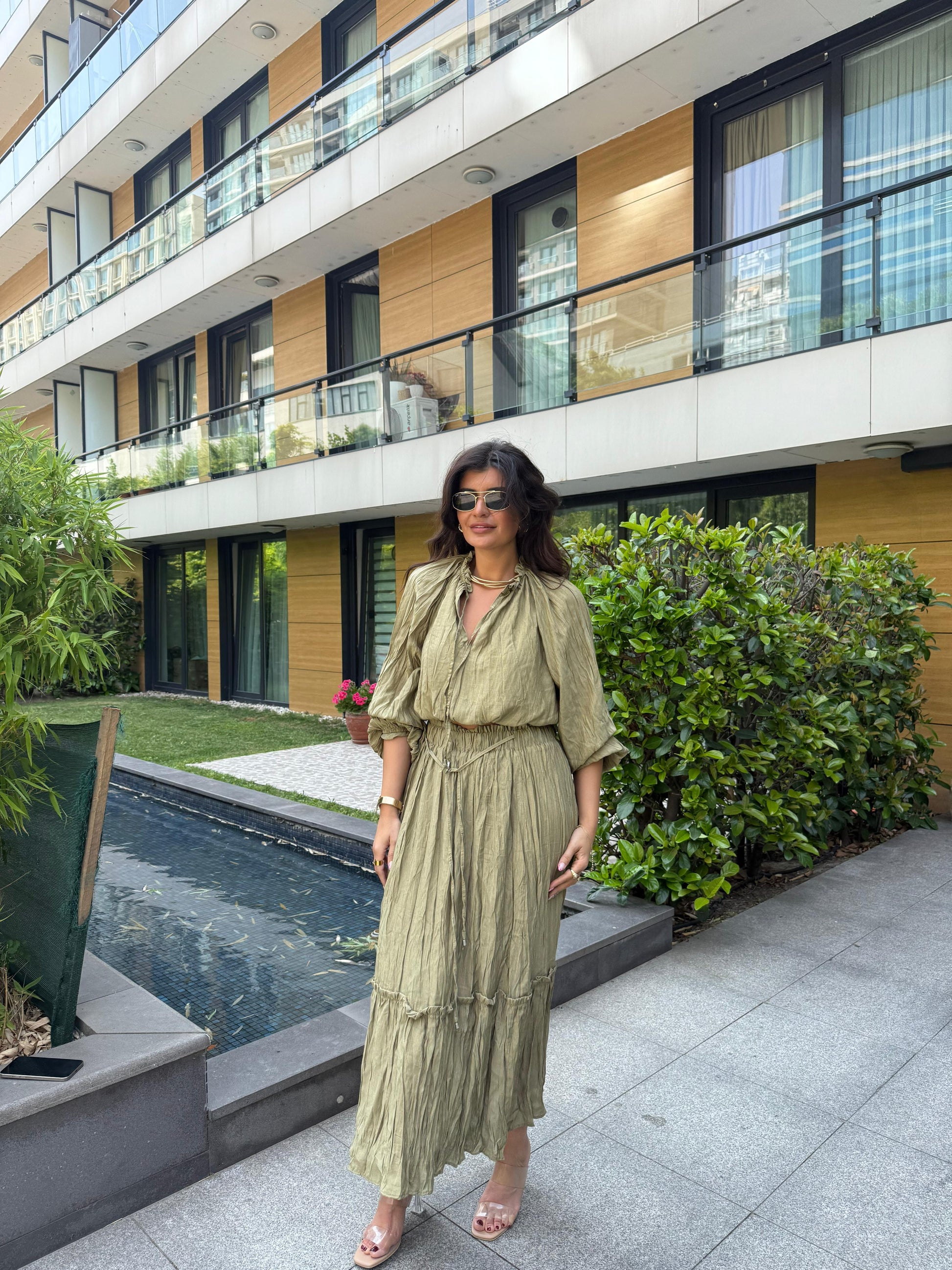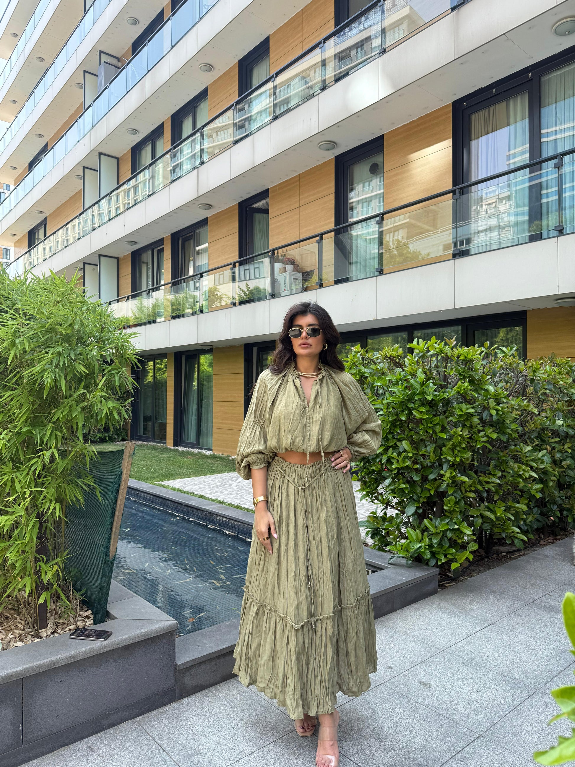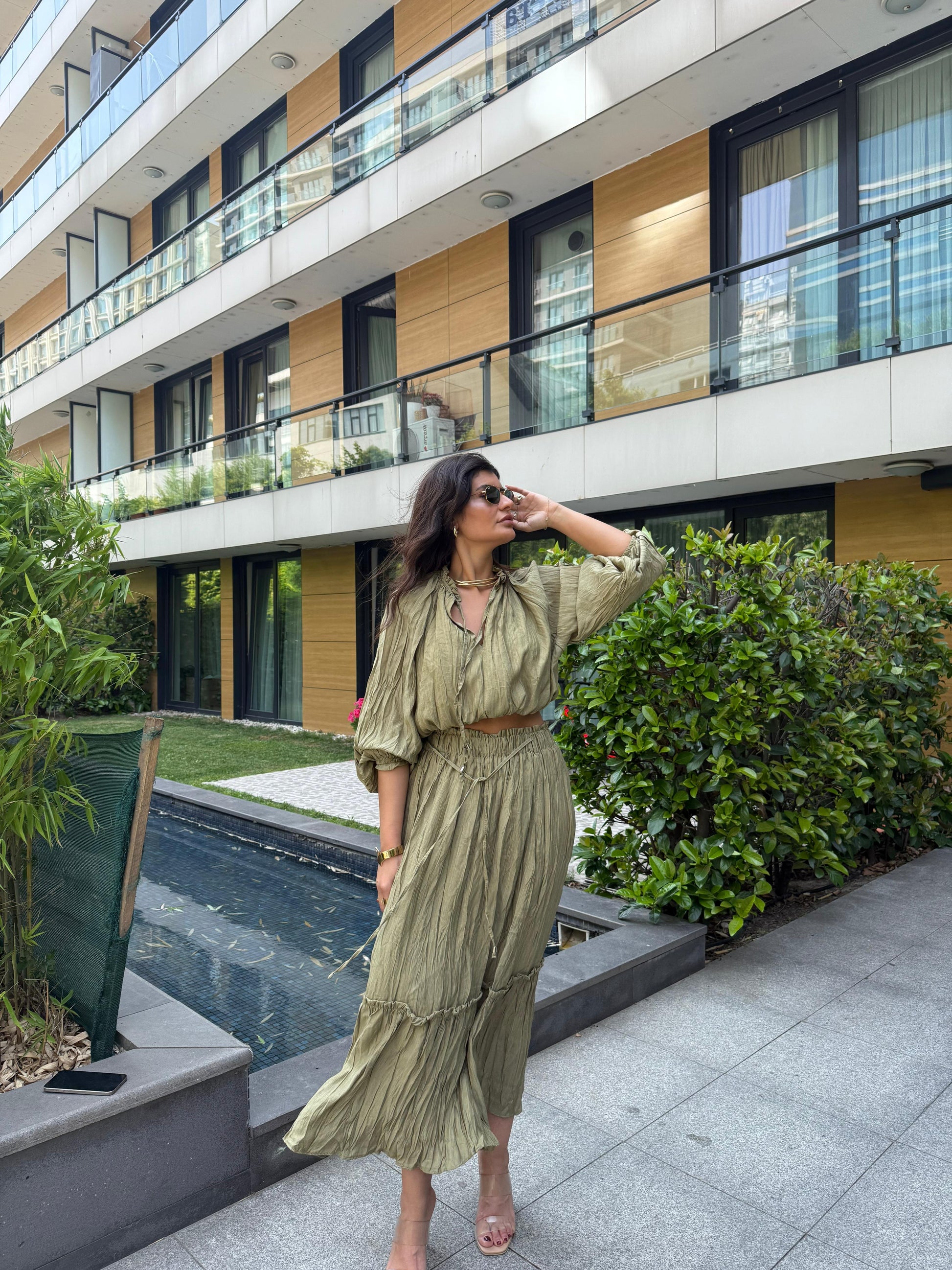 Piliseli Yaka Bağlama Detaylı Etekli Takım | Zeytin Yeşili