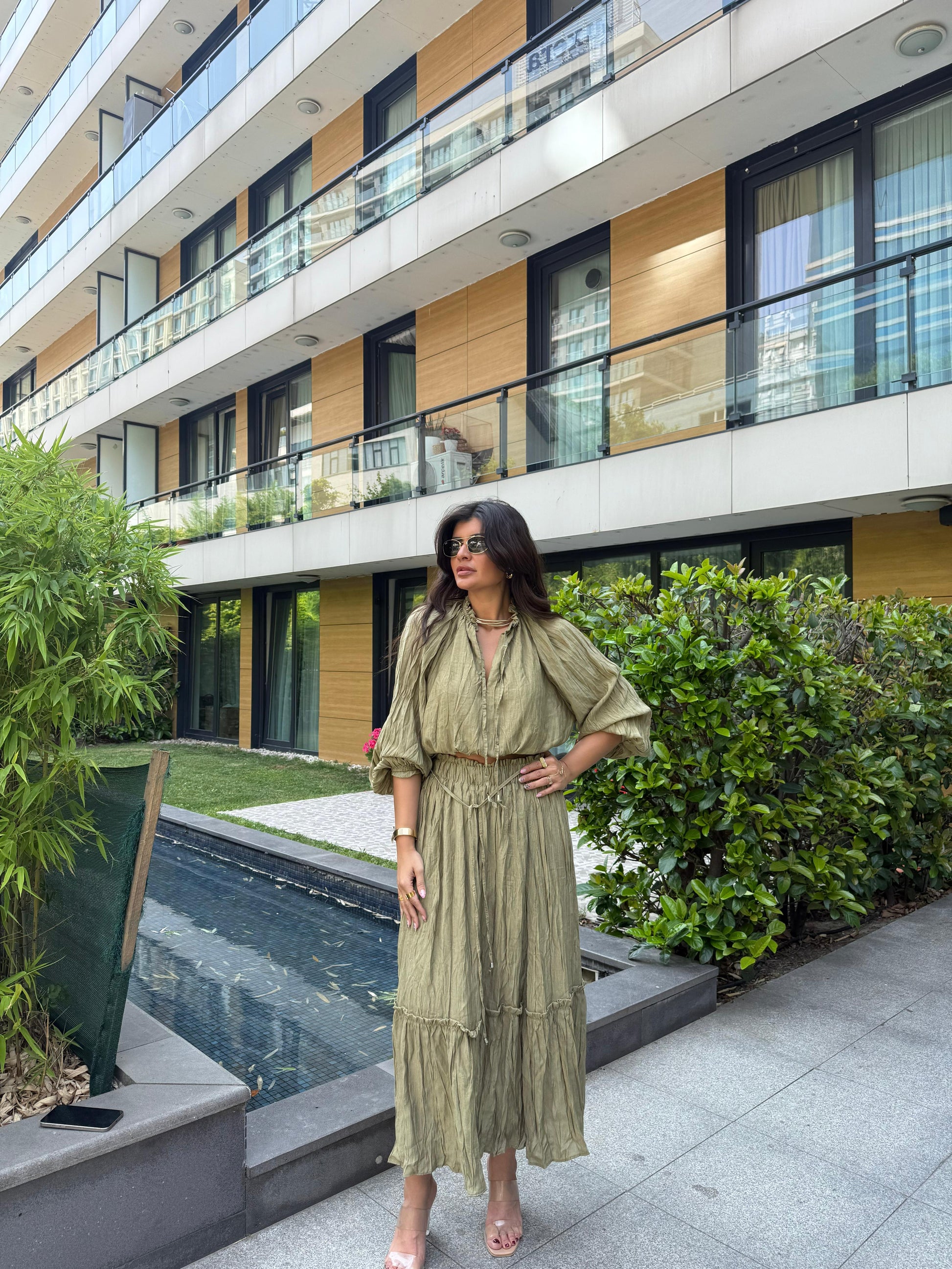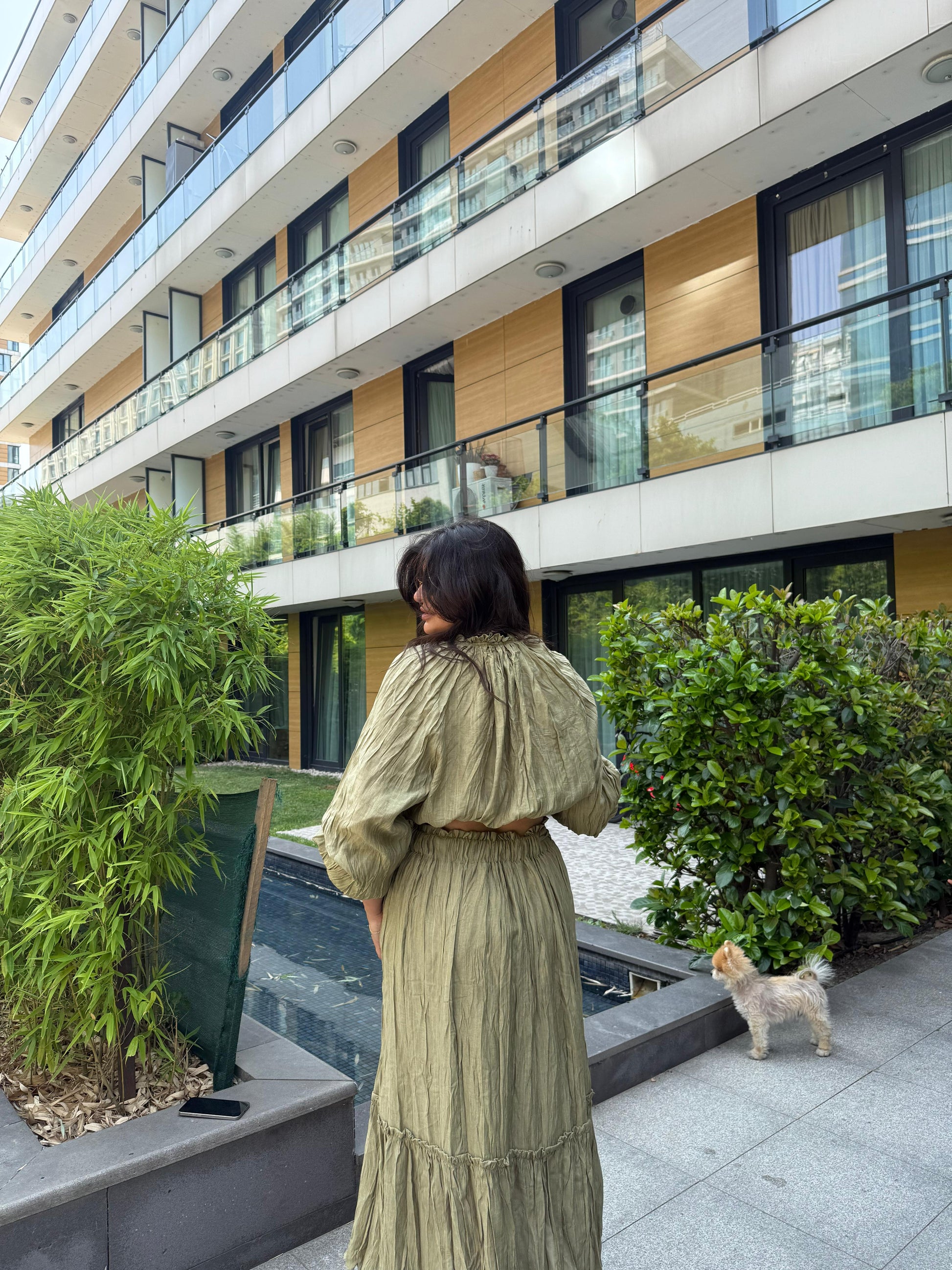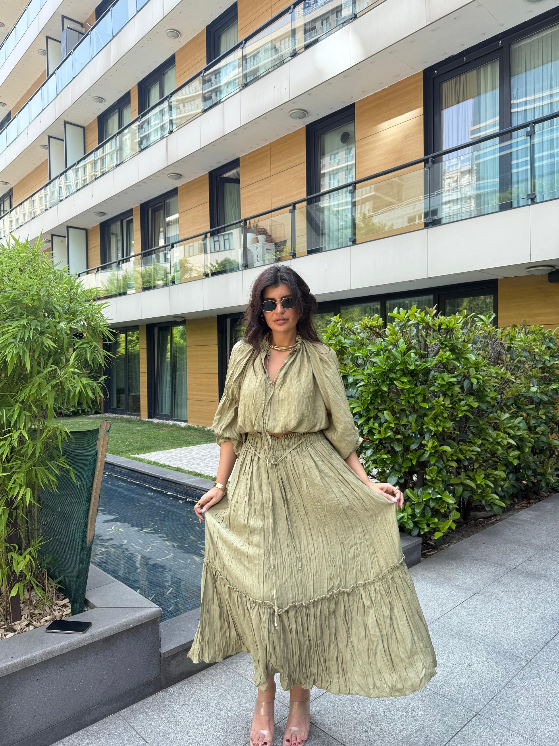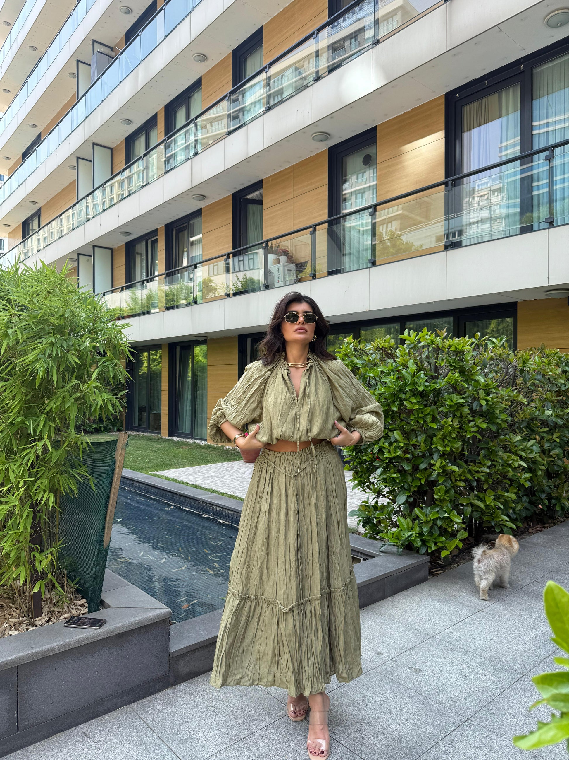 Piliseli Yaka Bağlama Detaylı Etekli Takım | Zeytin Yeşili