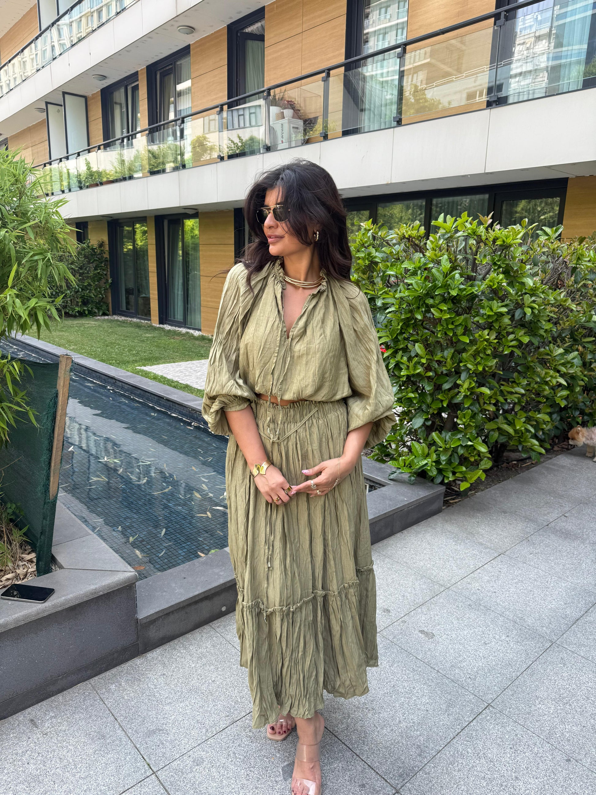 ✨ Pilili Yaka Bağlama Detaylı Etekli Takım | Zeytin Yeşili