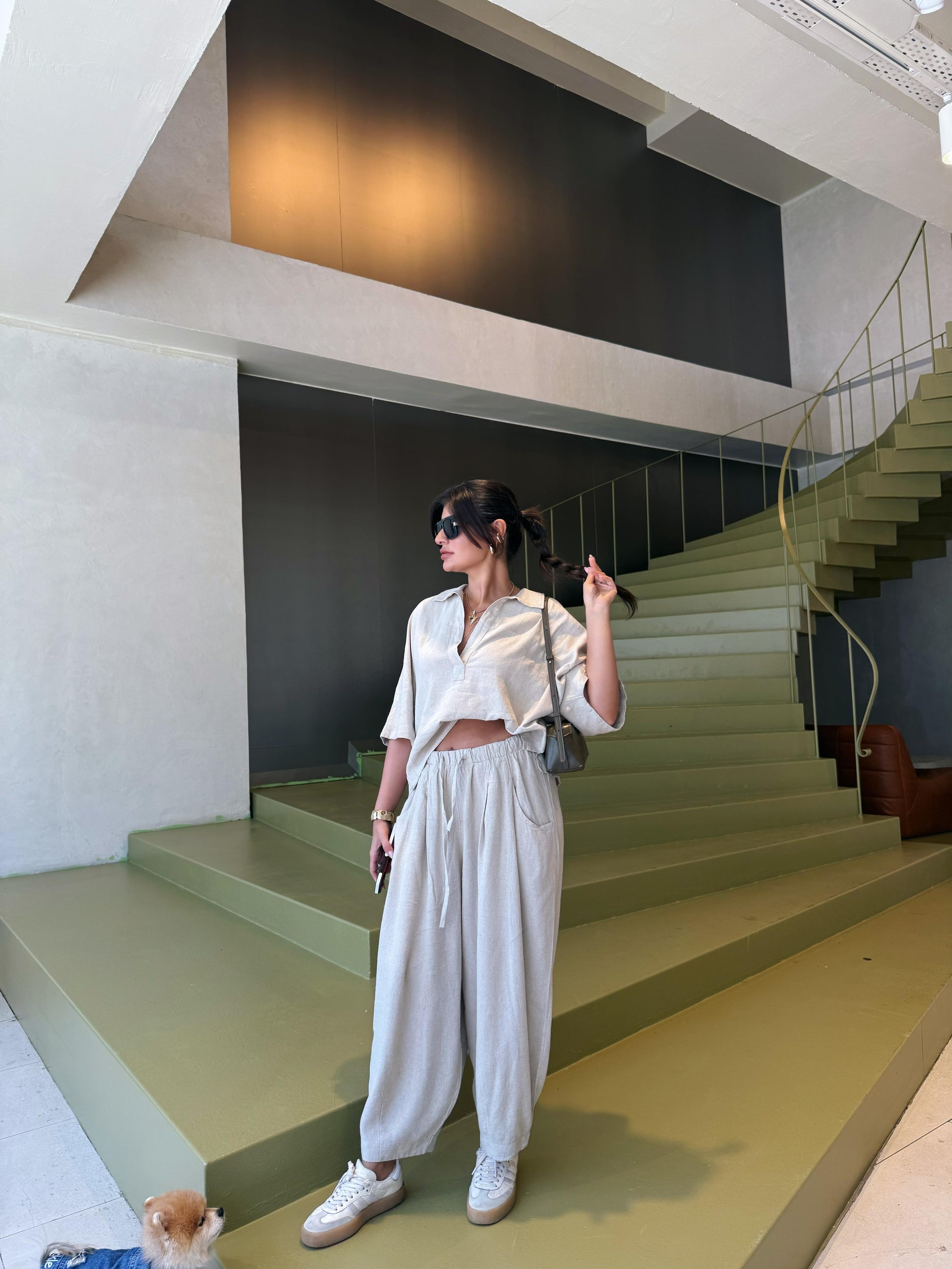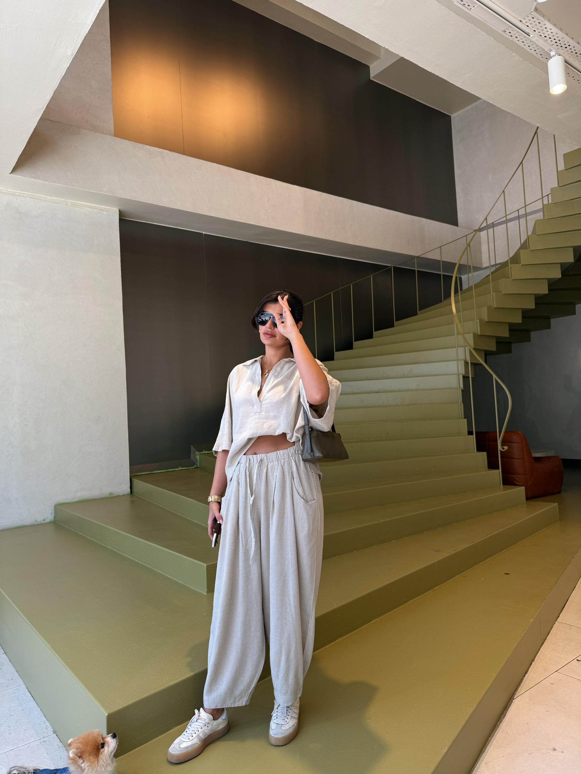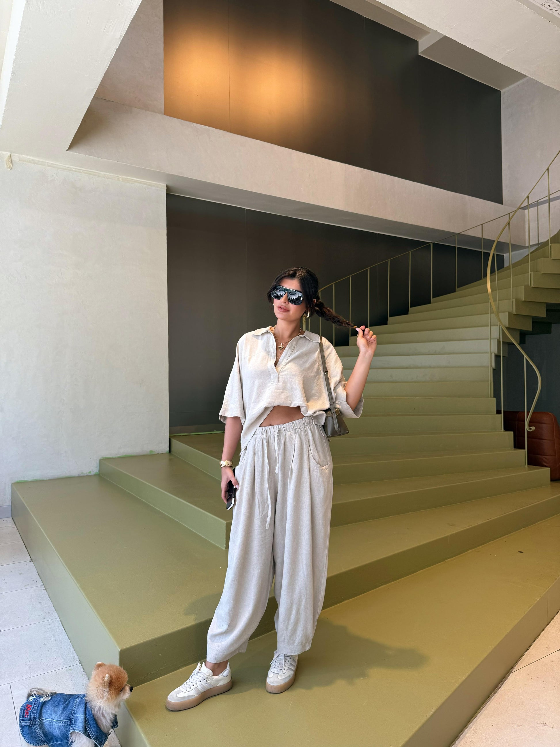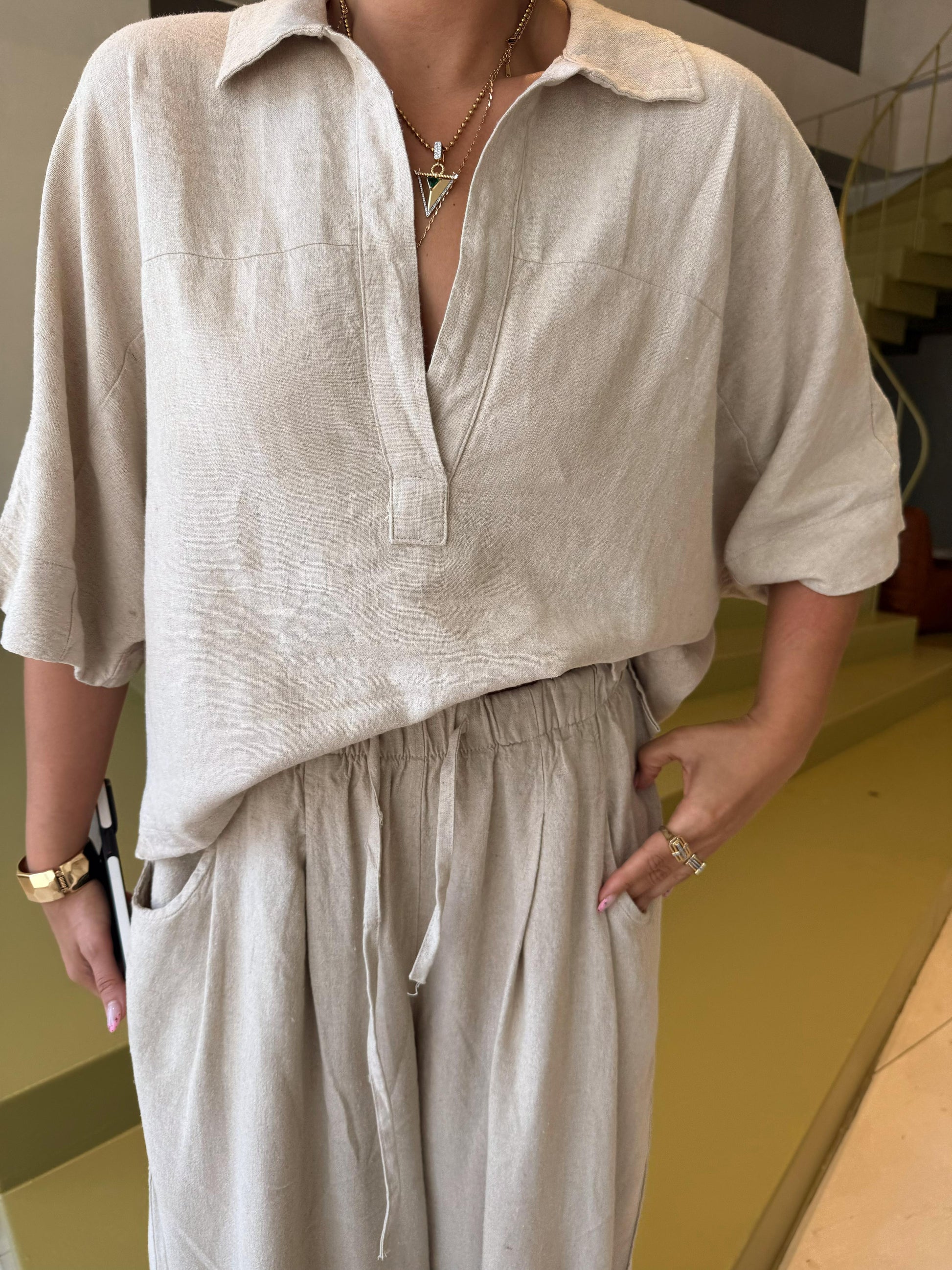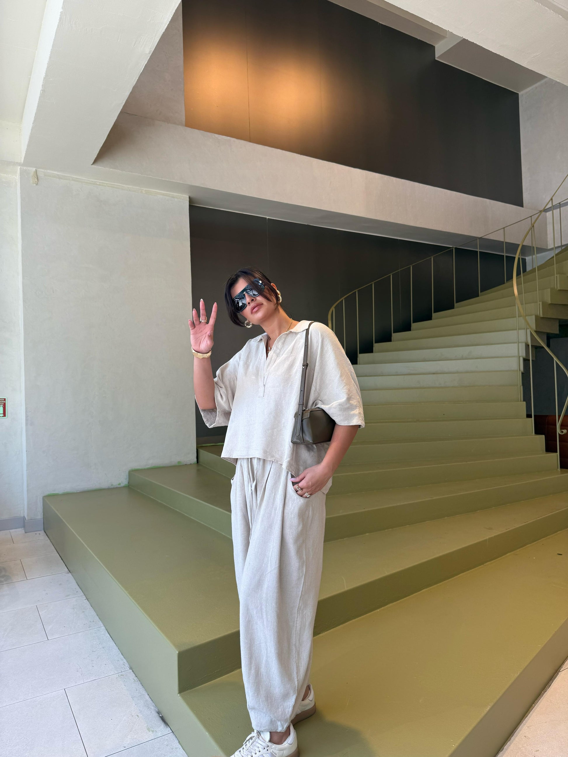 Bol paça şalvar pantolonu ve dökümlü üstüyle şehir stilinde fark yaratır. Keten yapısı teri emer, sıcak havalarda rahatlık sunar.
