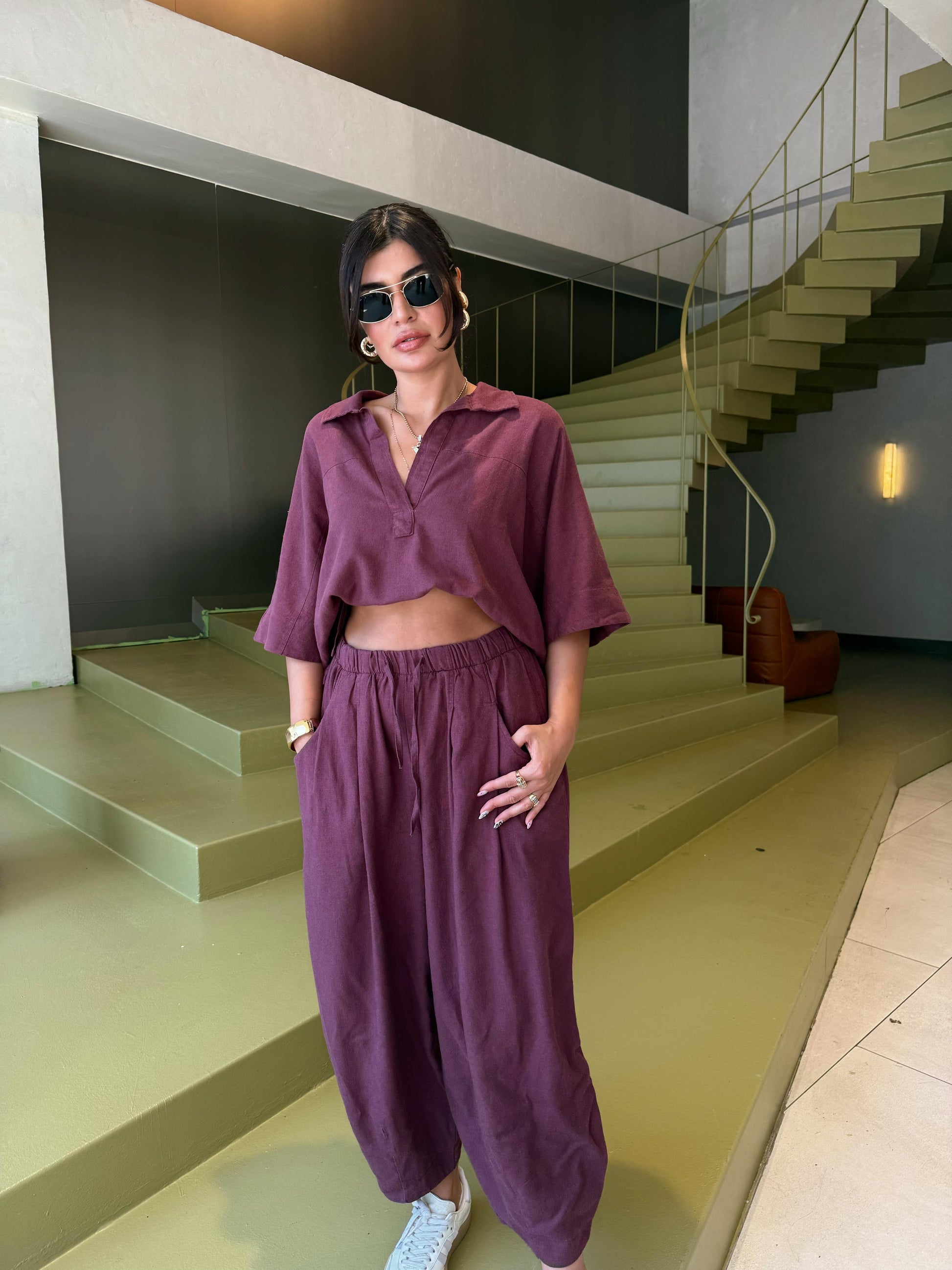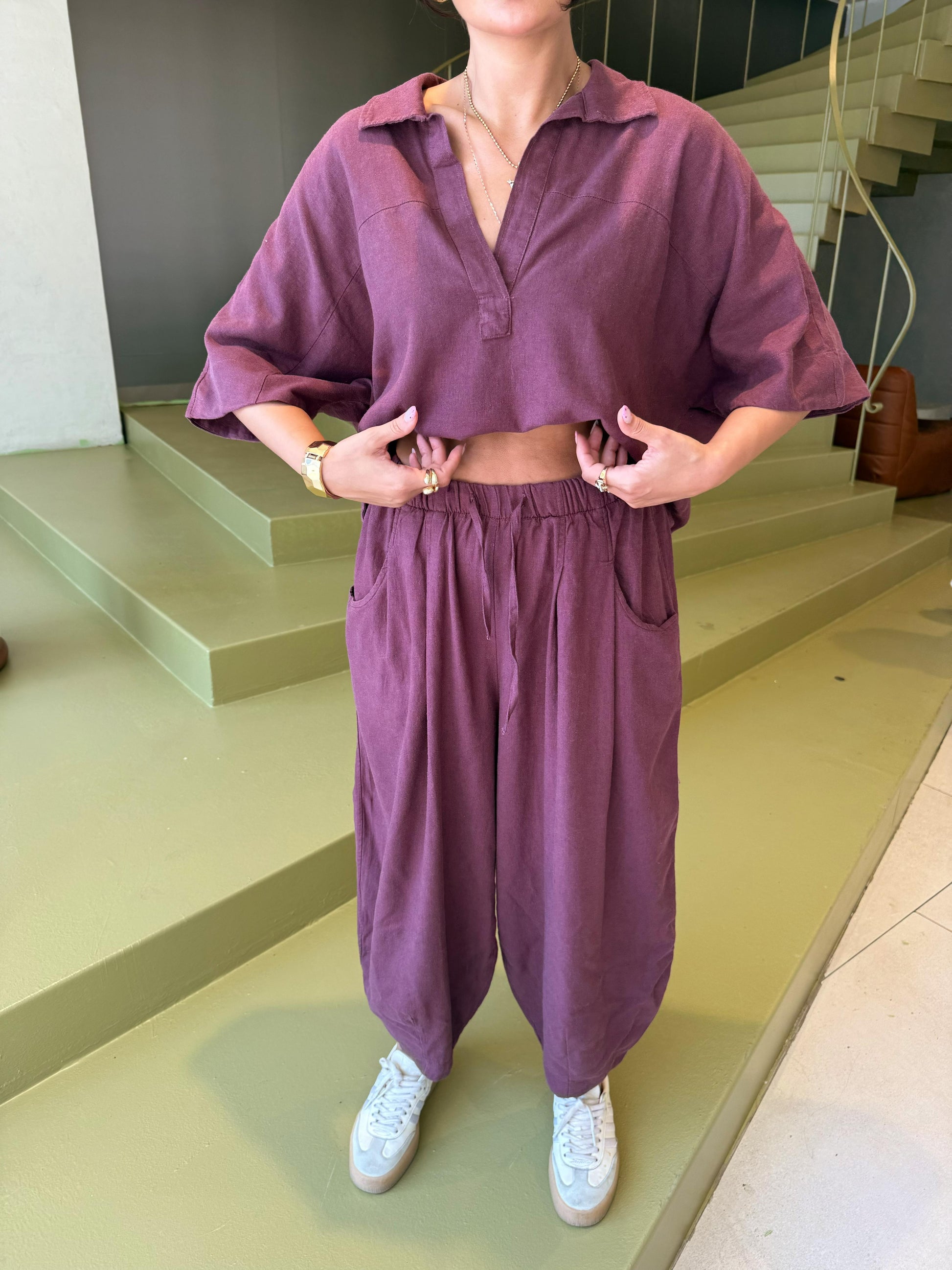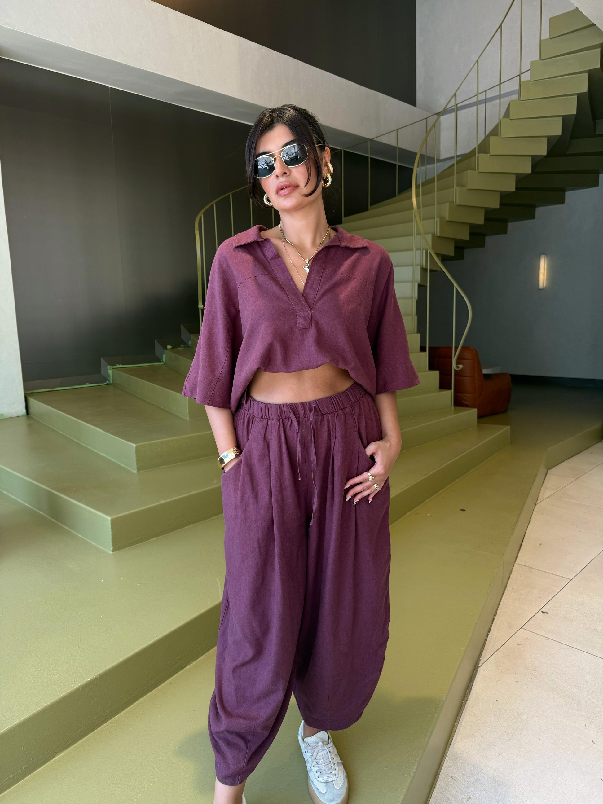 Bol paça şalvar pantolonu ve dökümlü üstüyle şehir stilinde fark yaratır. Keten yapısı teri emer, sıcak havalarda rahatlık sunar.