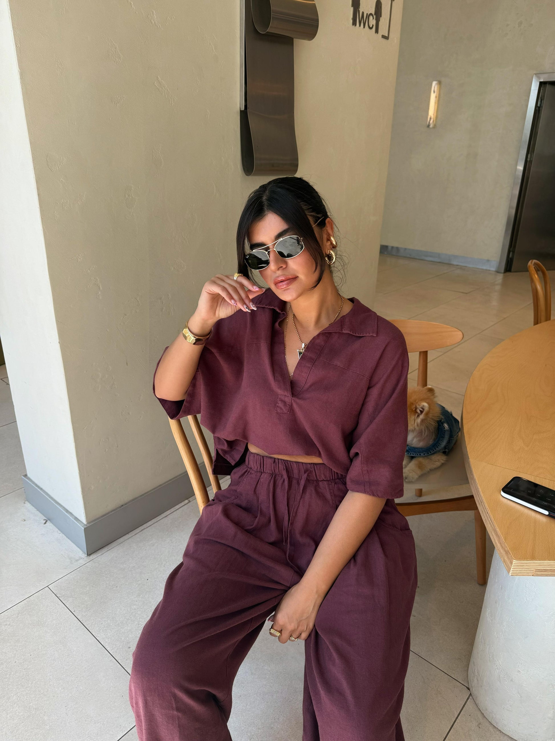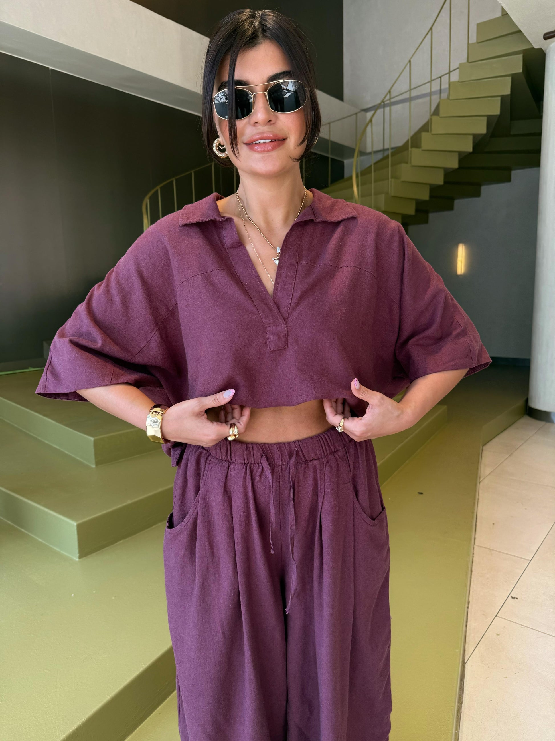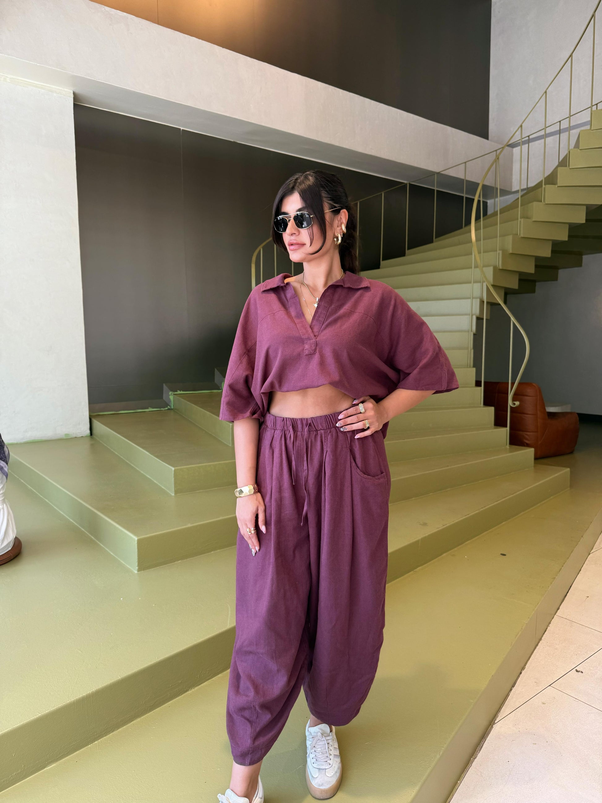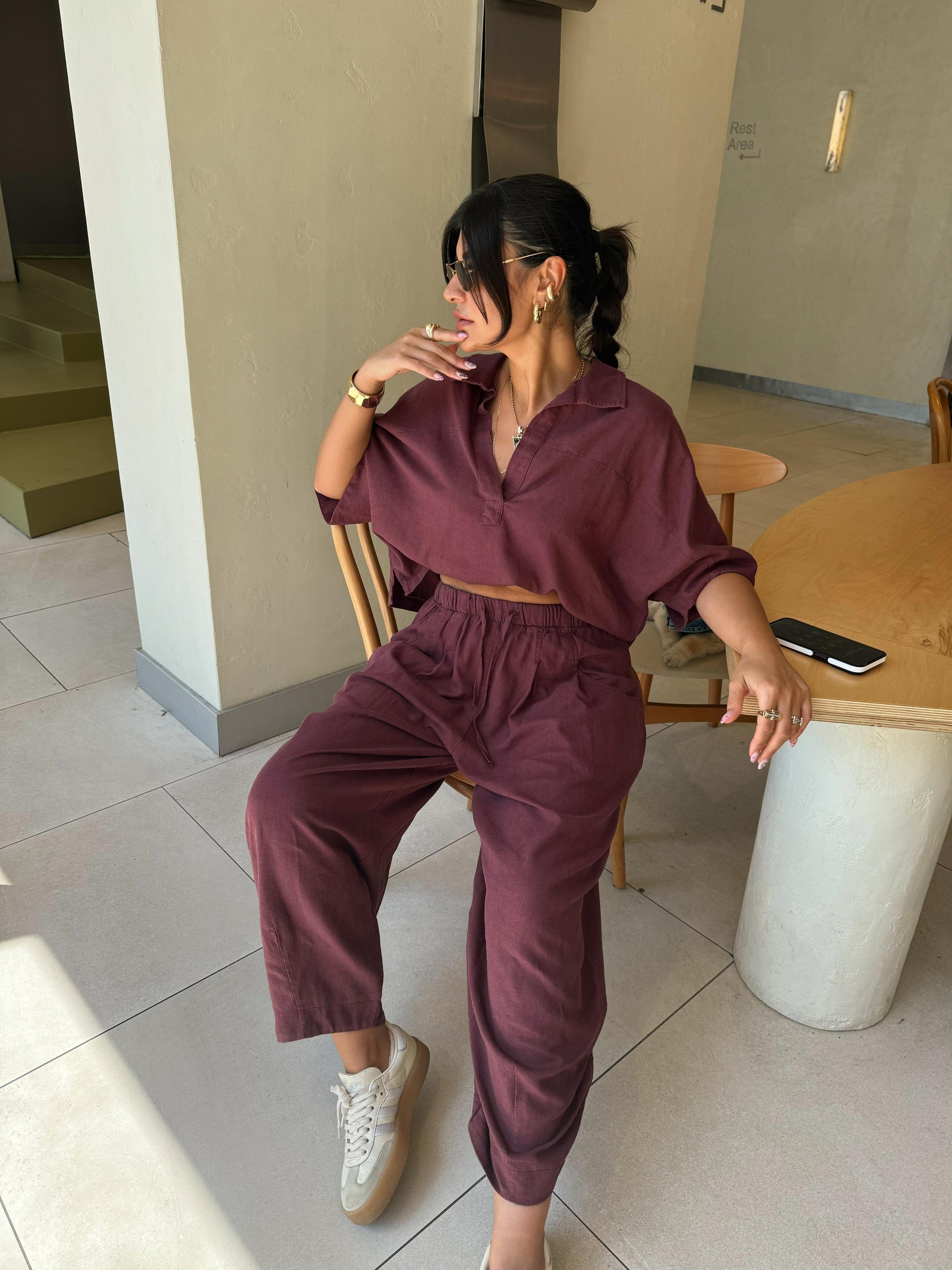 Bol paça şalvar pantolonu ve dökümlü üstüyle şehir stilinde fark yaratır. Keten yapısı teri emer, sıcak havalarda rahatlık sunar.