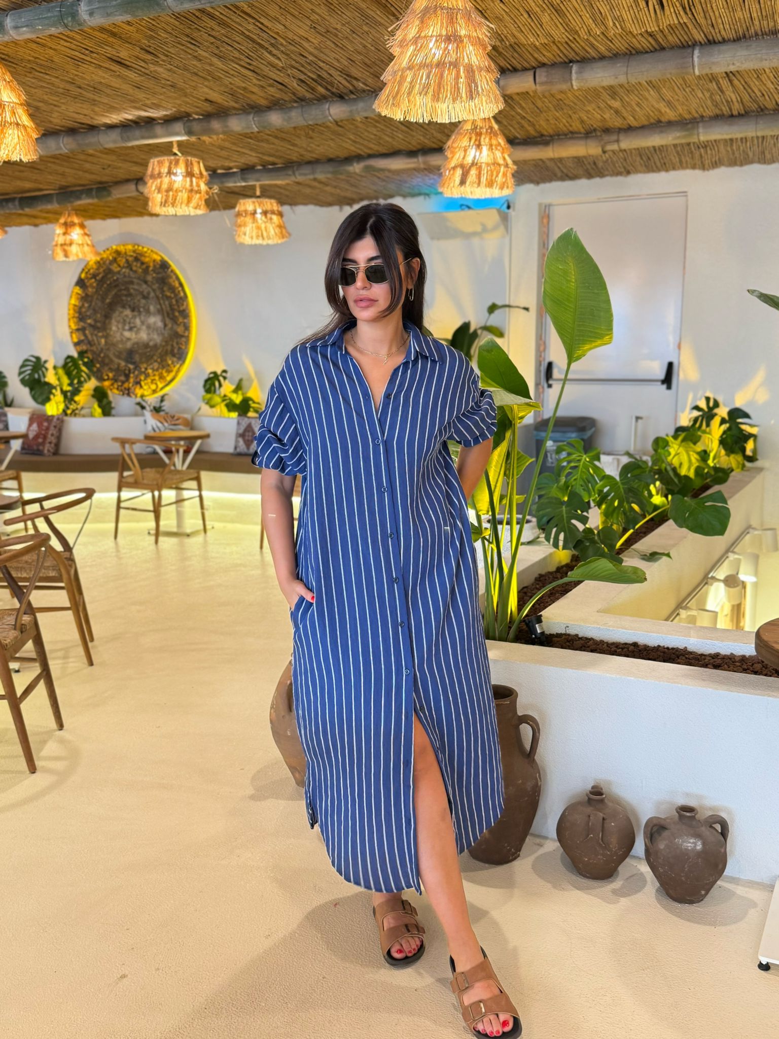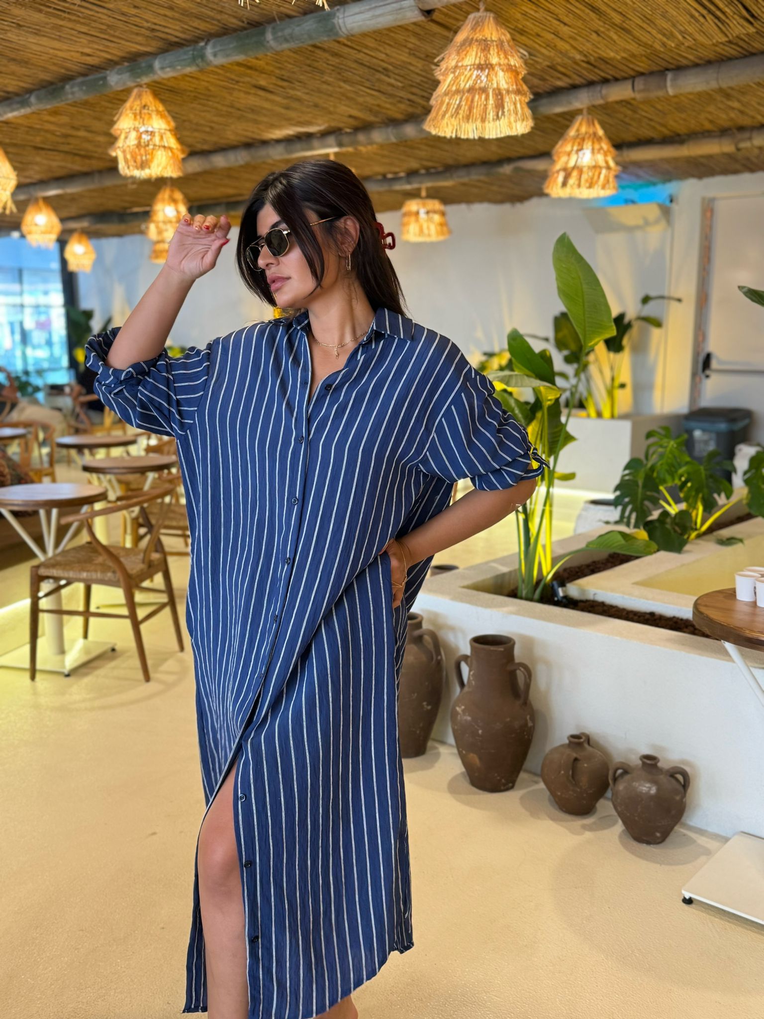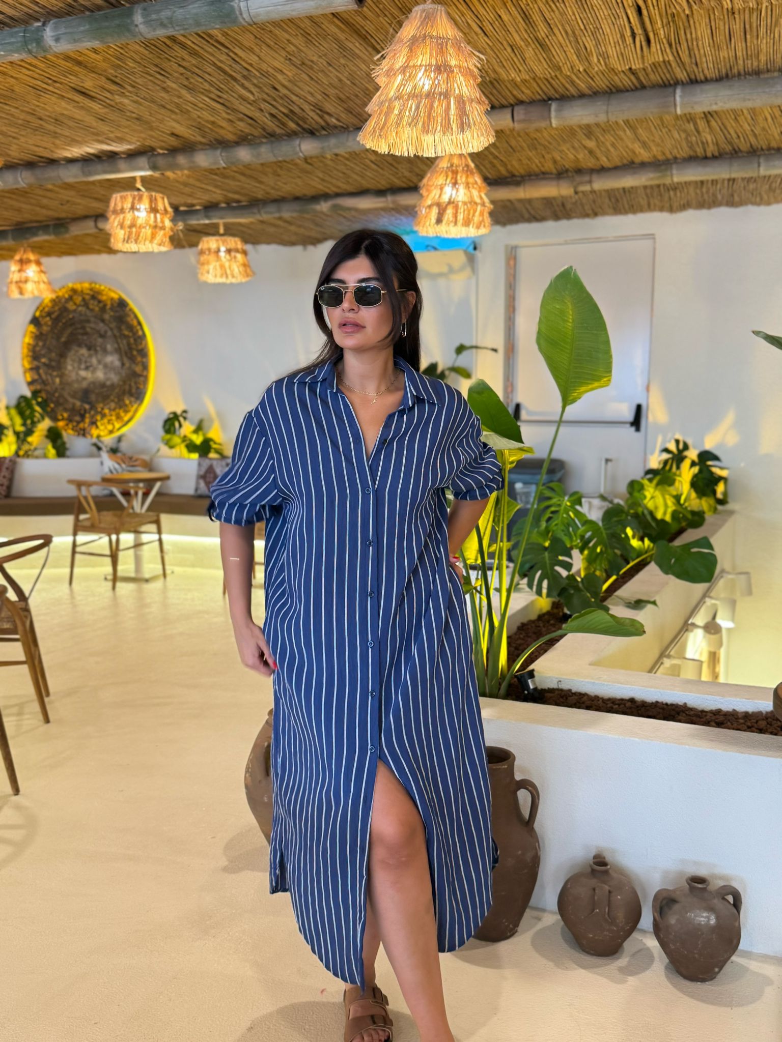 Tensel kumaşın yumuşacık dokusu ile buluşan bu çizgili salaş gömlek elbise, yaz kombinlerinizin en rahat parçası olacak.