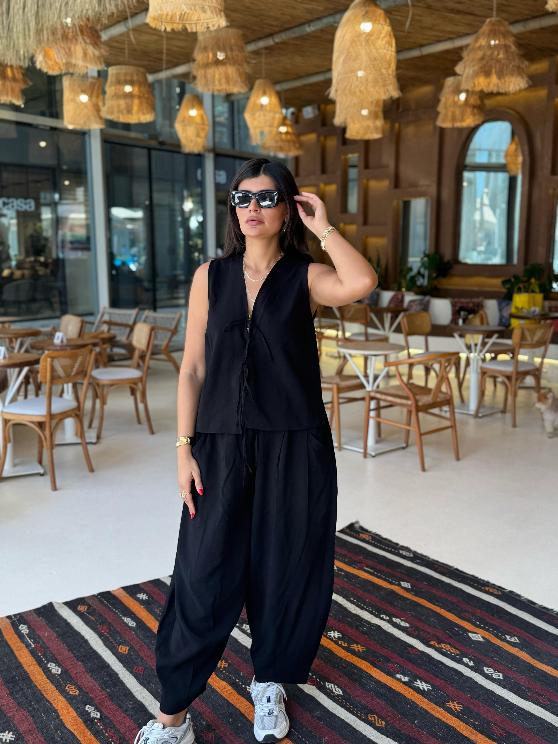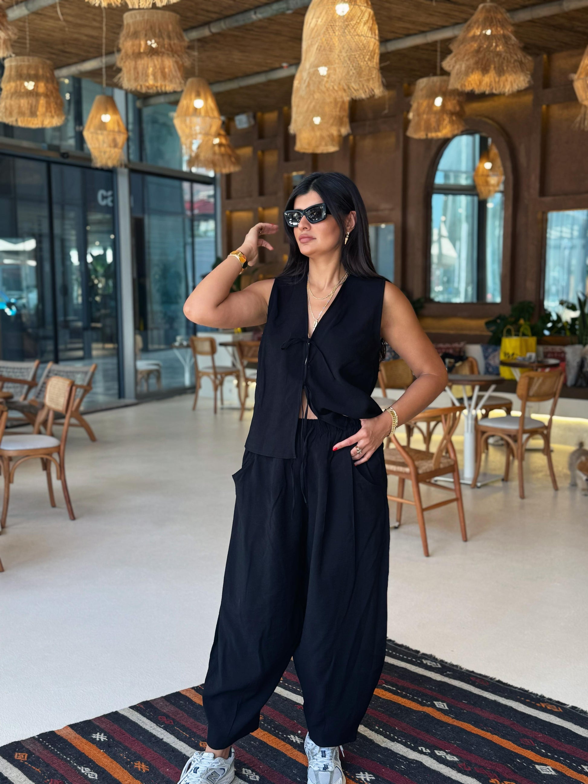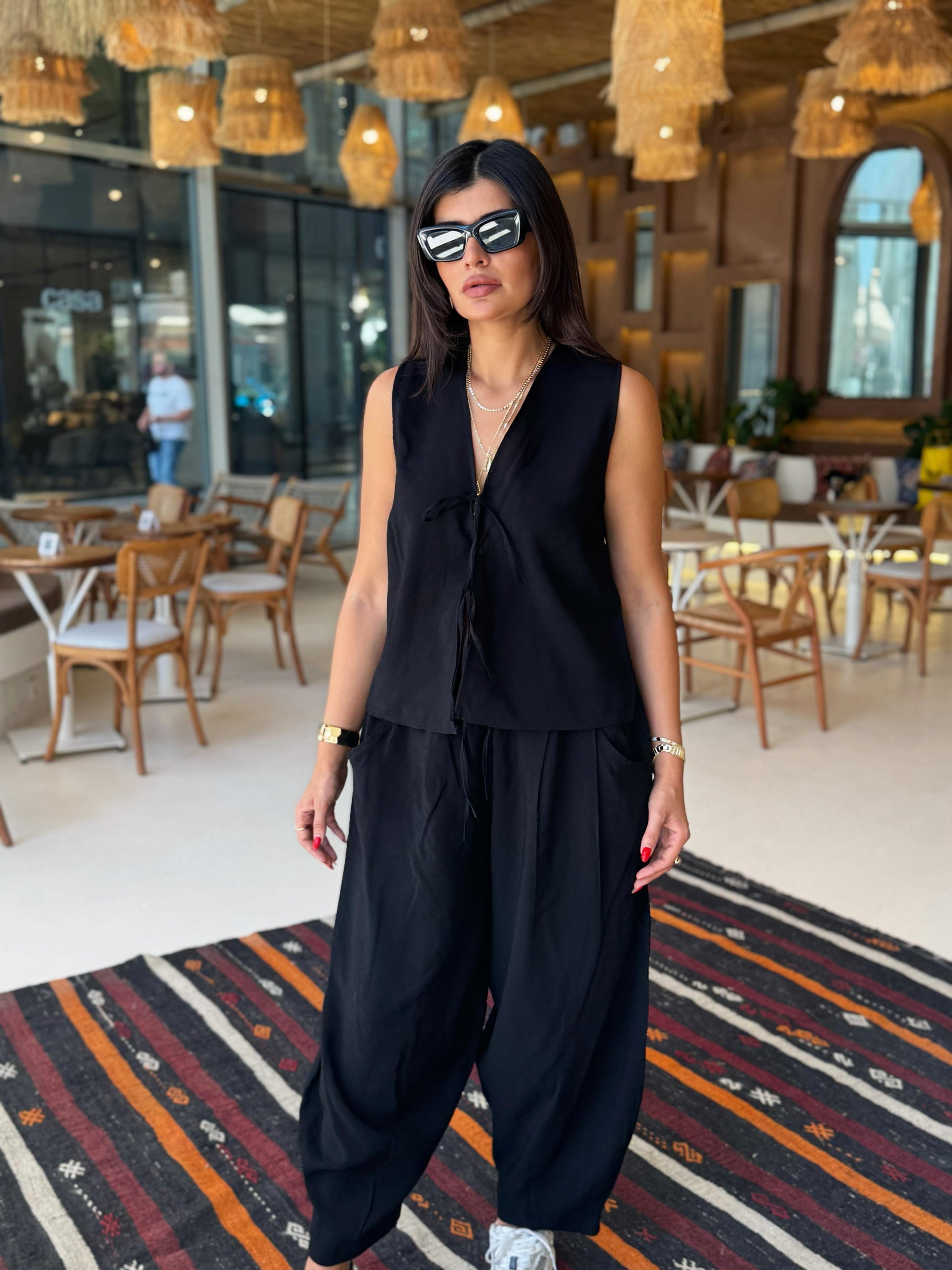 Minimalist tasarımı ve akışkan yapısıyla dikkat çeken bu siyah tencel takım: