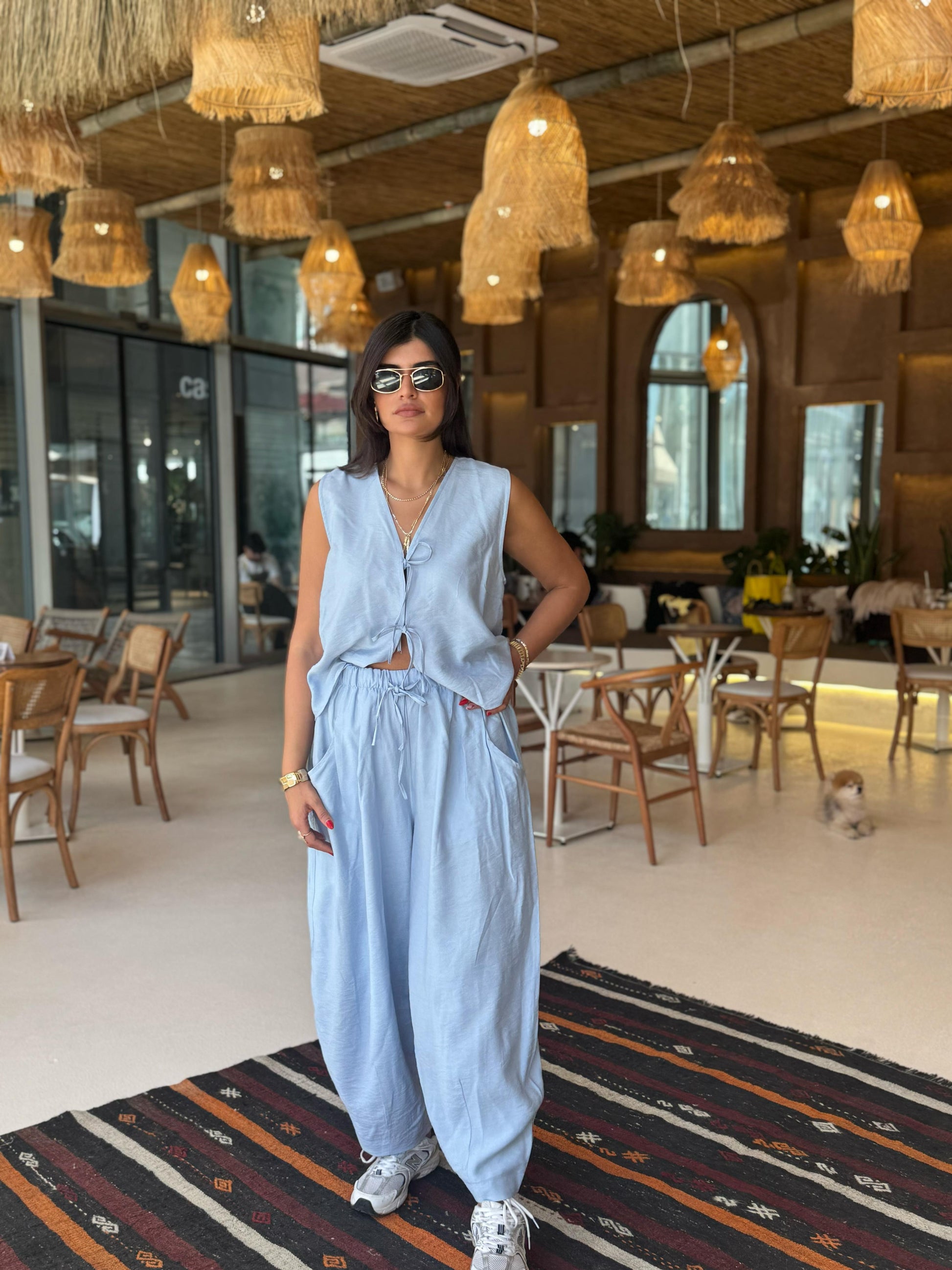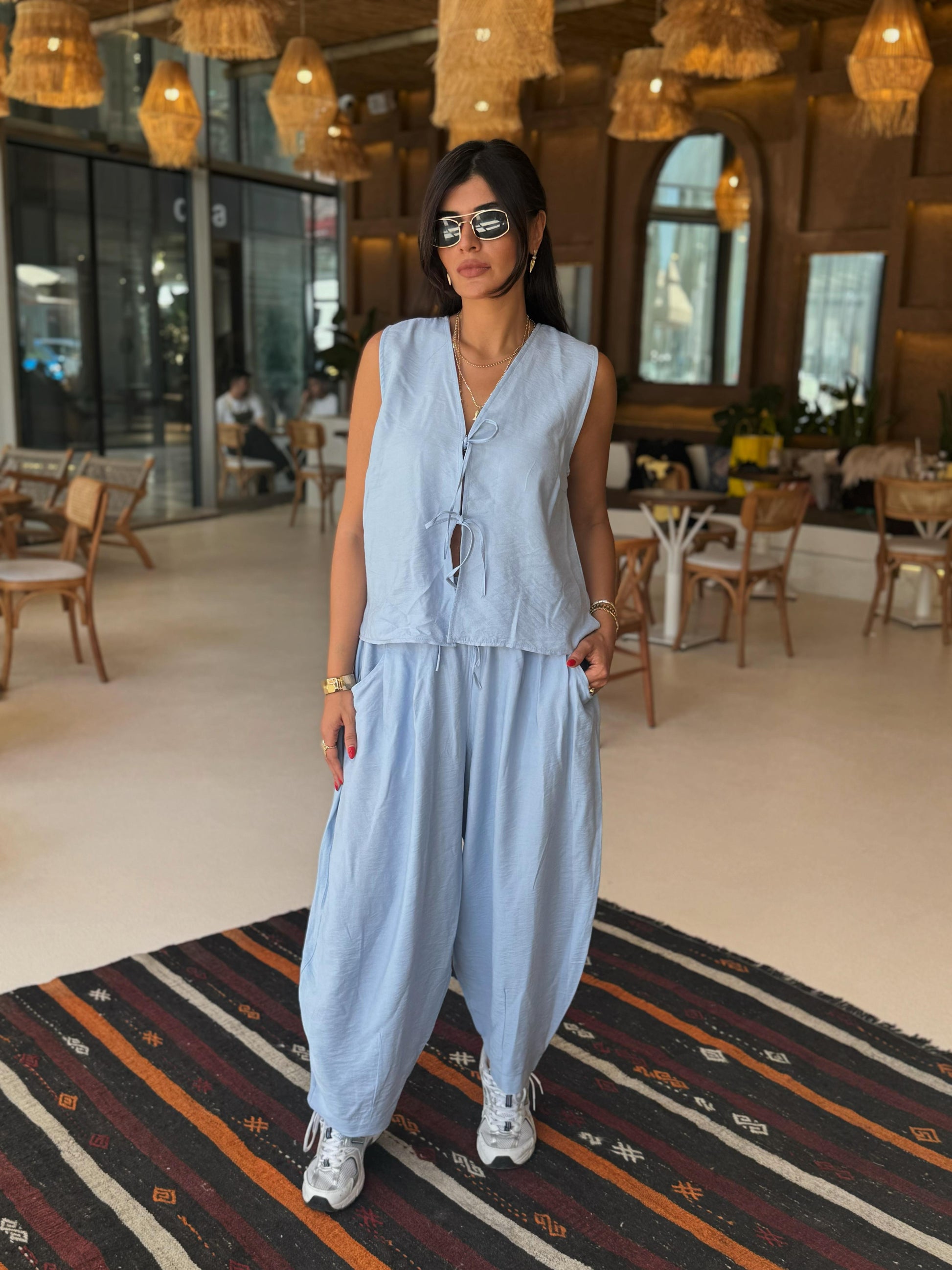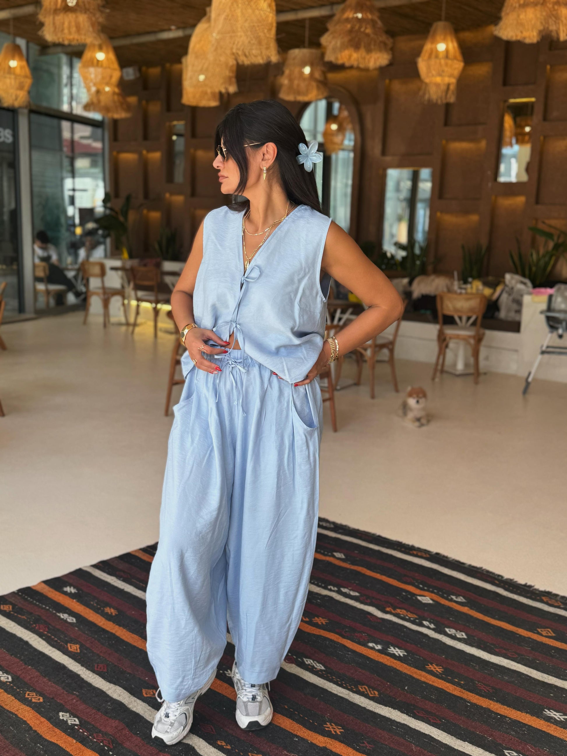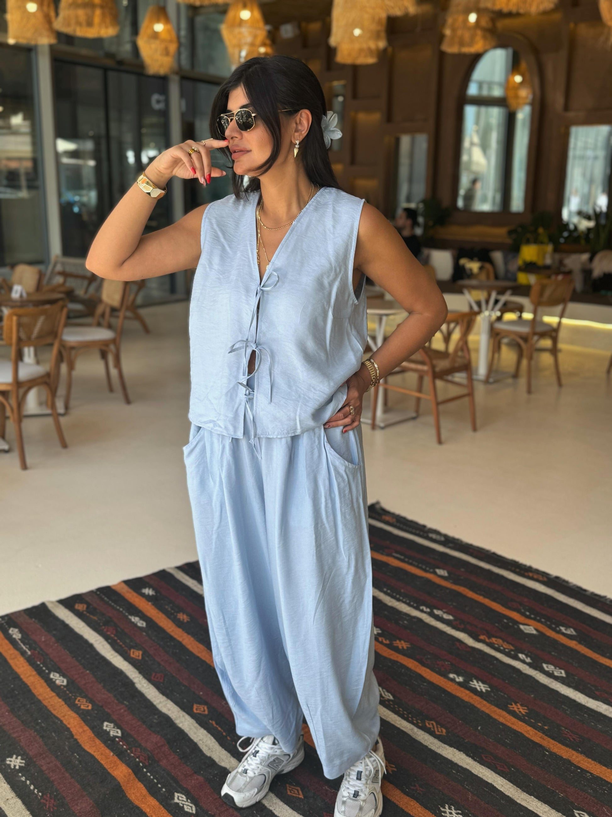 ✔️ Bağlama detaylı üst ve bol paça pantolon ile özgür bir duruş